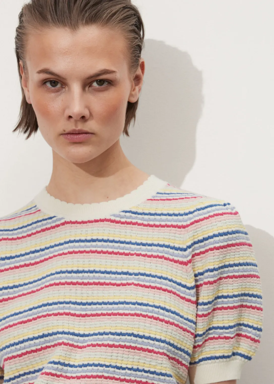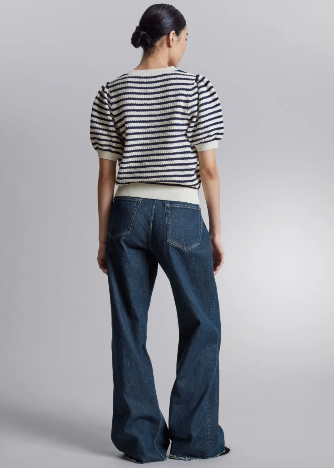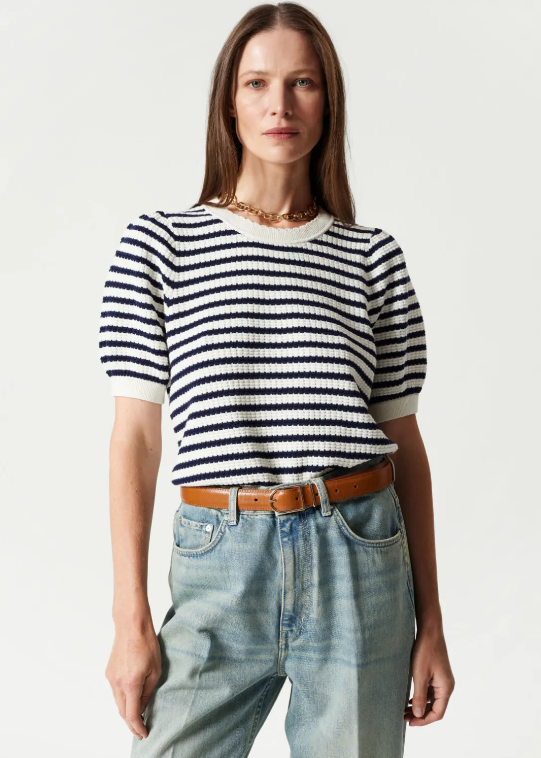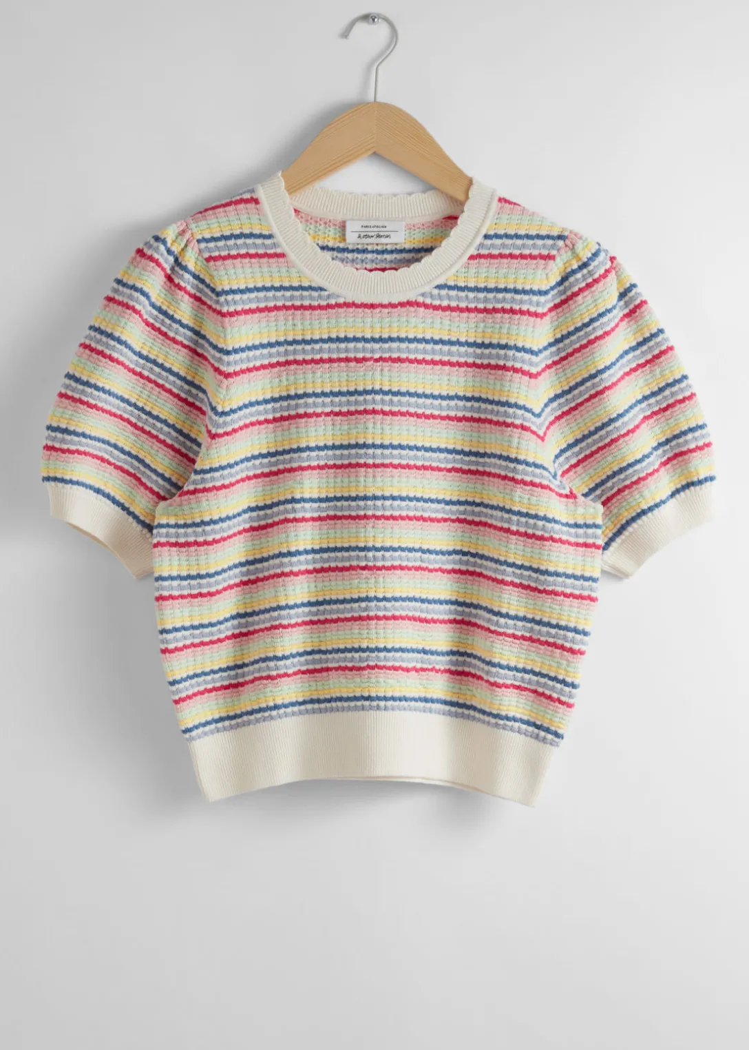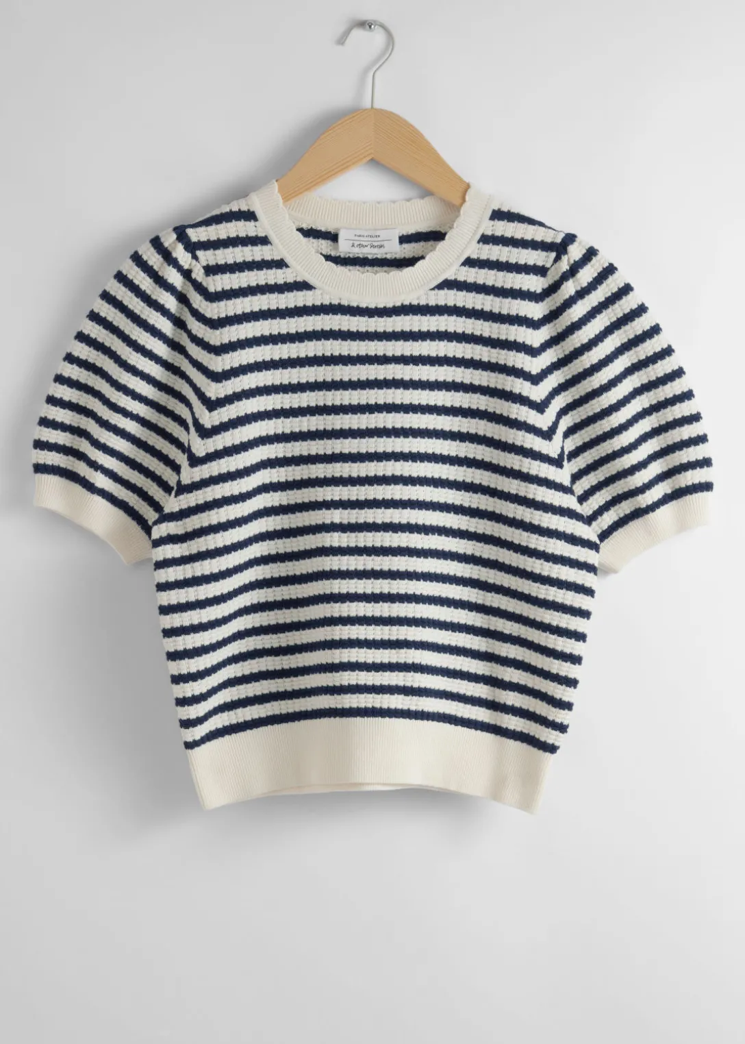 Haut en maille, avec des manches ballon et une encolure festonnée.