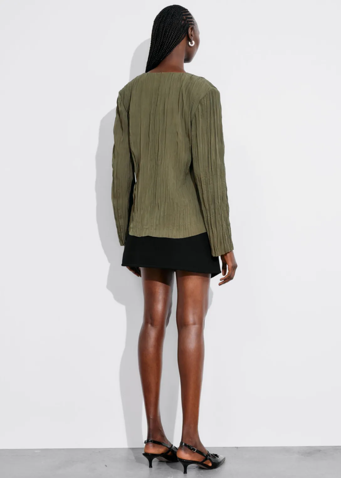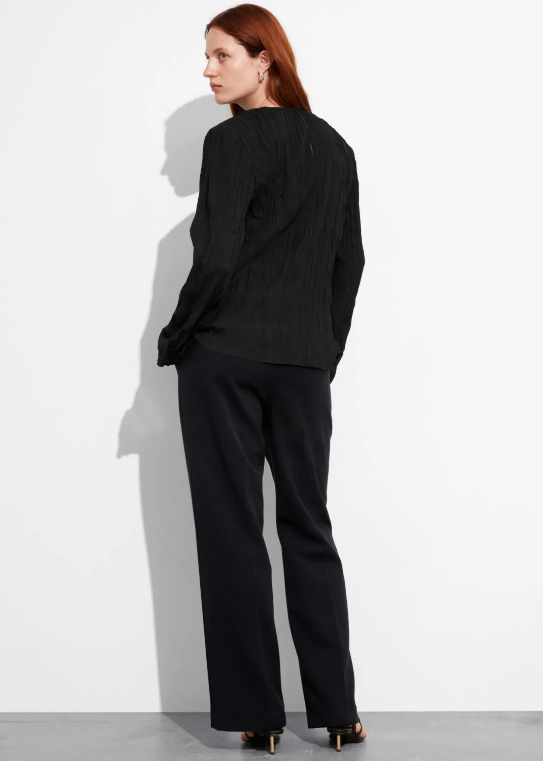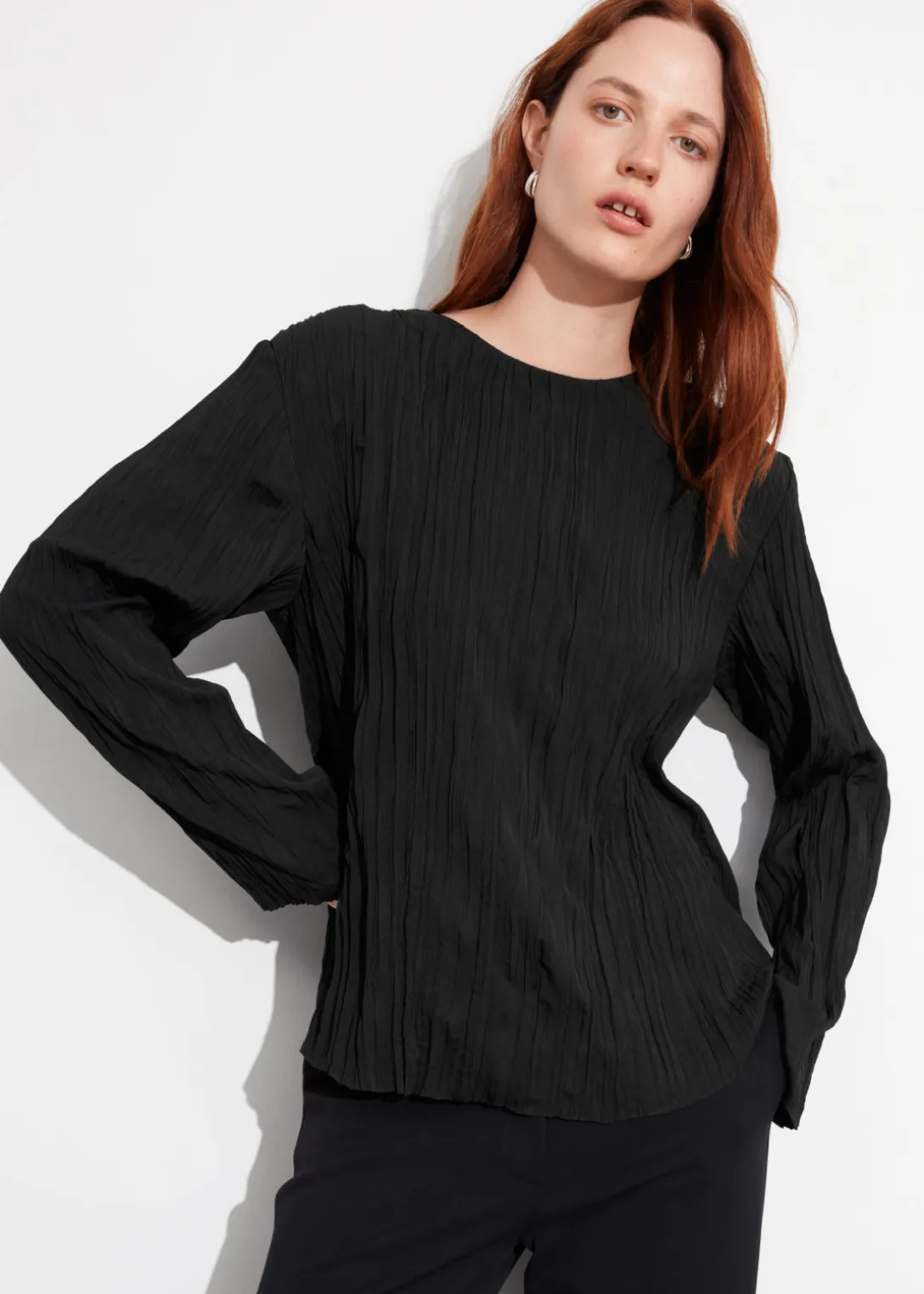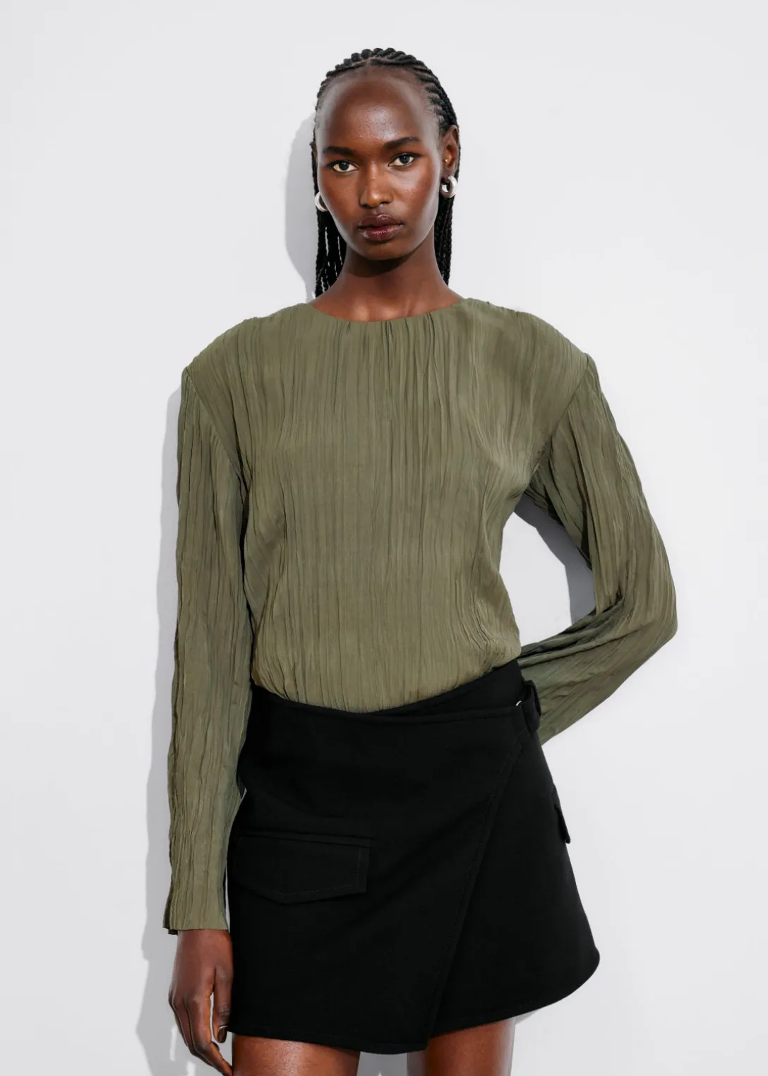 Haut à finition froissée, avec des manches longues à épaulettes.