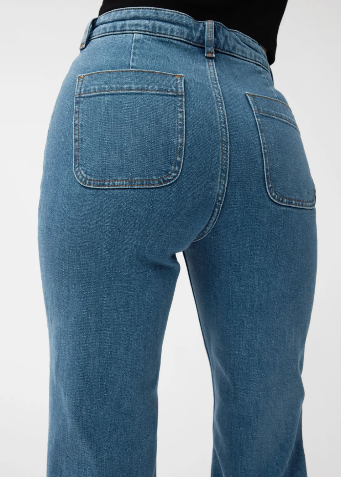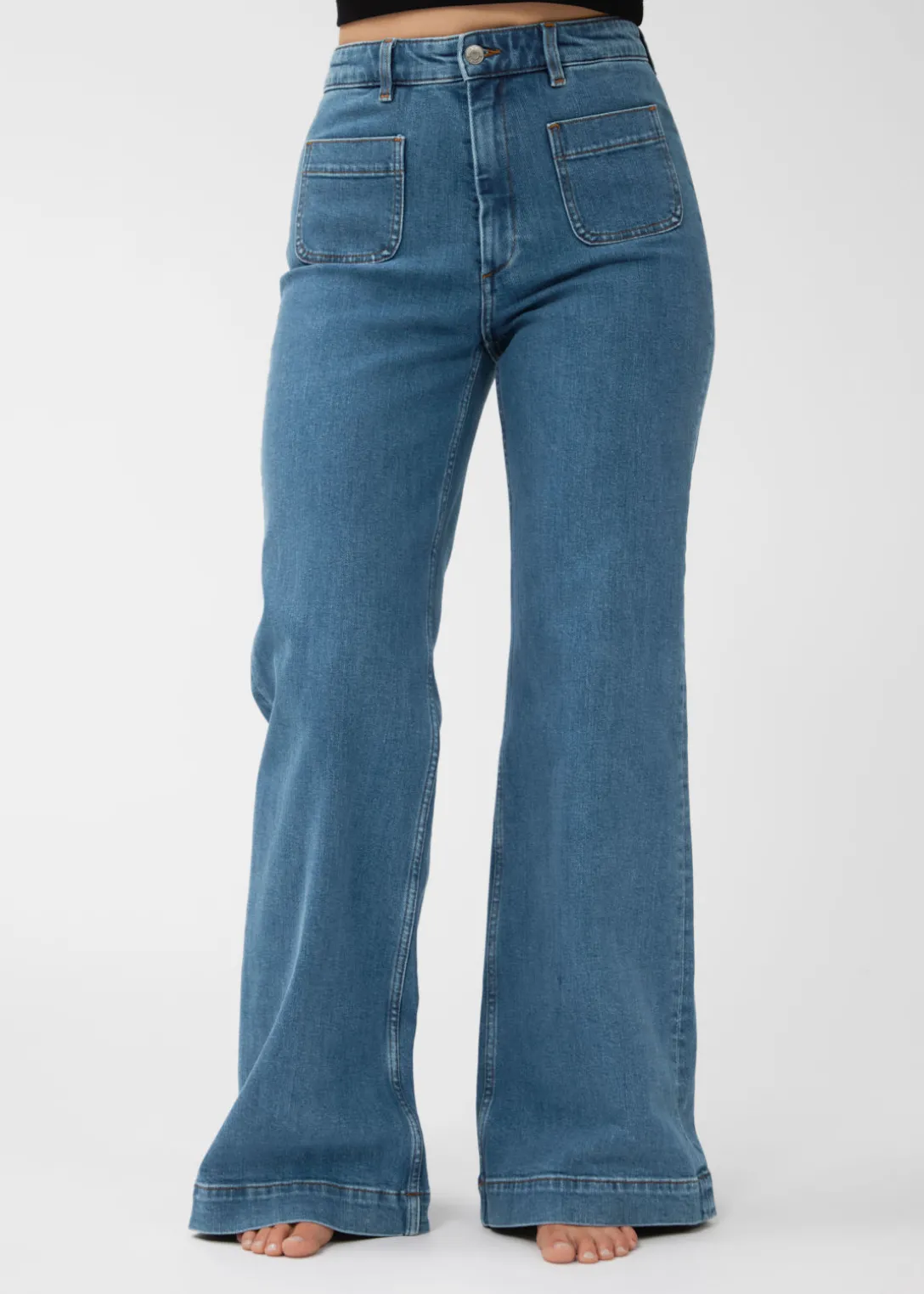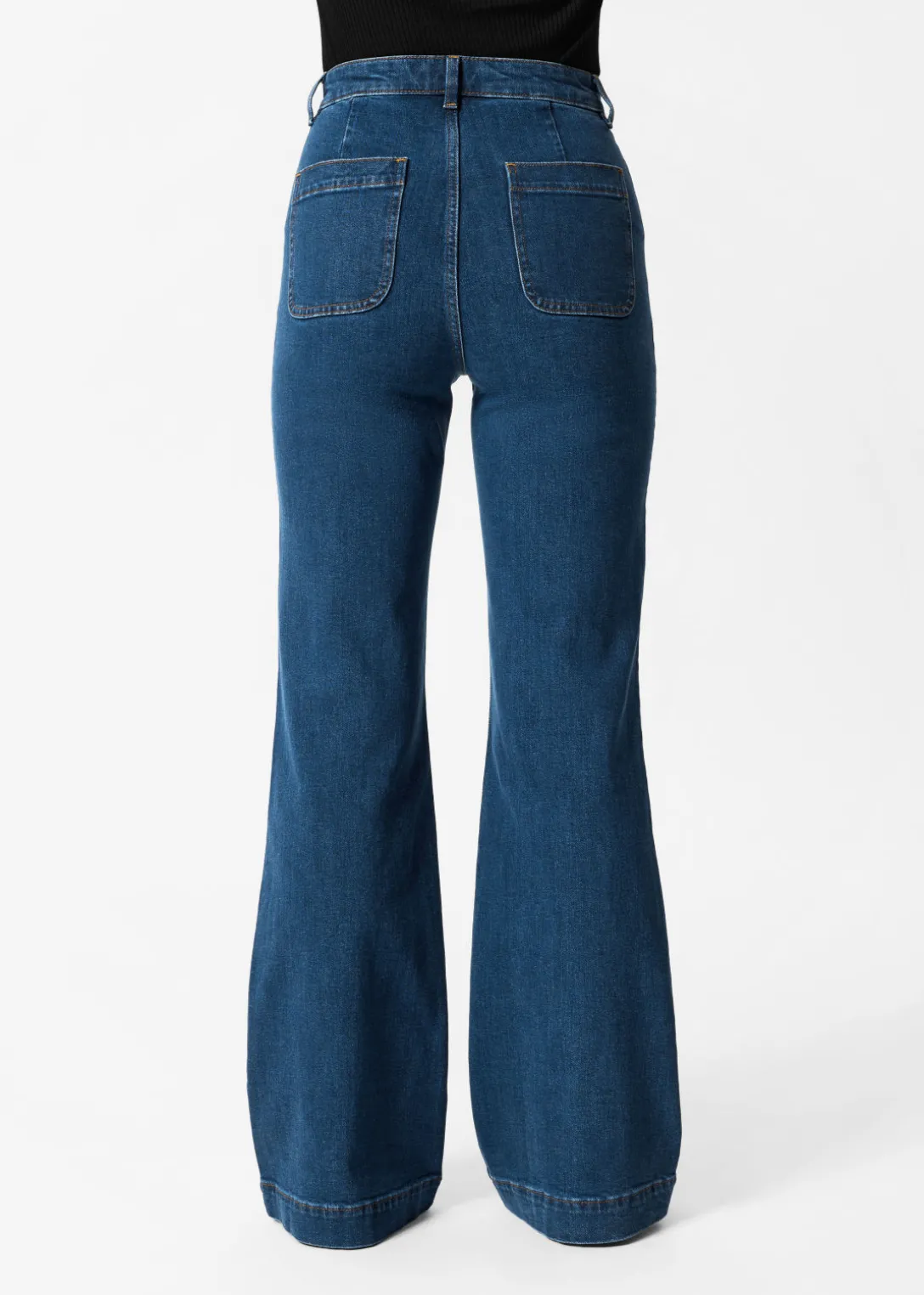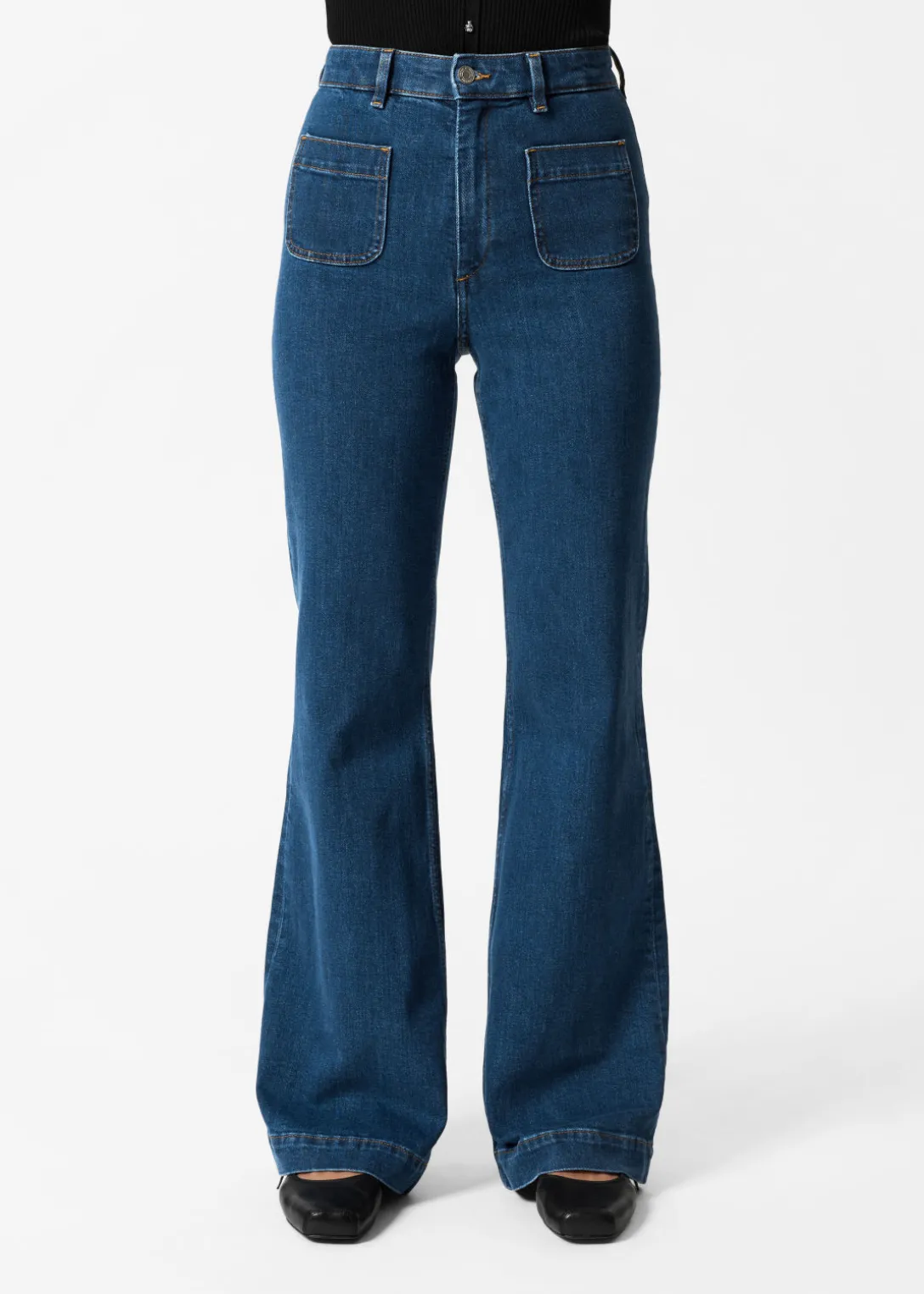 Jean taille haute à la silhouette évasée, agrémenté de deux poches plaquées à l’avant et à l’arrière.