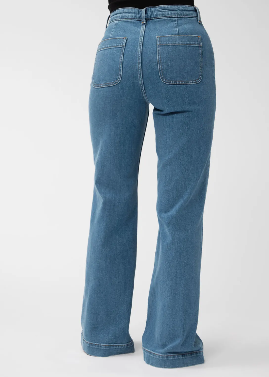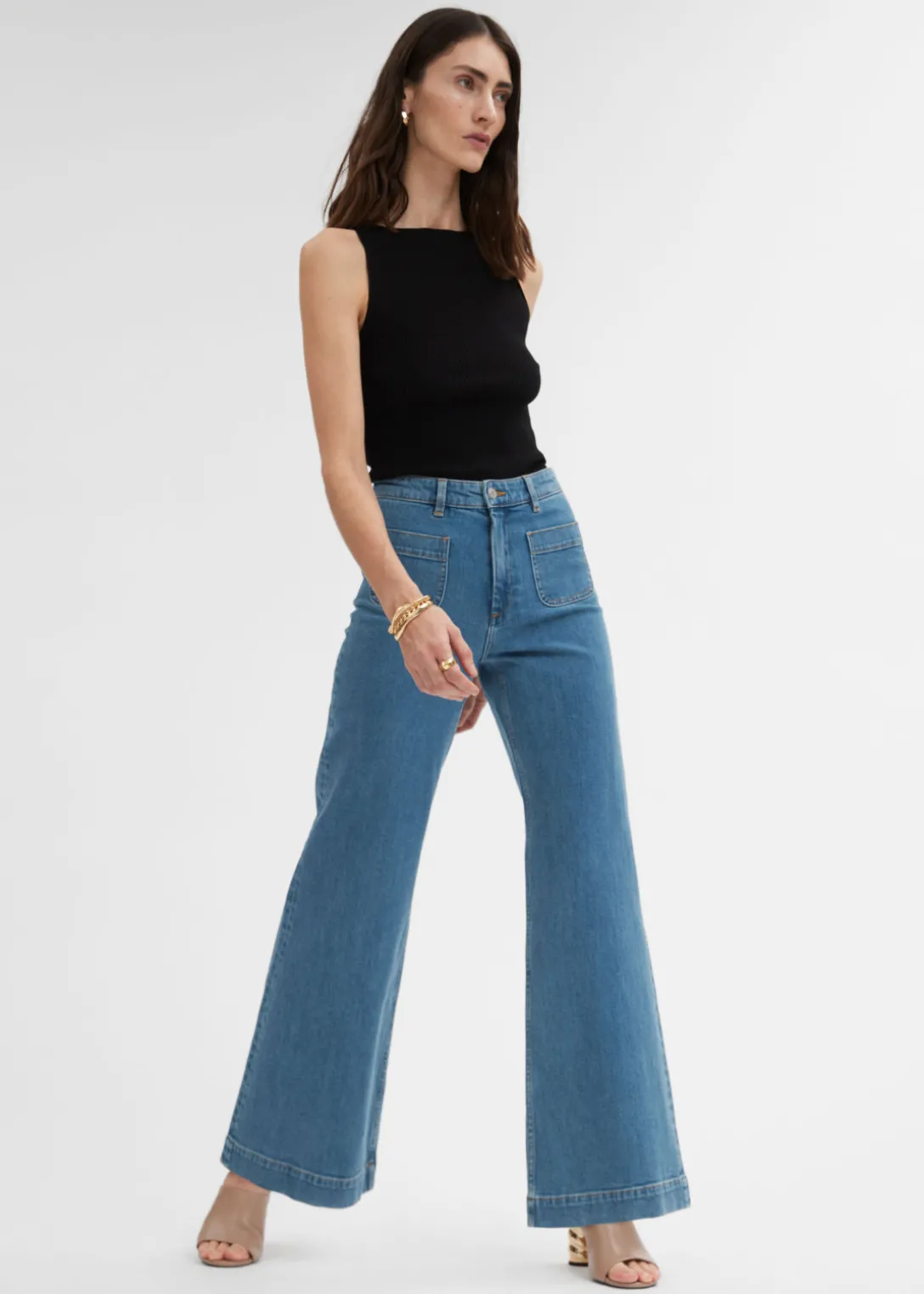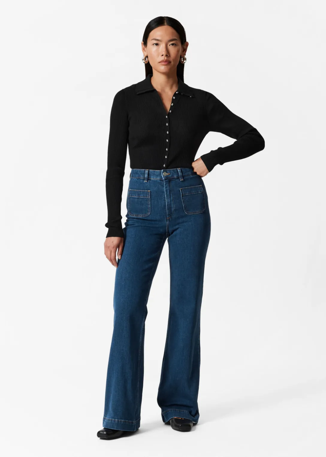 Jean taille haute à la silhouette évasée, agrémenté de deux poches plaquées à l’avant et à l’arrière.