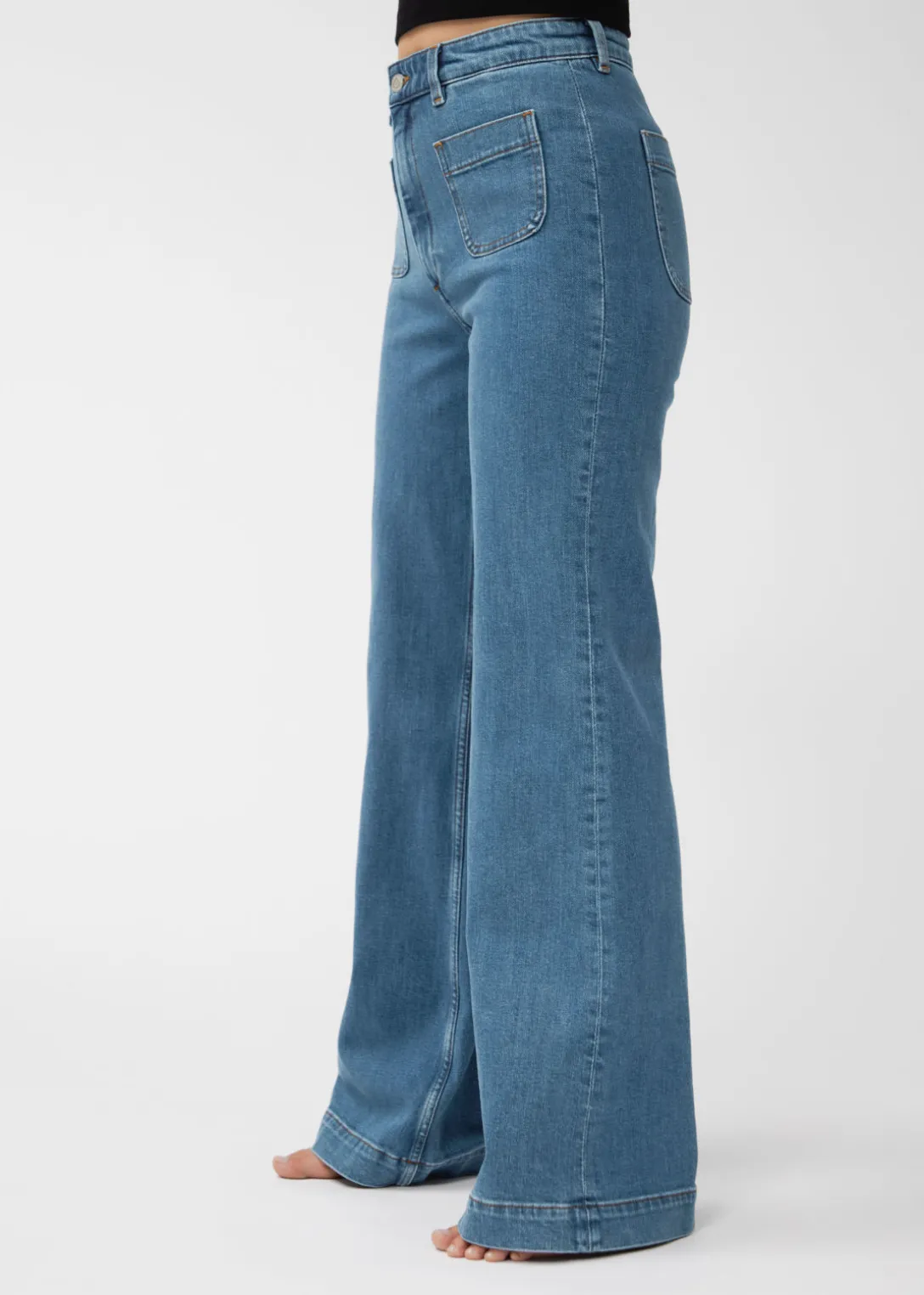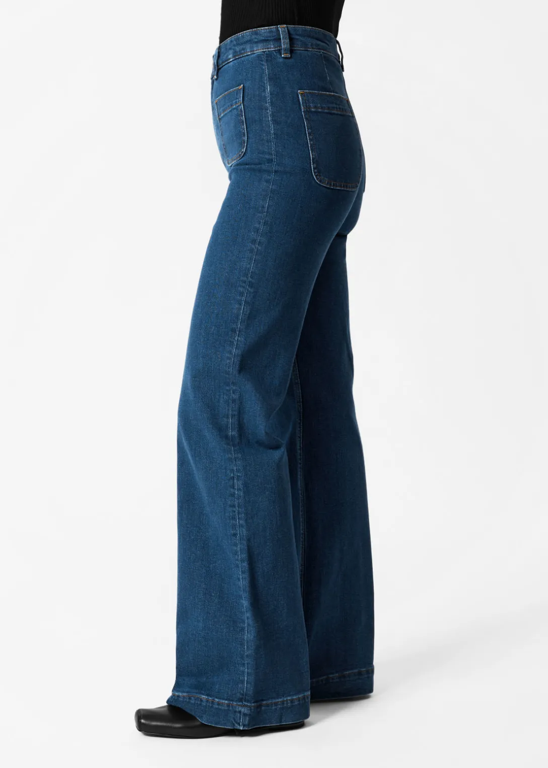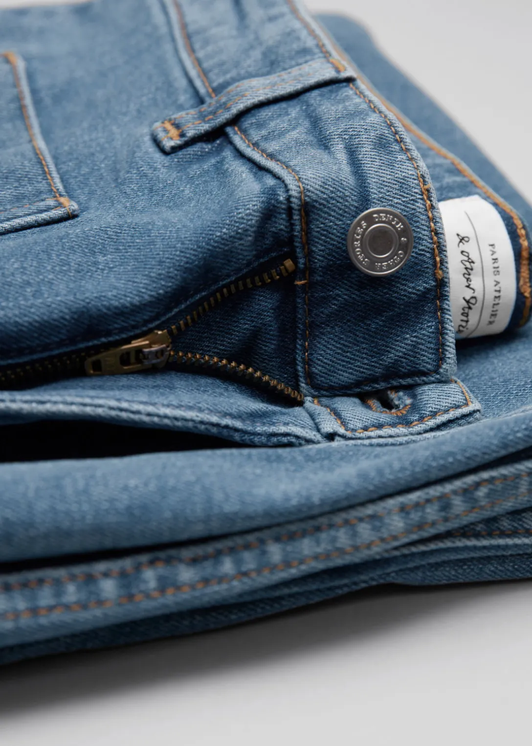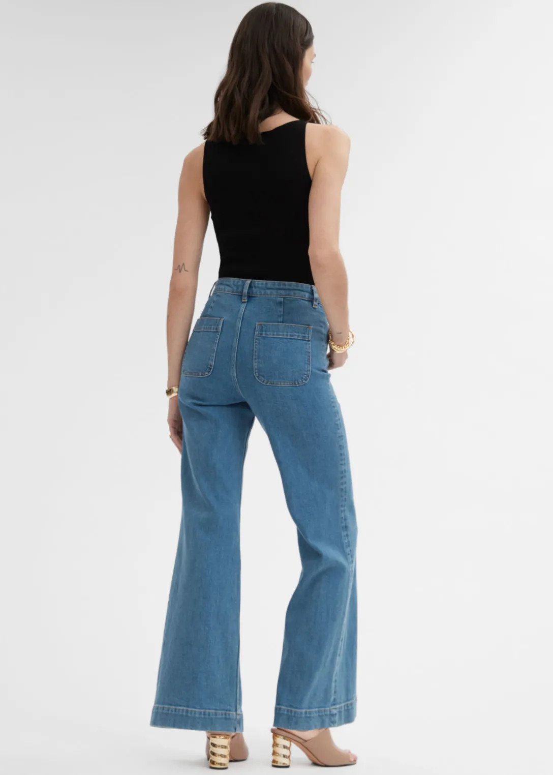 Jean taille haute à la silhouette évasée, agrémenté de deux poches plaquées à l’avant et à l’arrière.