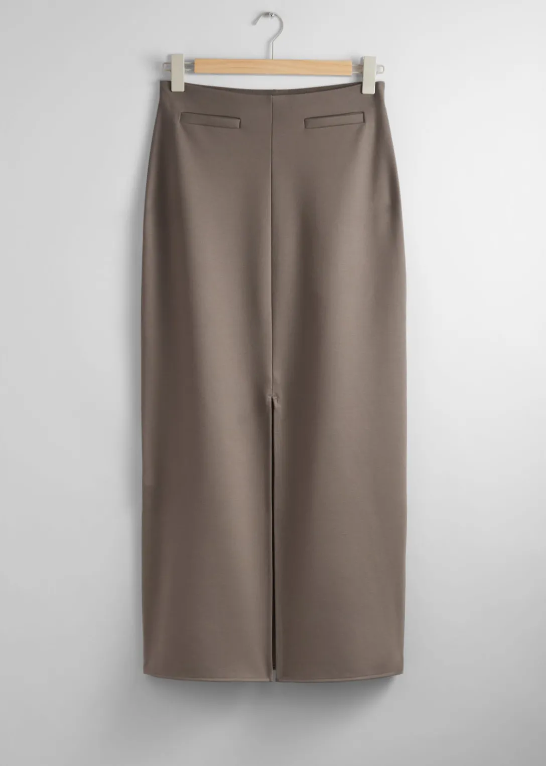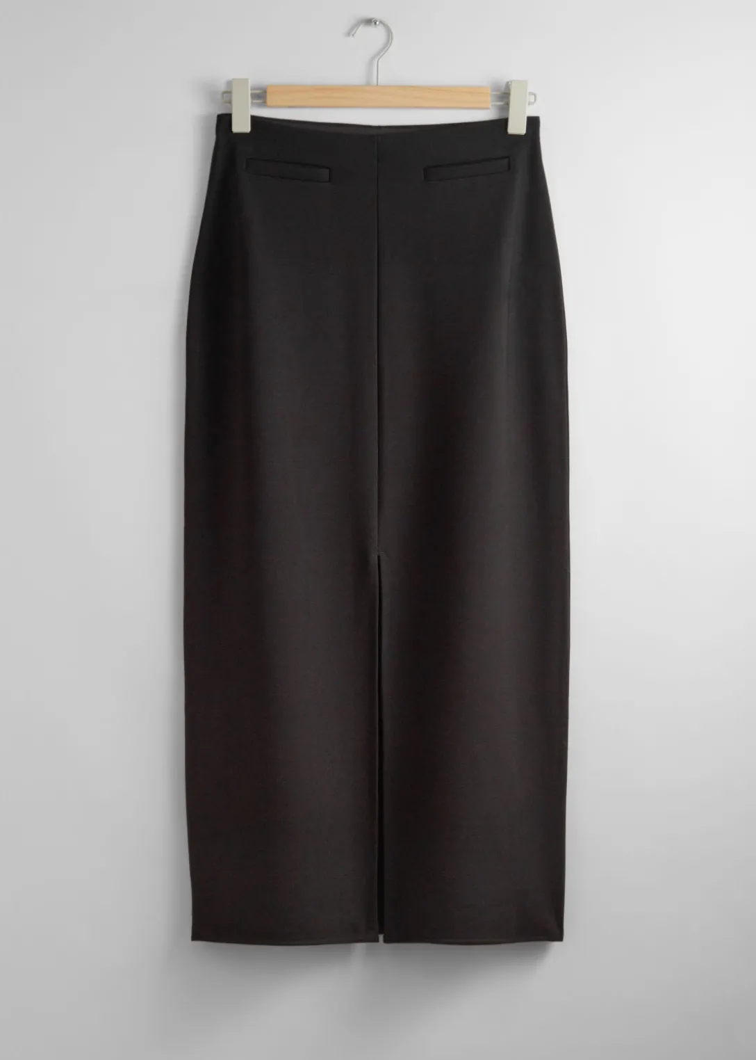 Jupe crayon longue, avec deux poches passepoilées et une fente avant.