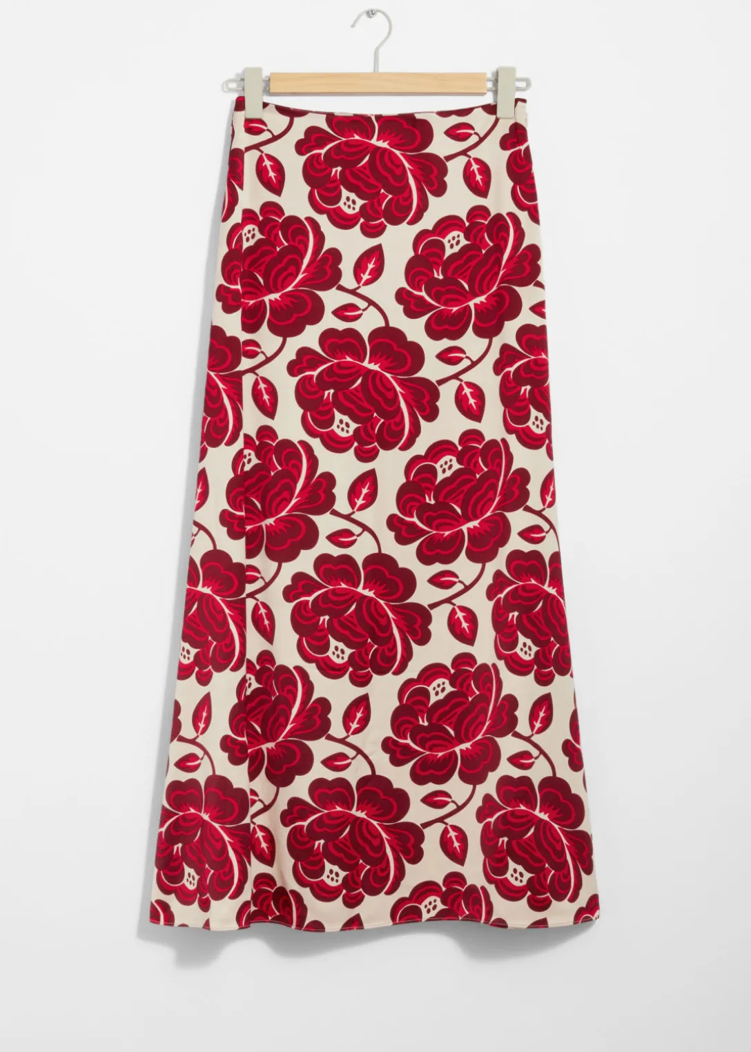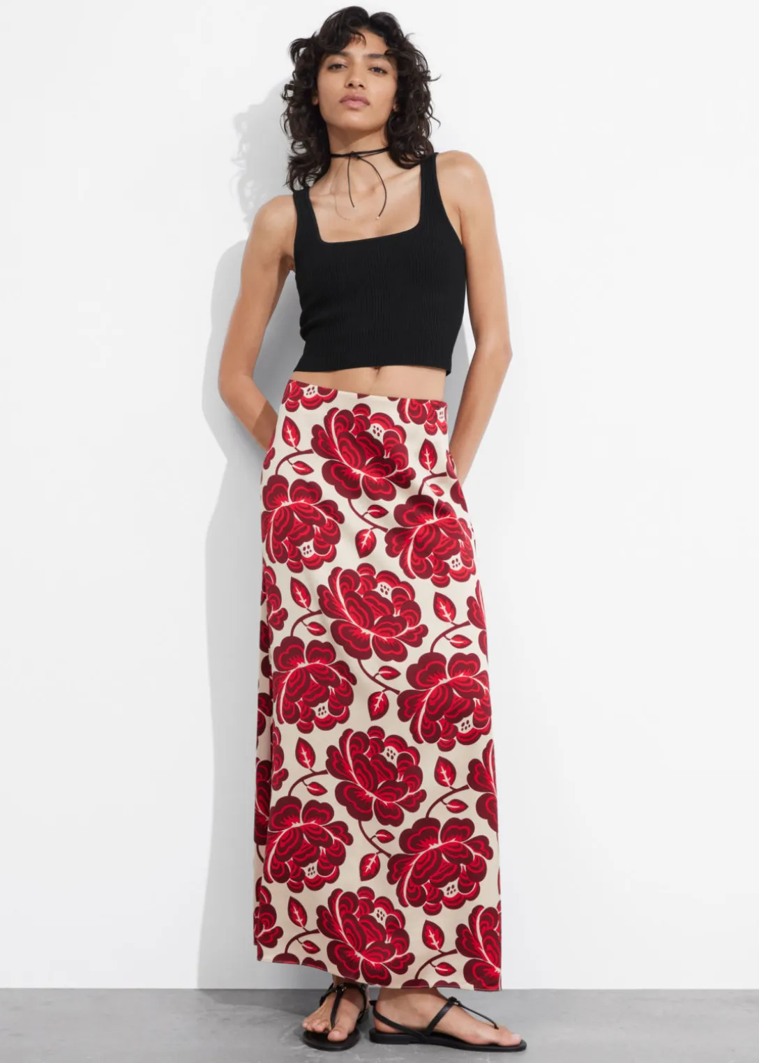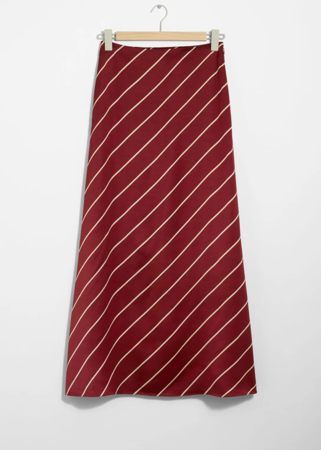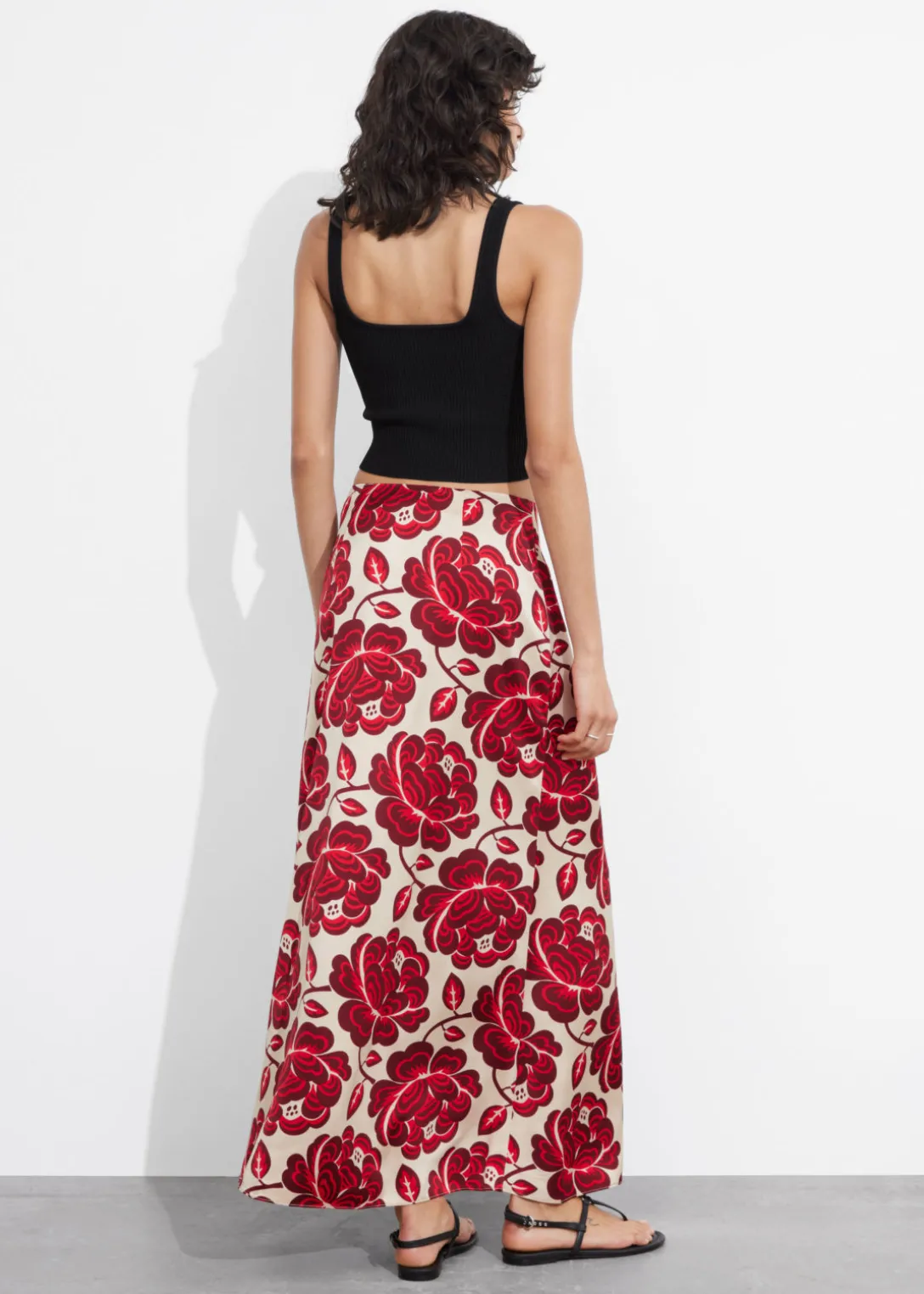 Jupe trapèze longue taille haute en satin. Dotée d’une fermeture zippée sur le côté.