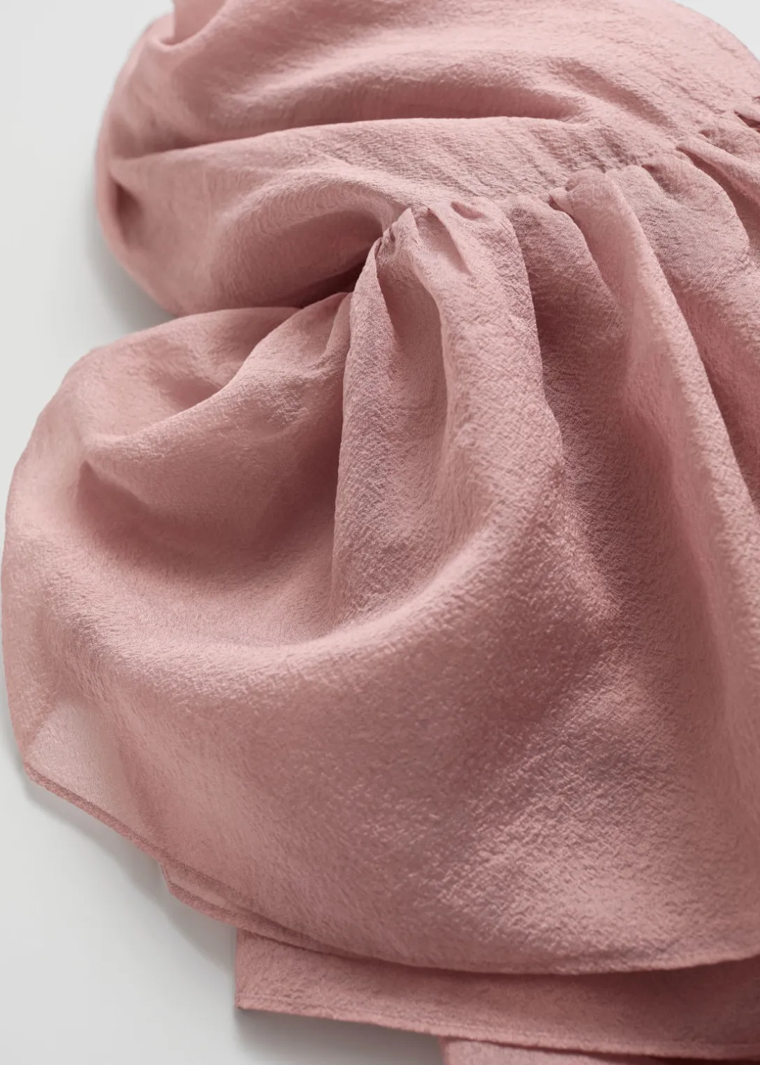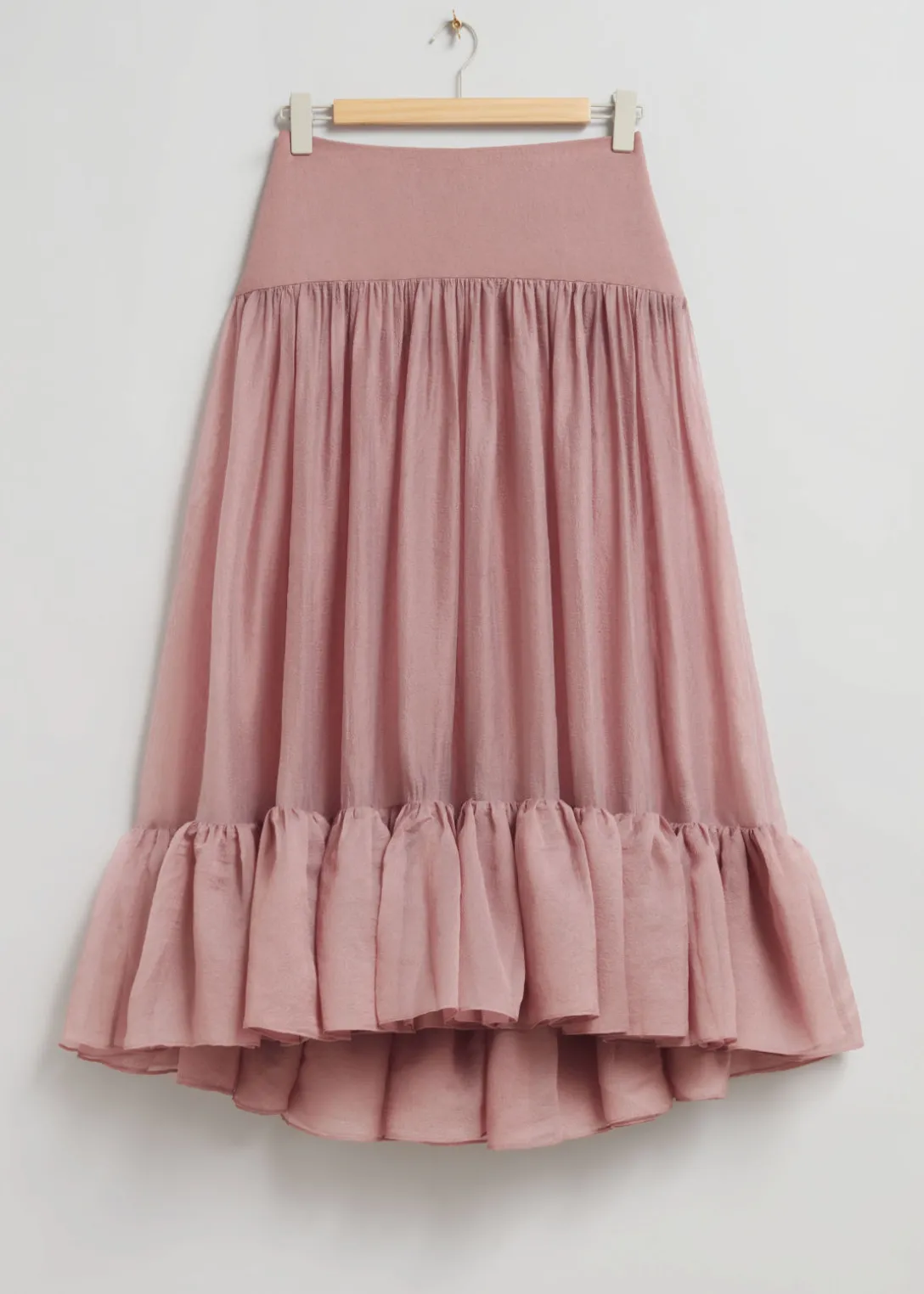 Jupe longue et ample, avec une silhouette trapèze à superpositions et une finition transparente.