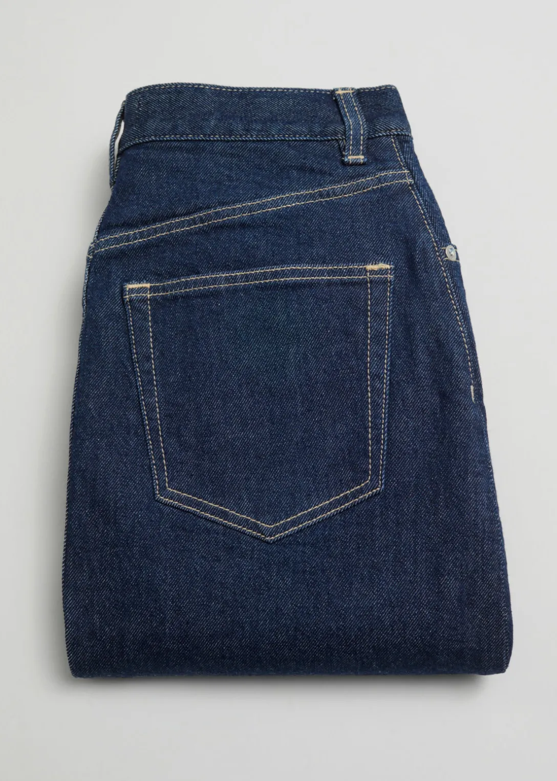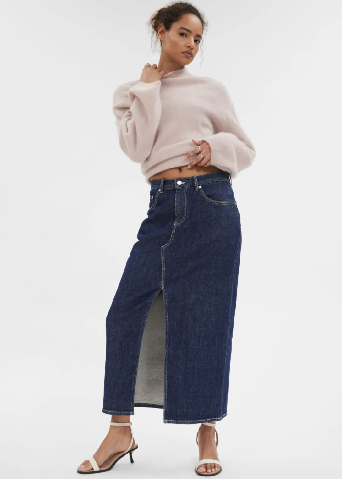 Cette jupe midi en denim possède une taille haute, une fente centrale à l’avant et une coupe classique de 5 poches.