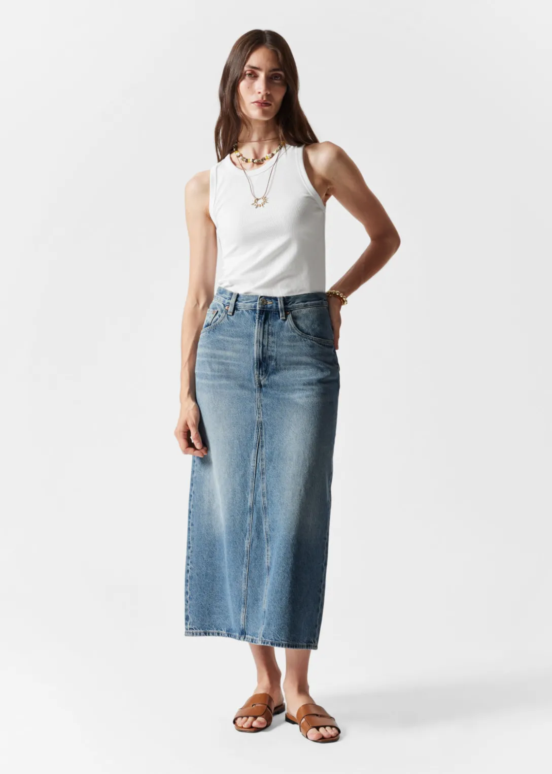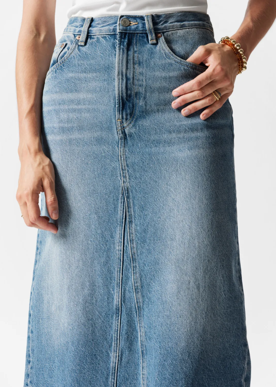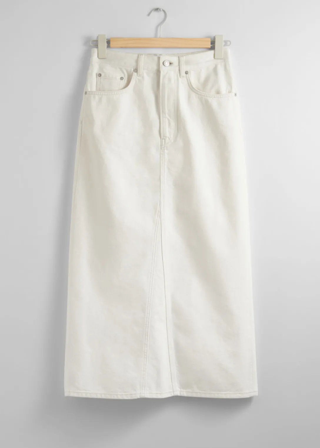 Jupe midi en jean avec 5 poches et une fente centrale à l’arrière.