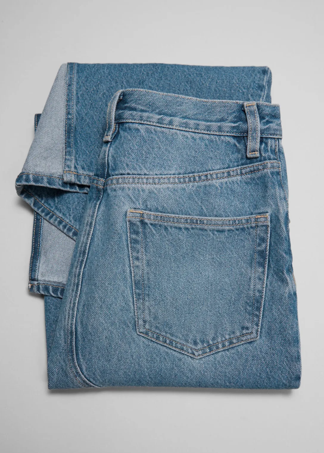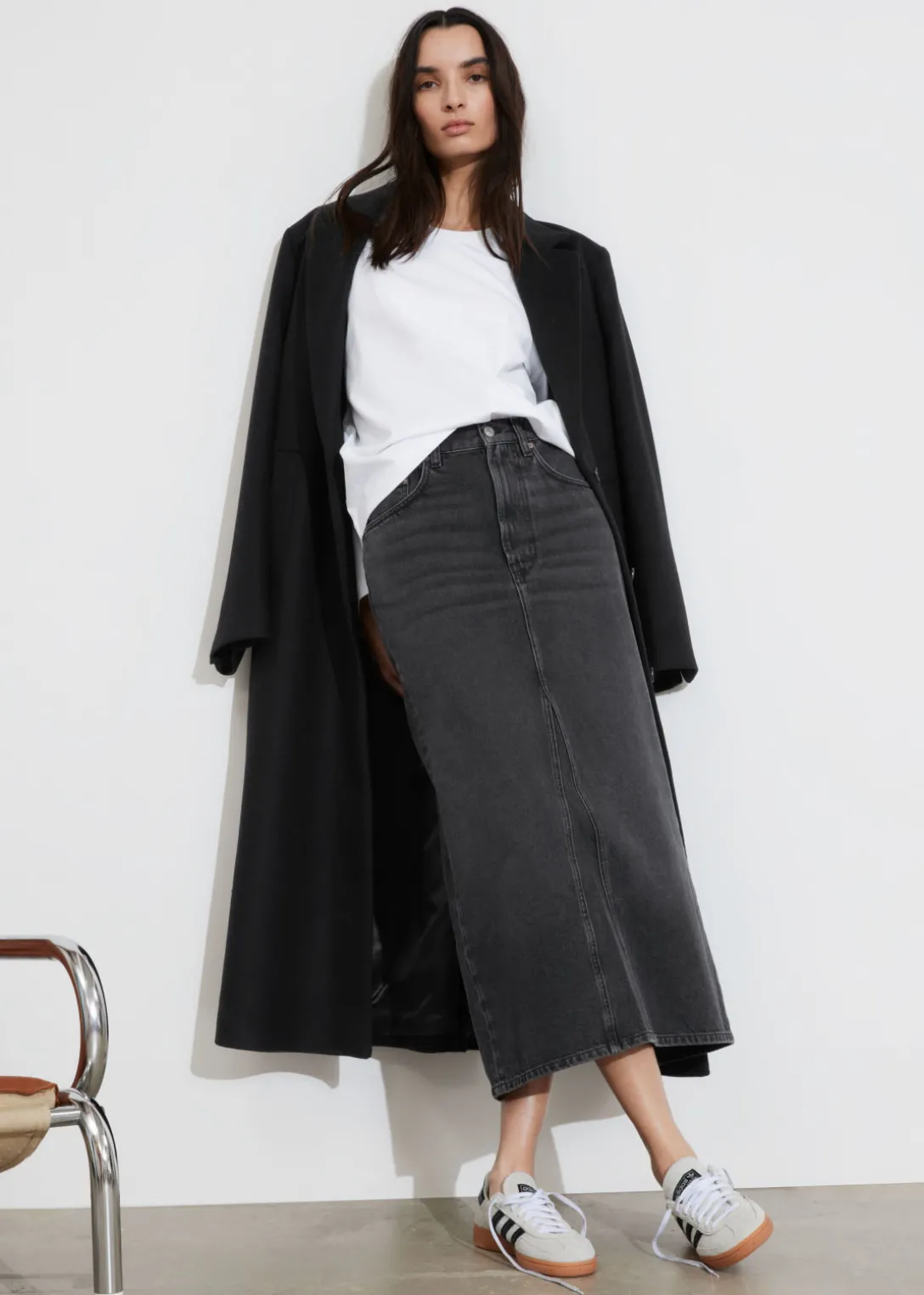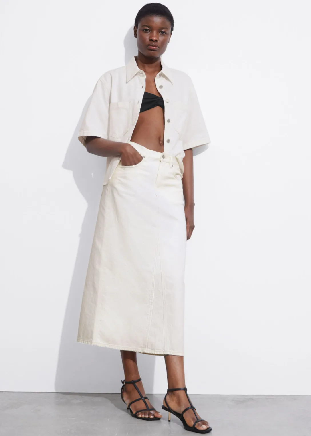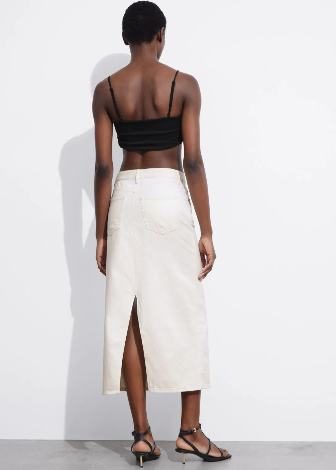 Jupe midi en jean avec 5 poches et une fente centrale à l’arrière.