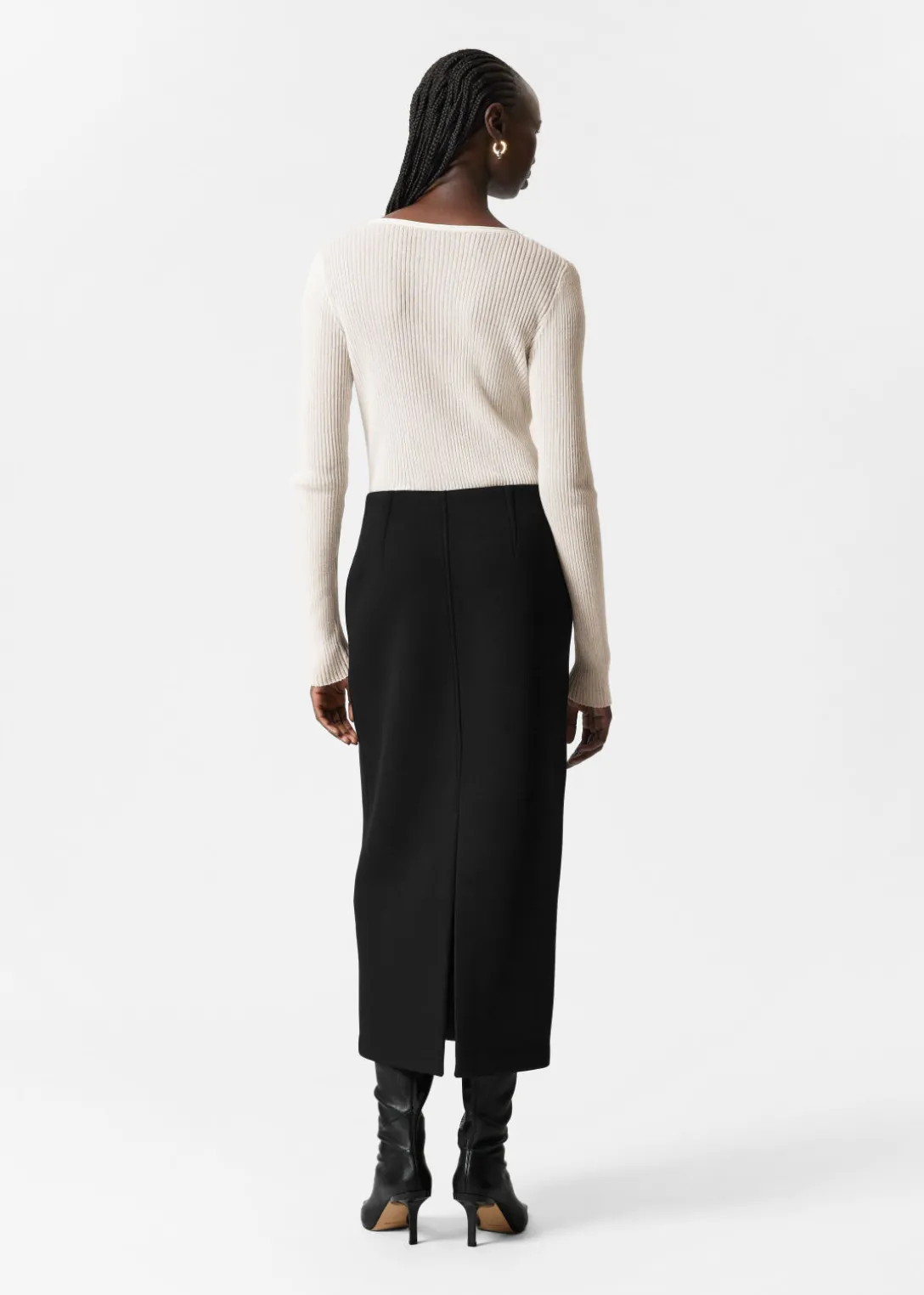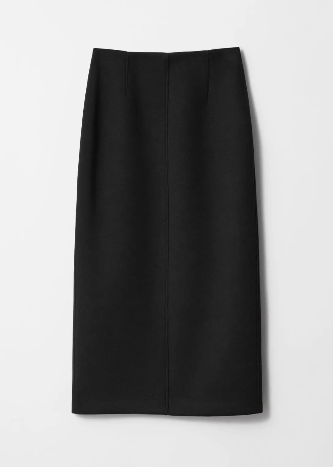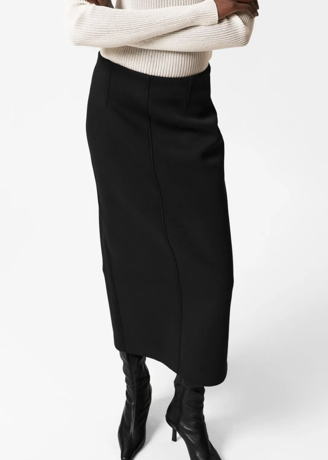 Jupe crayon midi à la finition en néoprène. Dotée d’une taille haute élastique et d’une fente centrale à l’arrière.