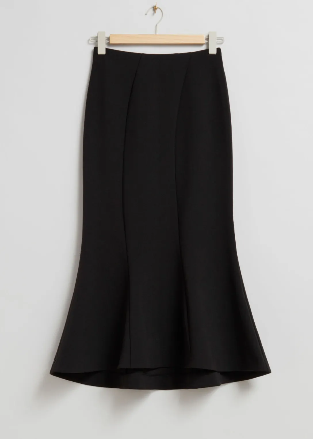 Jupe midi avec des découpes verticales et un ourlet évasé. Dotée d’une fermeture zippée latérale.