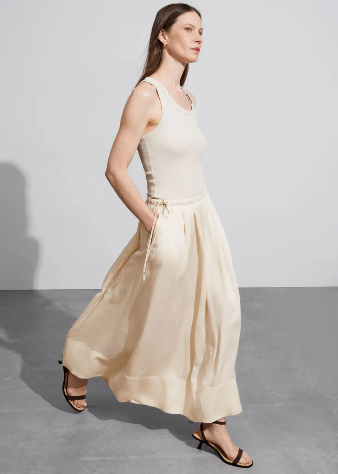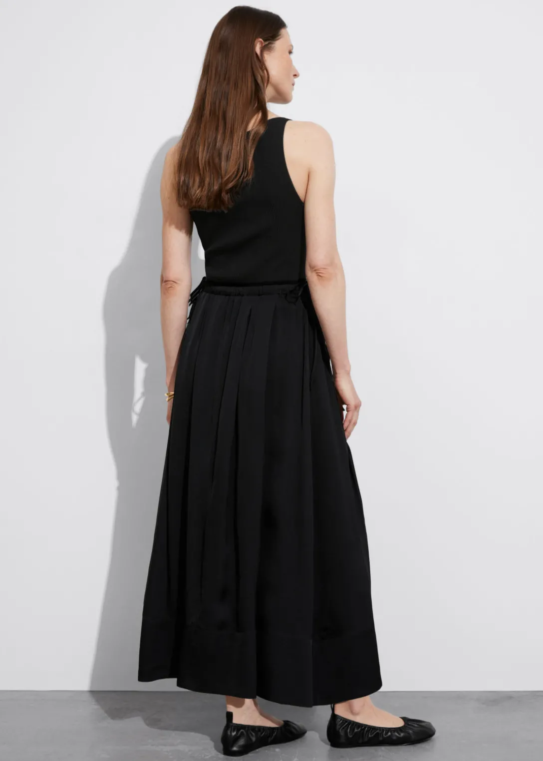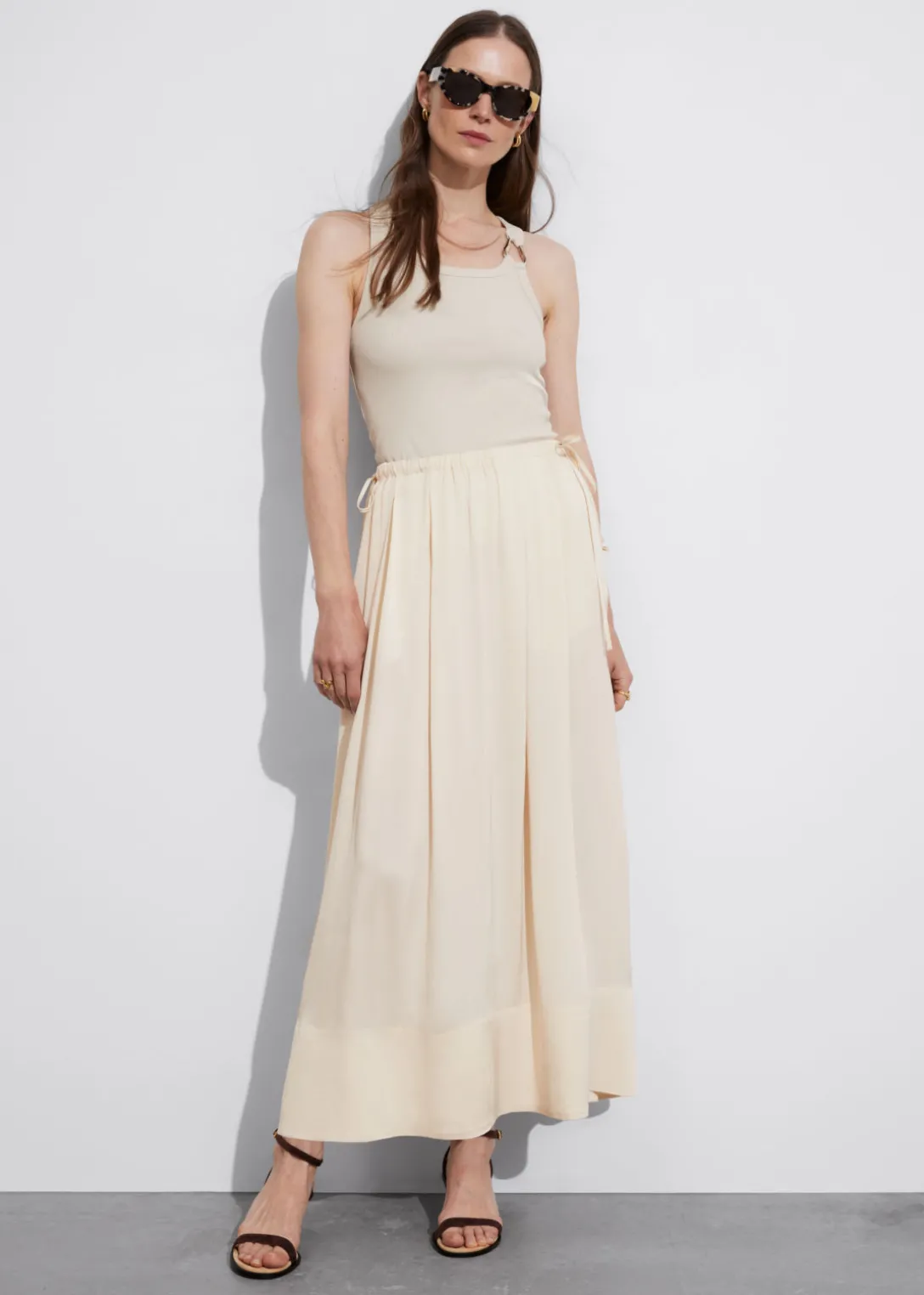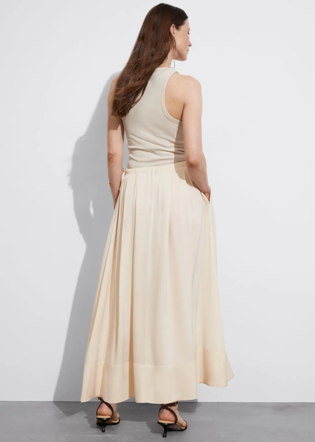 Jupe midi trapèze avec finition plissée et cordon de serrage à la taille.