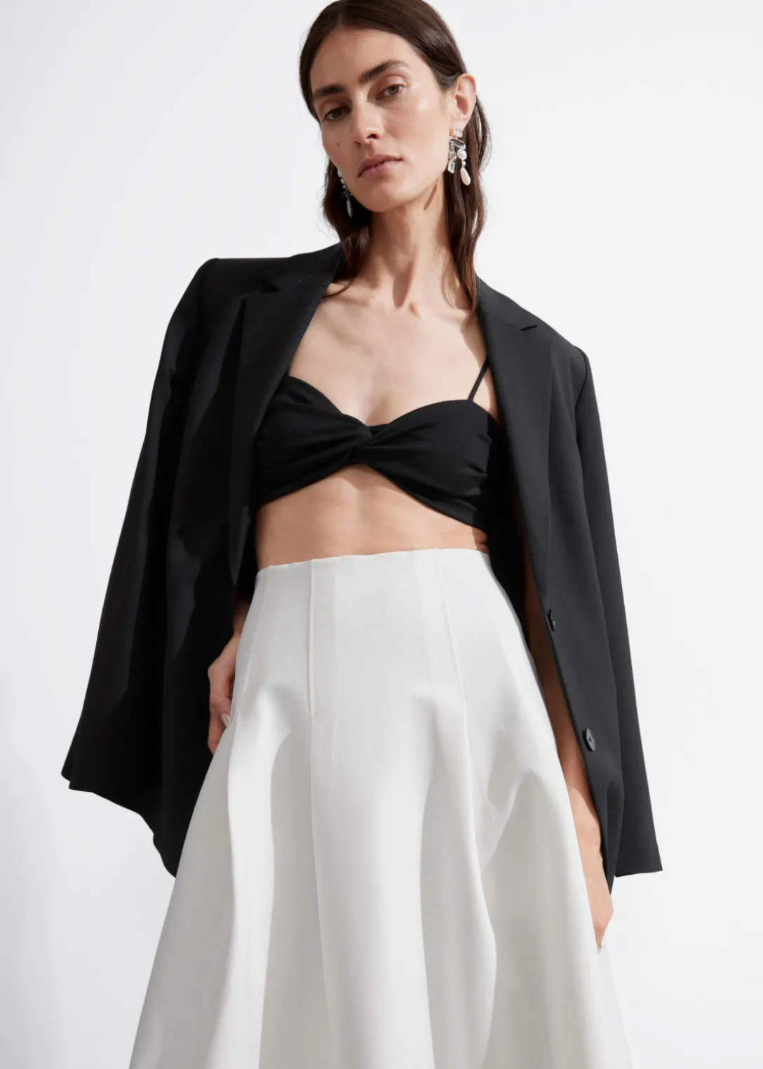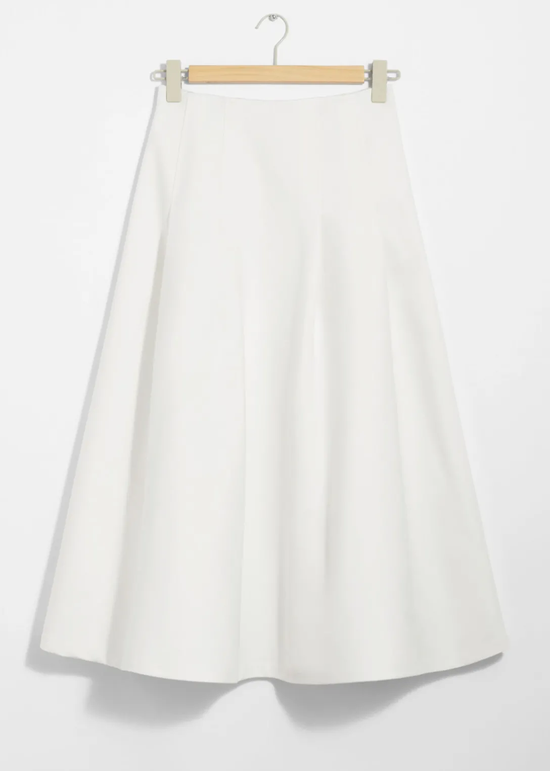 Jupe midi trapèze avec une silhouette légèrement plissée. Dotée d’une taille élastiquée.