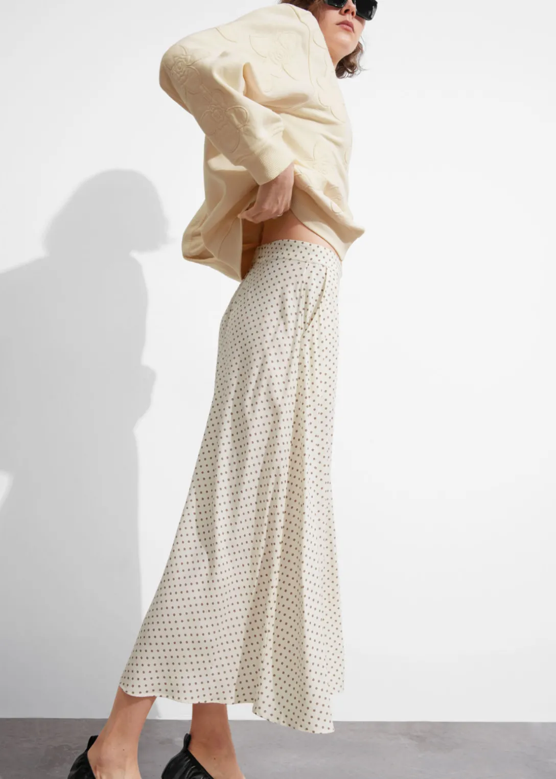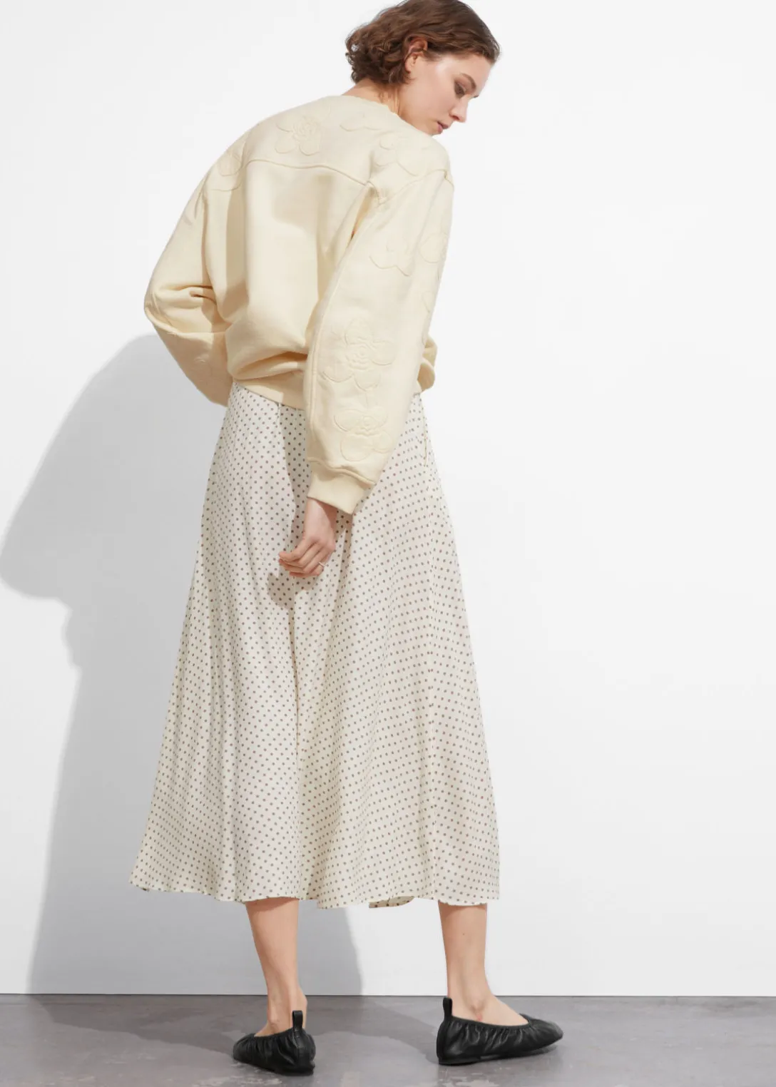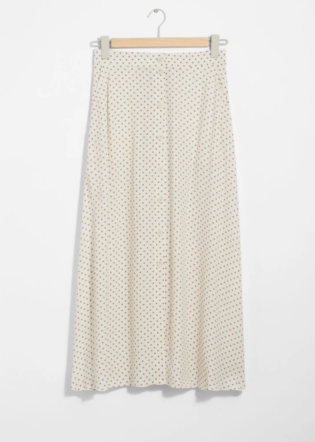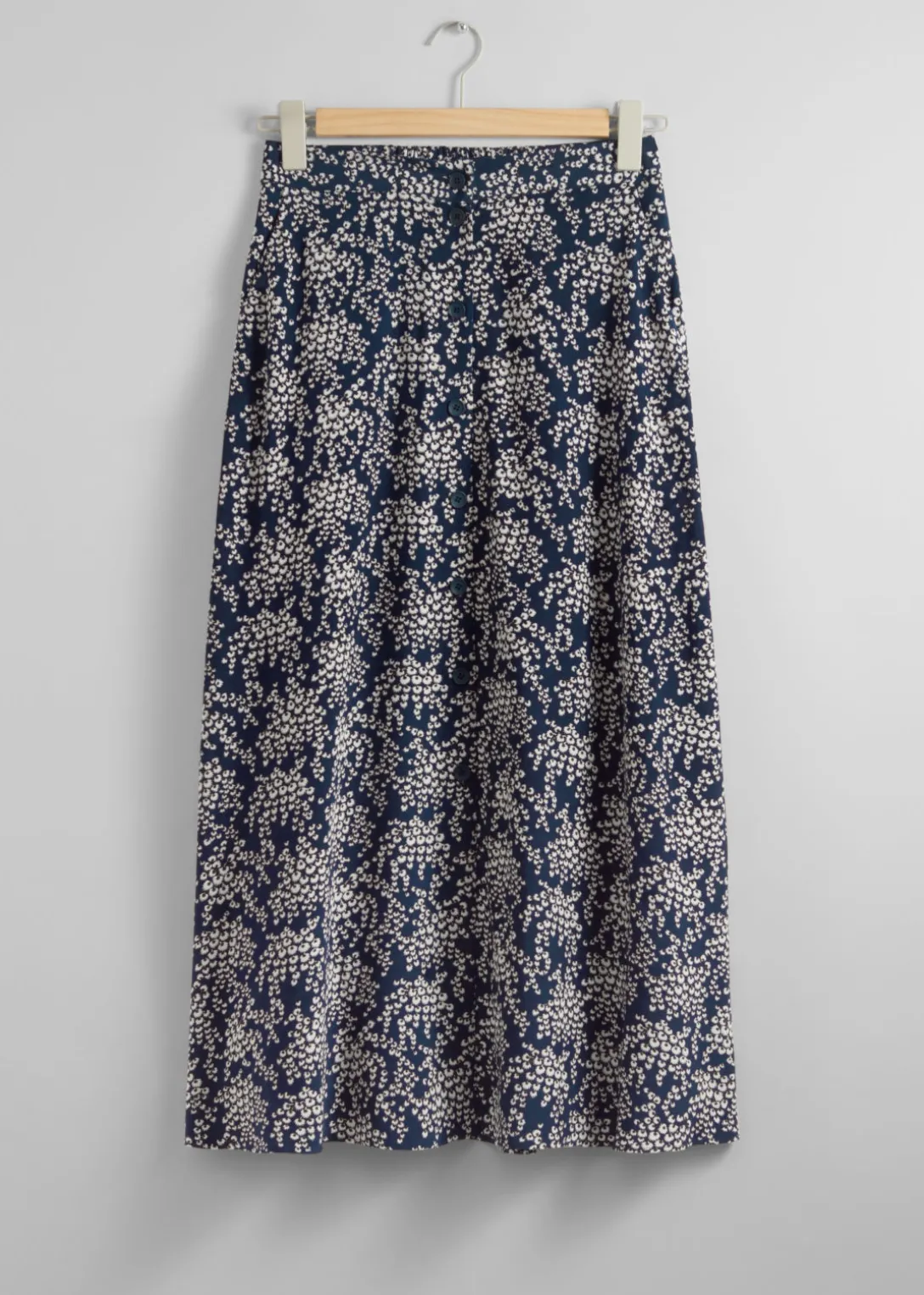 Jupe midi trapèze à taille haute, avec une fermeture boutonnée à l’avant et une taille élastique.
