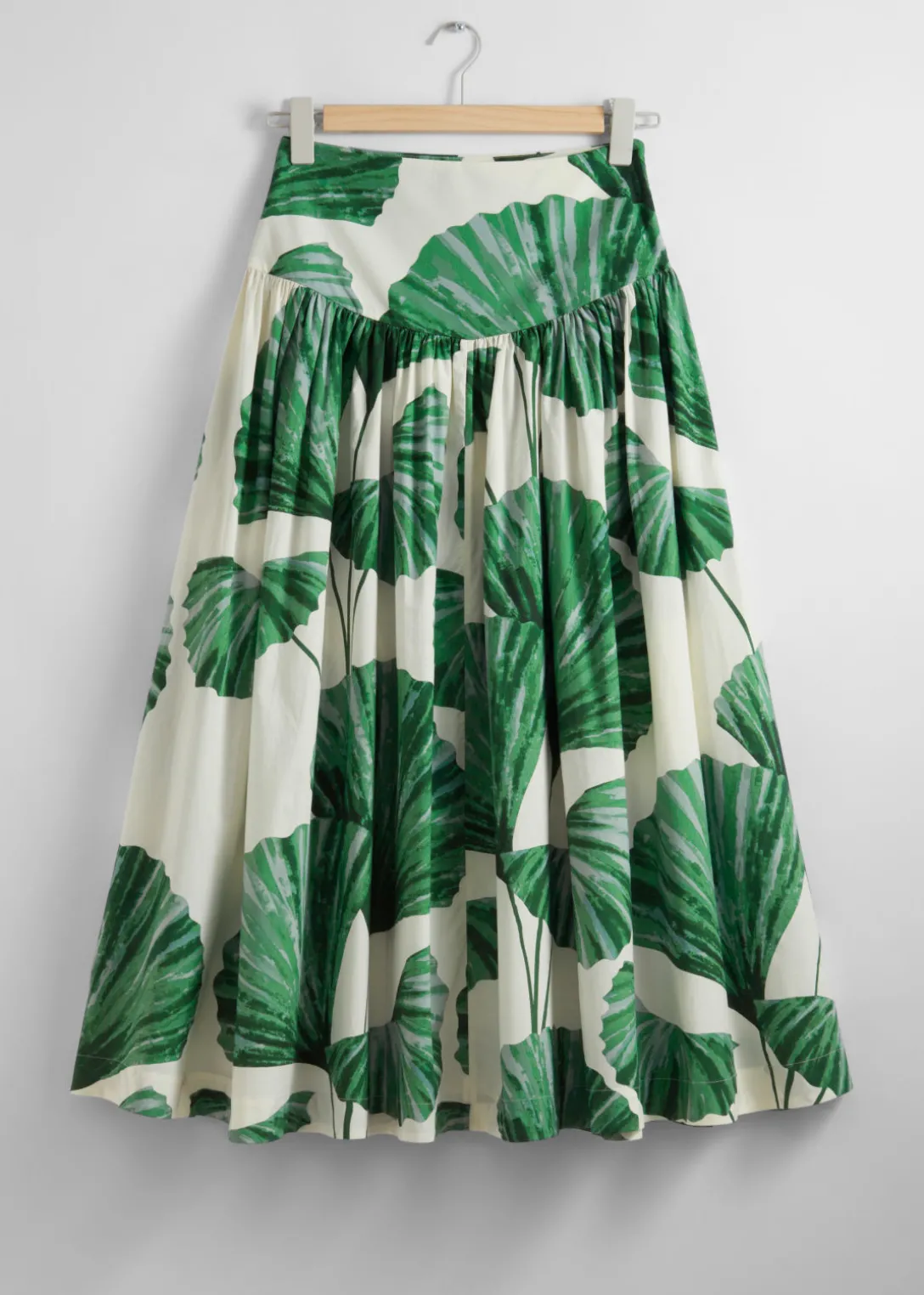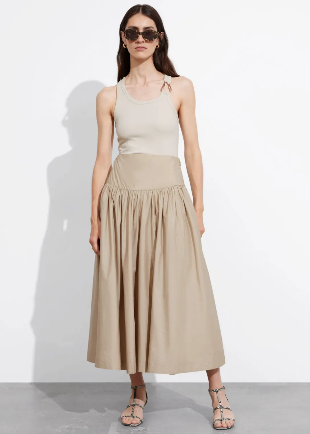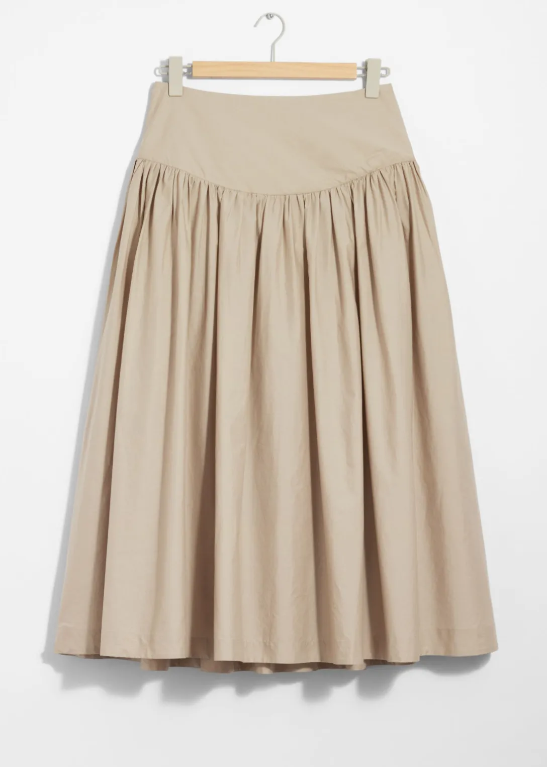Jupe midi trapèze avec une silhouette légèrement plissée et une fermeture zippée sur le côté.