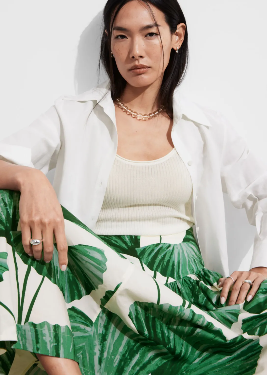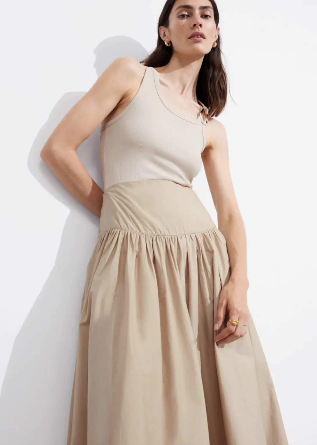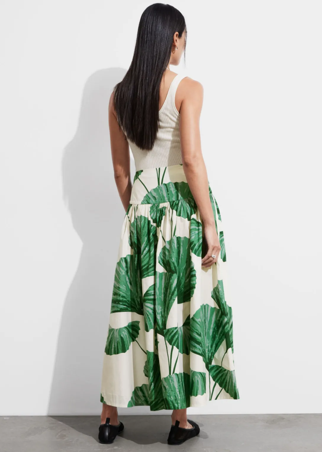 Jupe midi trapèze avec une silhouette légèrement plissée et une fermeture zippée sur le côté.