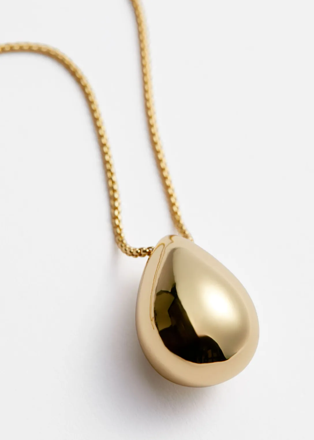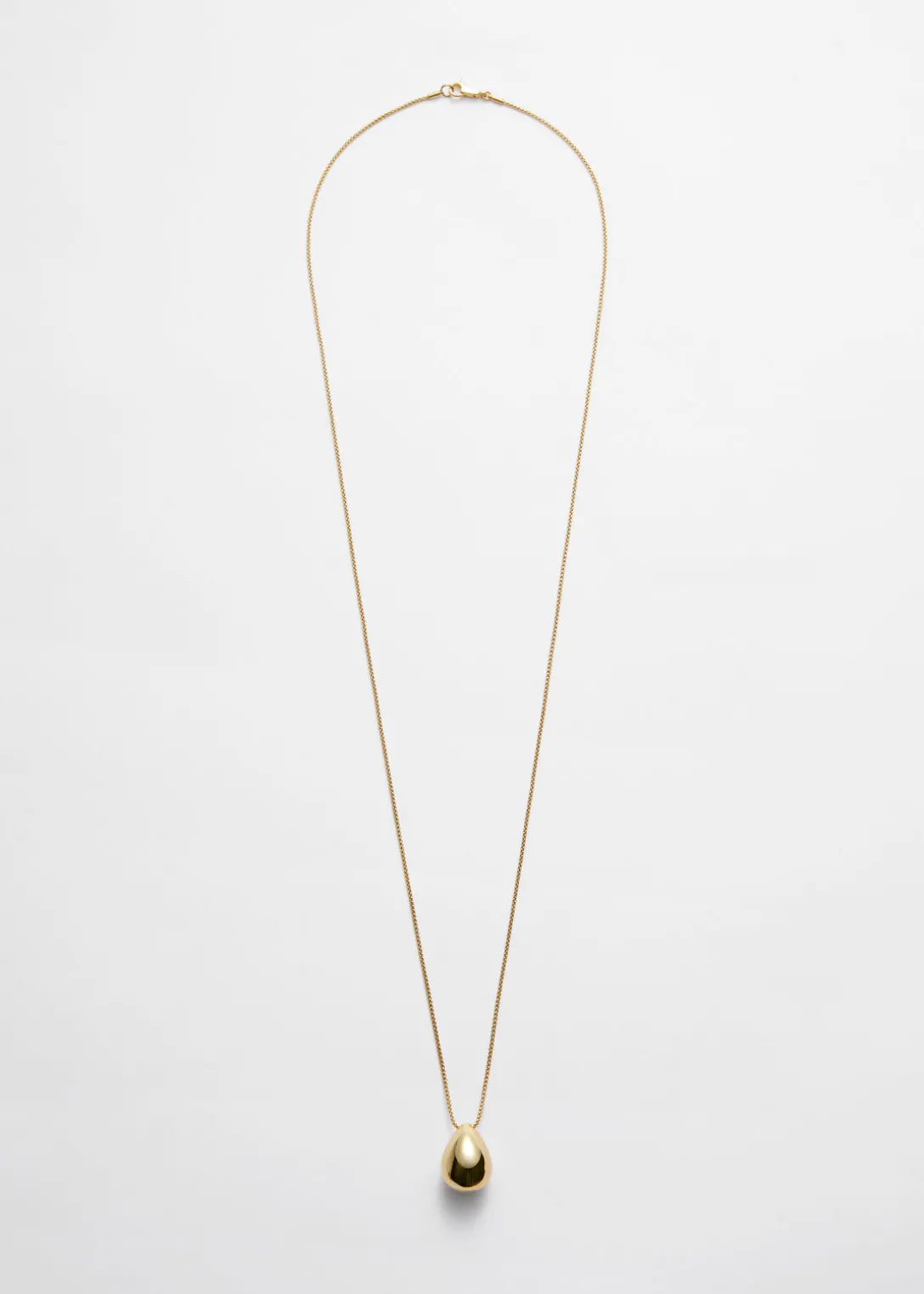 Ce long collier en chaîne présente un style minimaliste. Confectionnée en laiton, cette pièce est ornée d’un pendentif poli plaqué.