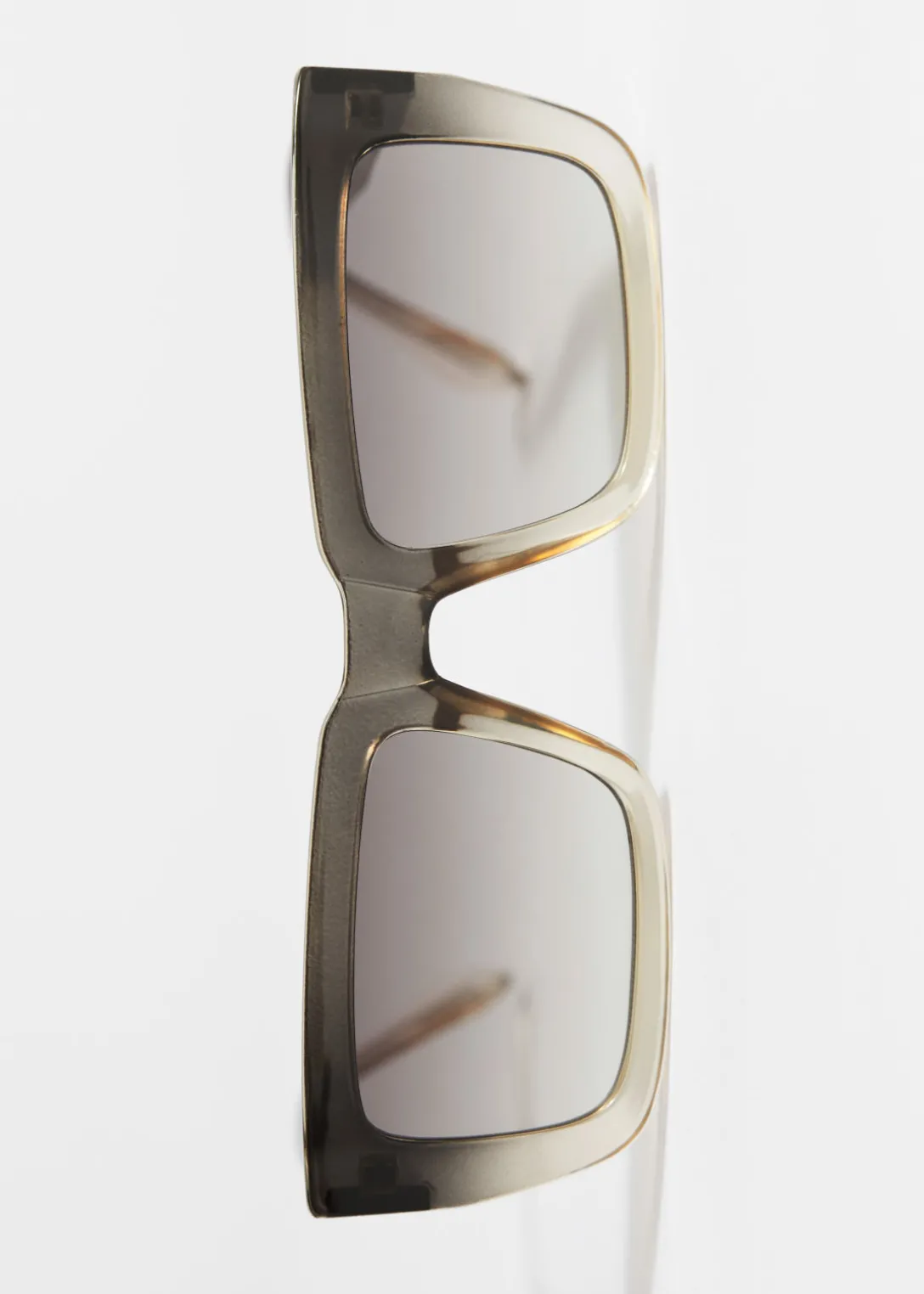 Ces lunettes de soleil présentent une monture carrée oversize, idéale pour les visages de forme ronde ou ovale. Elles sont dotées de verres ton sur ton et de branches classiques.