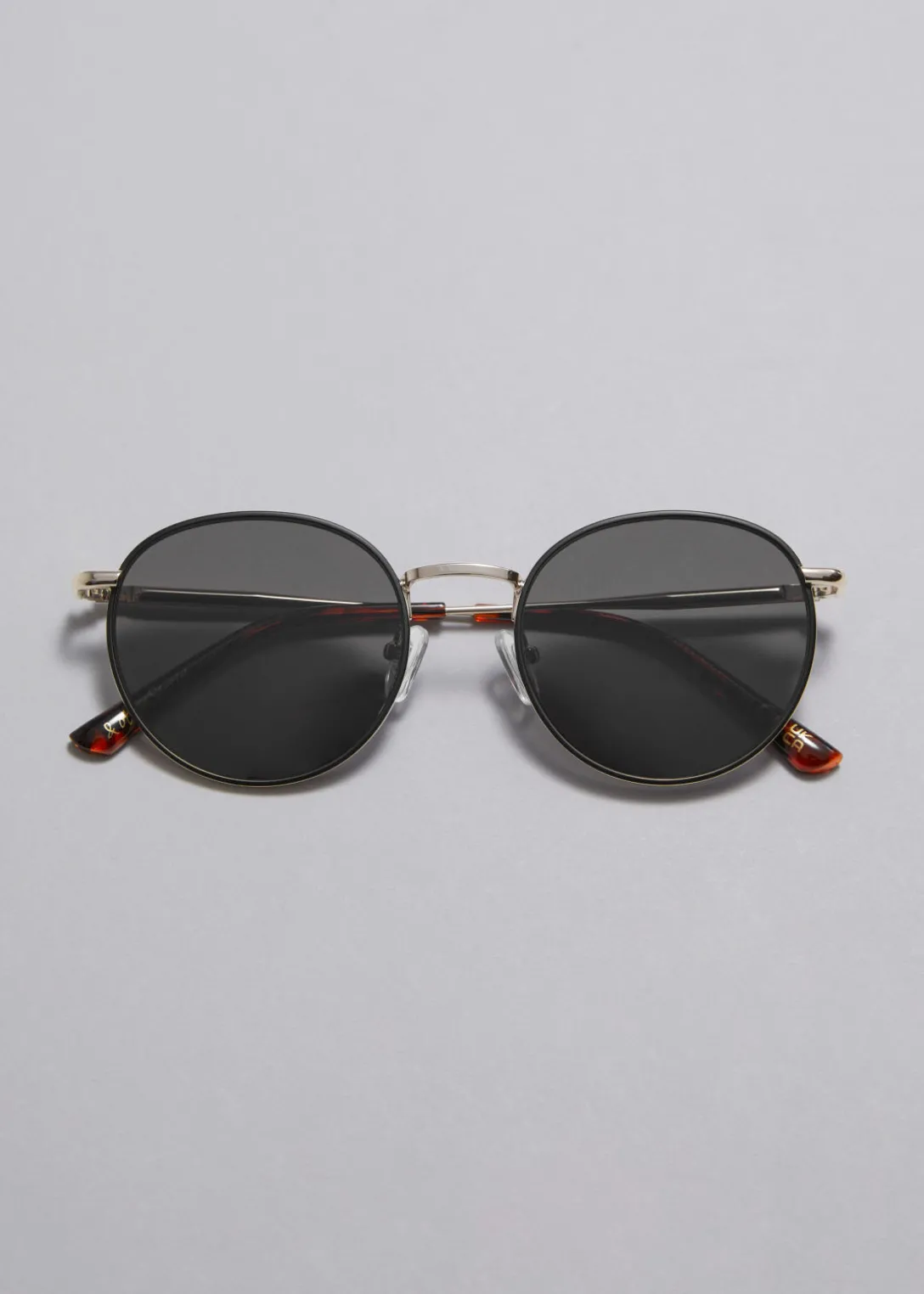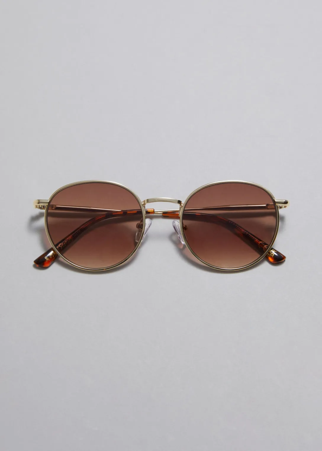 Ces lunettes de soleil possèdent une monture ovale fine. Confectionnées en métal poli léger, elles sont dotées de branches étroites aux extrémités en acétate.