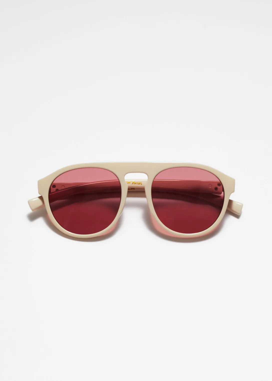 Cette paire revisite les lunettes de soleil classiques de style aviateur. Elle possède des branches classiques de taille moyenne et des verres ton sur ton.