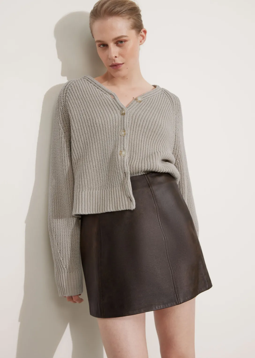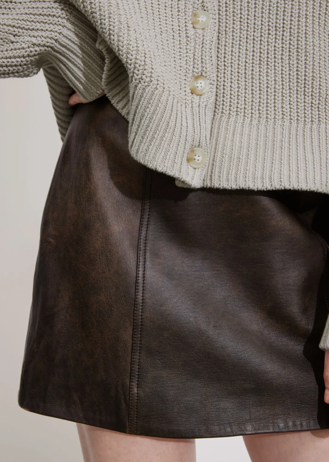 Mini-jupe à taille haute en cuir, avec une finition épurée et une fermeture zippée à l’arrière.