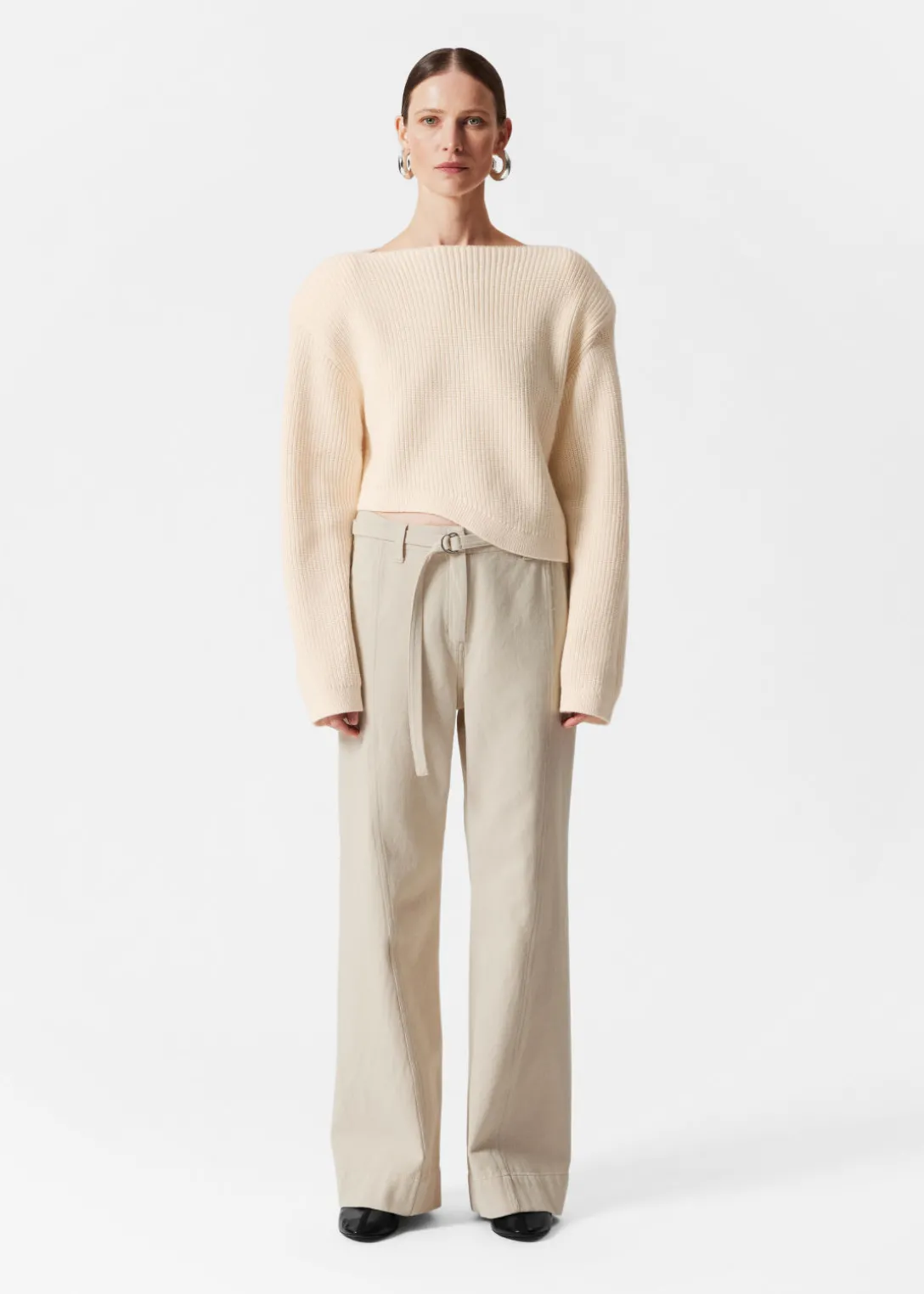 Pantalon avec une ceinture à boucle en D, mais aussi des découpes verticales surpiquées à l’avant et à l’arrière.