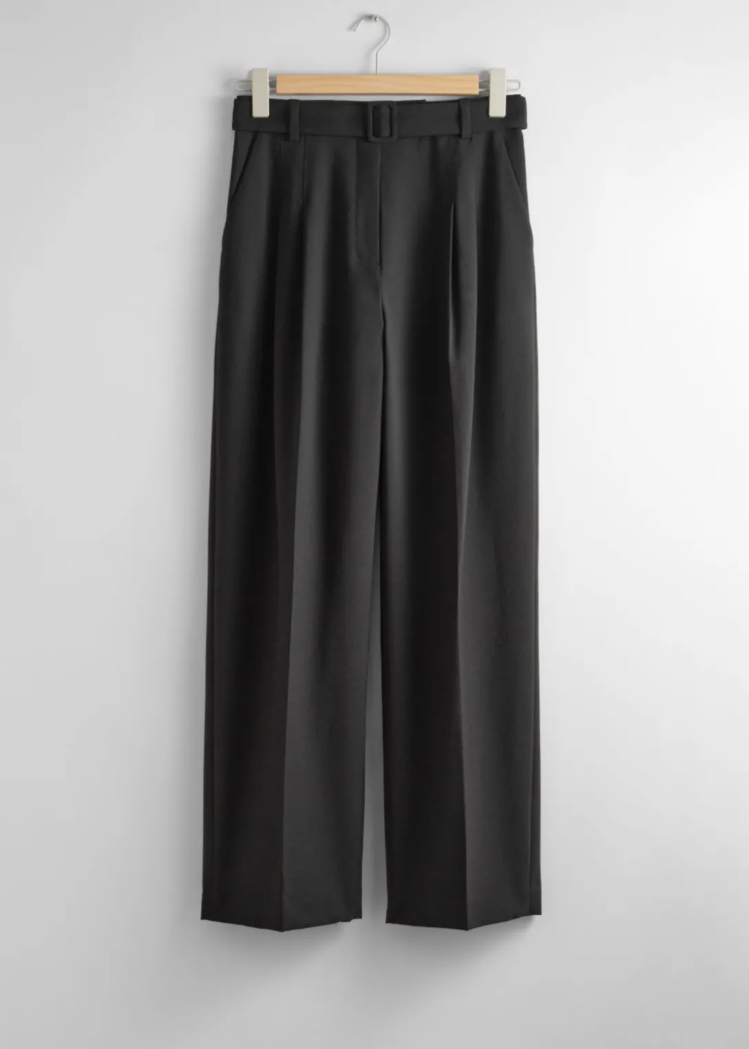 Pantalon taille haute habillé, avec une ceinture à boucle ton sur ton et des plis marqués.