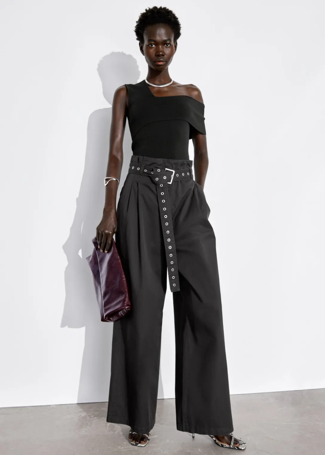 Pantalon droit avec une taille haute froncée et une ceinture à boucle et à œillets.