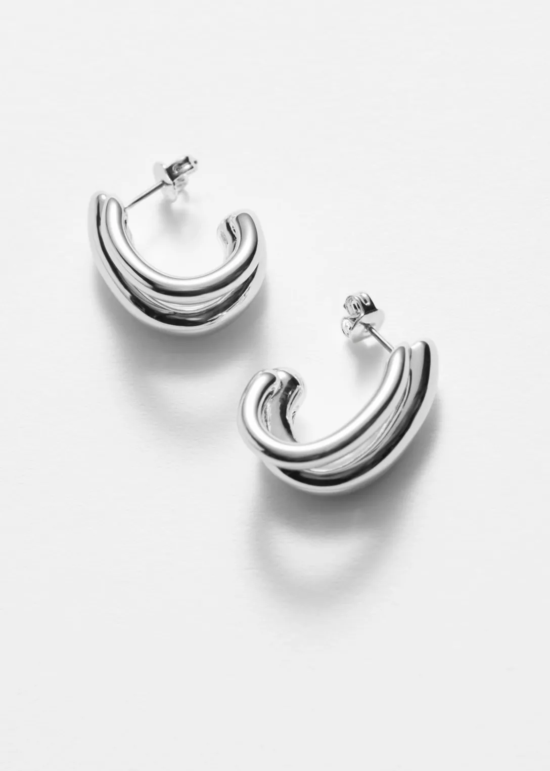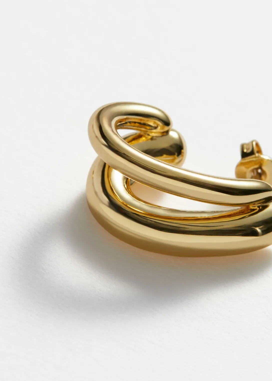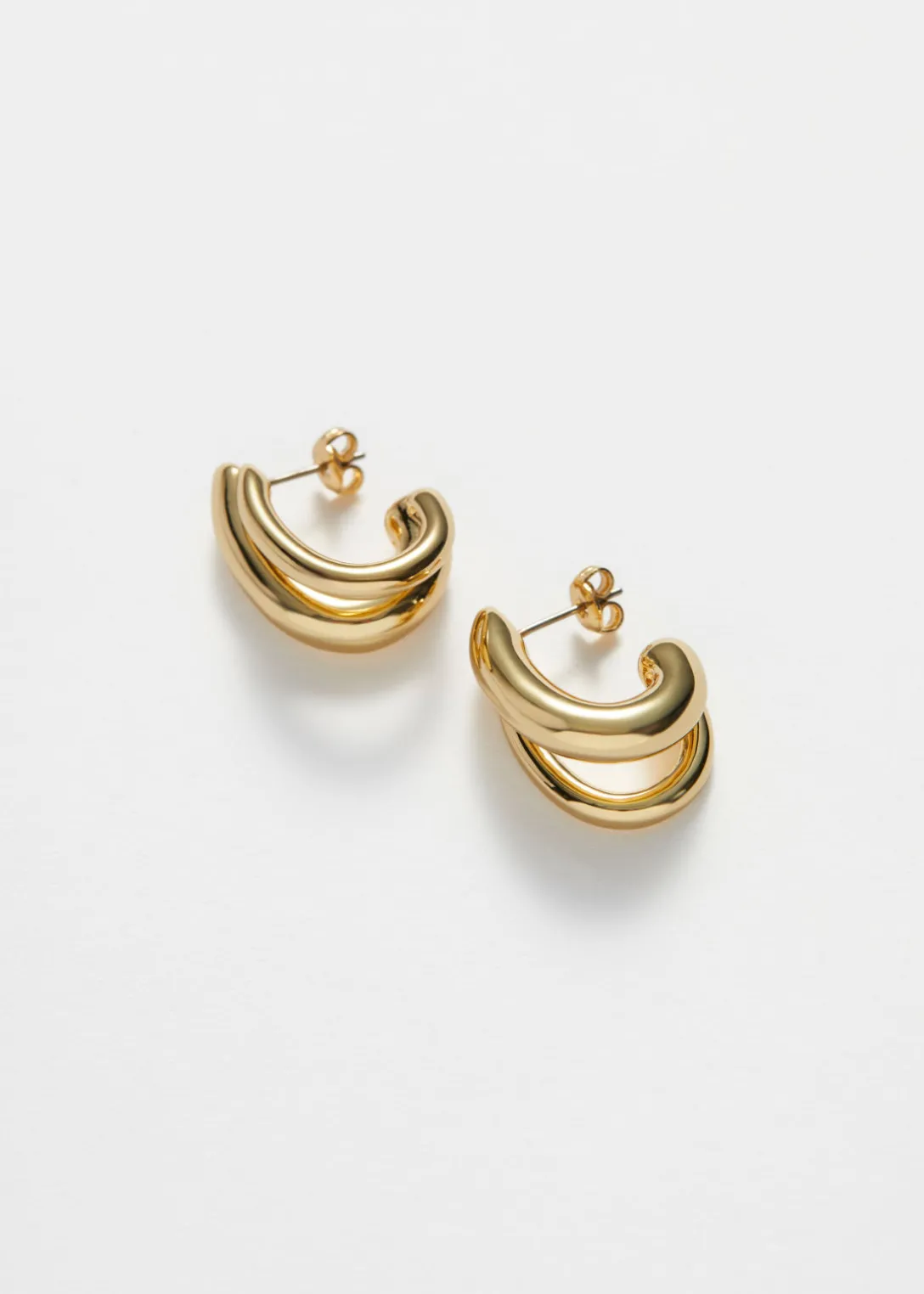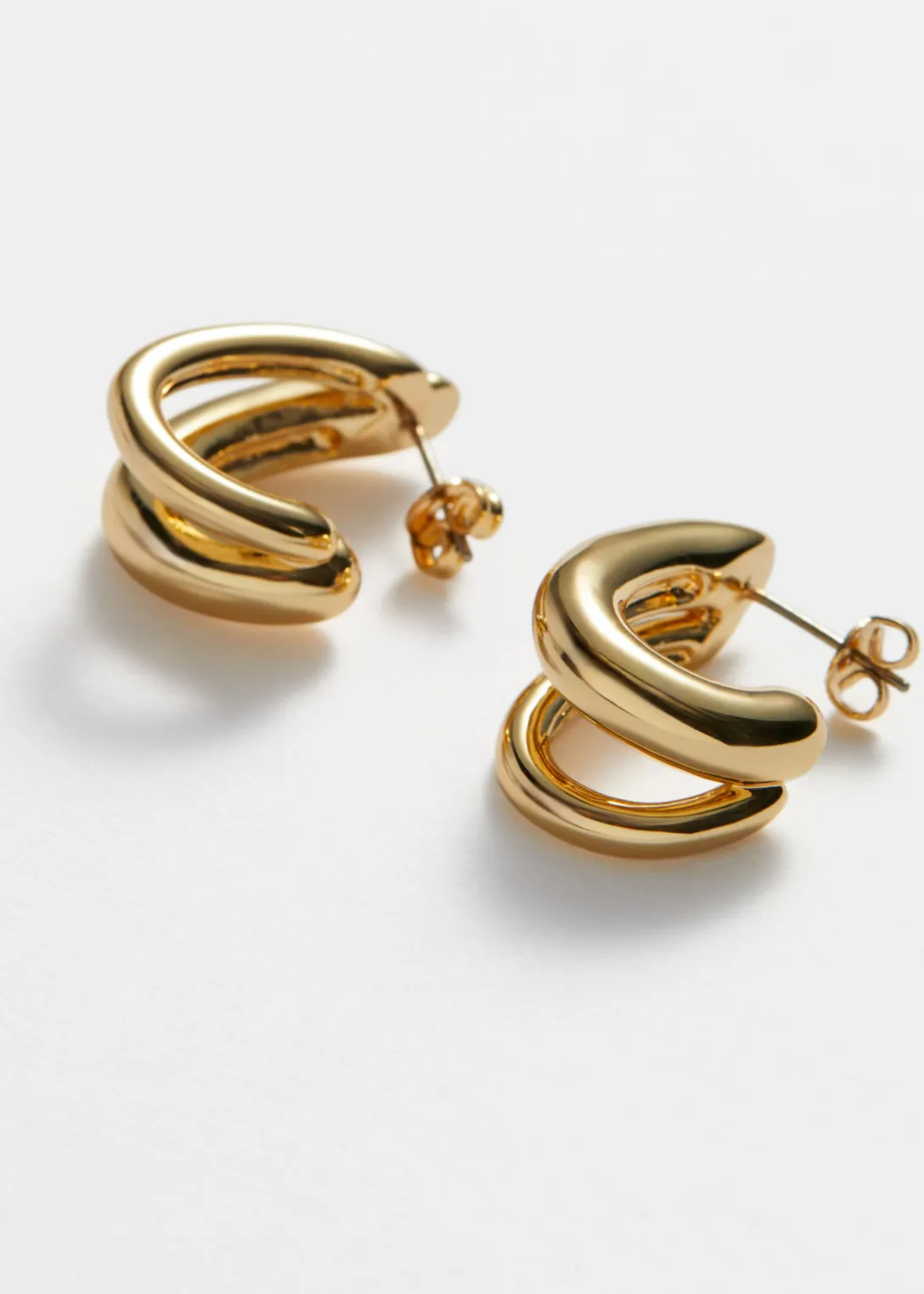 Confectionnées en laiton poli, ces boucles d’oreilles présentent deux rangées et des fermoirs papillon.