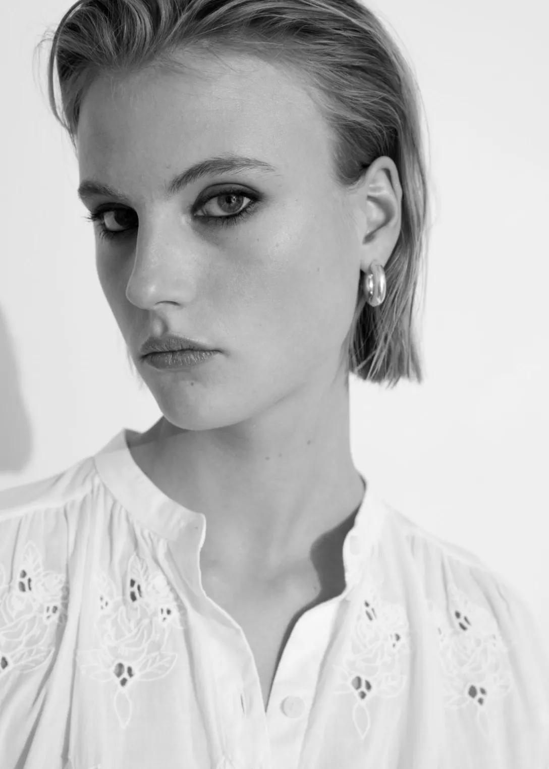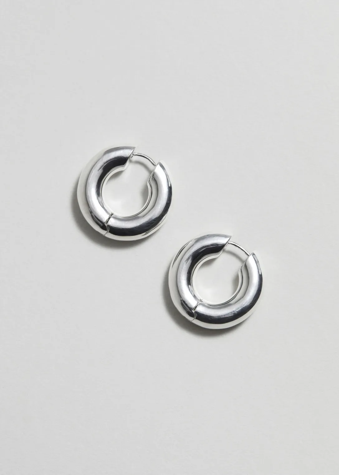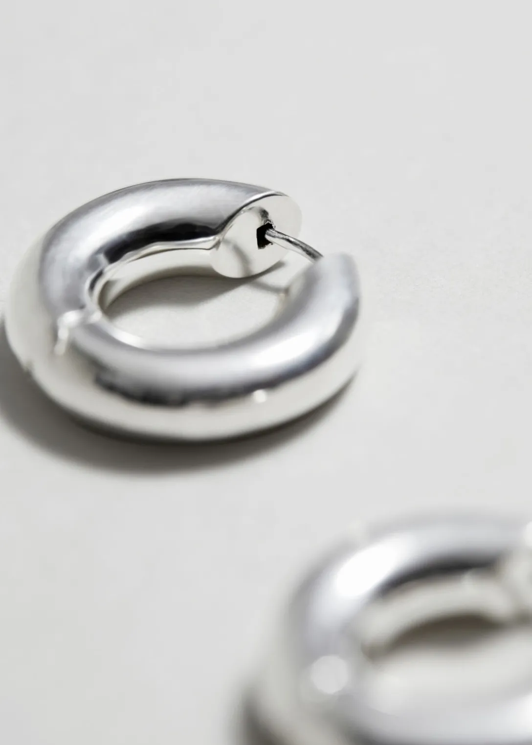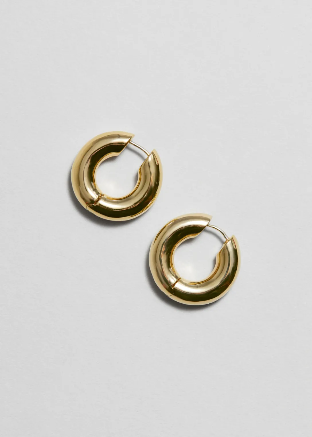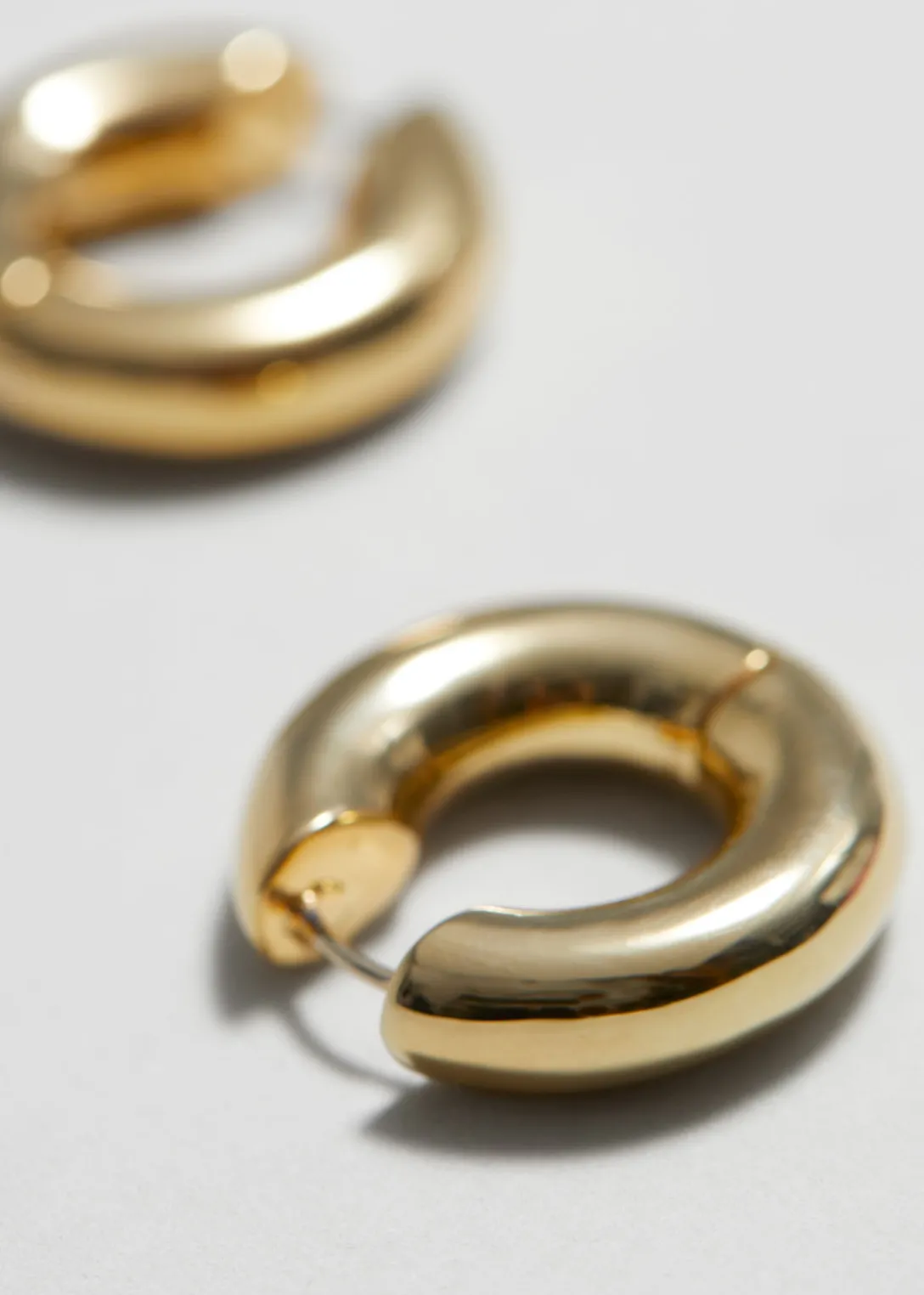 Confectionnées en laiton poli, ces petites créoles épaisses sont dotées d’un fermoir à charnière sécurisé. Elles sont idéales pour tous les jours, mais suffisamment imposantes pour être remarquées.