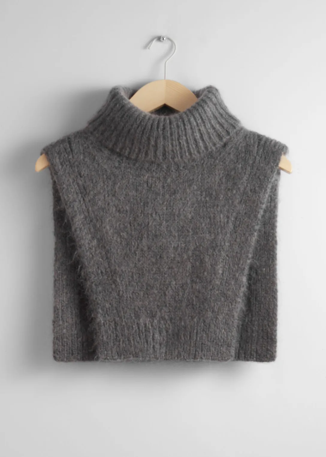 Plastron à col roulé côtelé, confectionné à partir d’un mélange chaud de mohair et de laine. Ce débardeur hybride présente une maille unie douce.