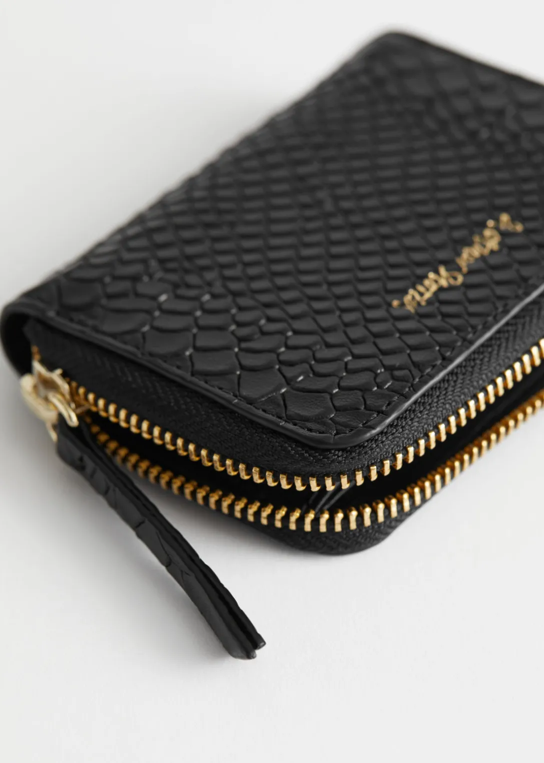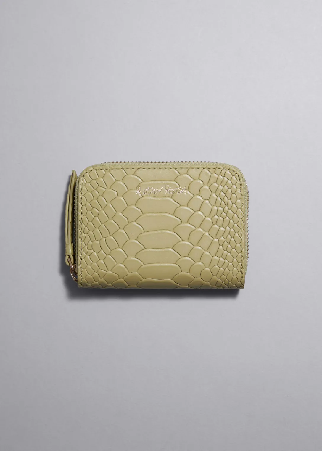 Portefeuille en cuir gaufré serpent avec deux compartiments pour les cartes et les pièces de monnaie. Doté d’une fermeture éclair dorée et d’un logo « & Other Stories ».