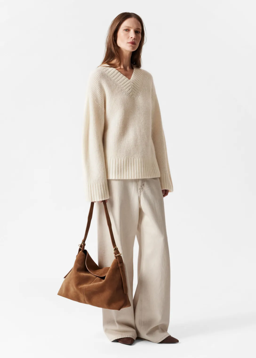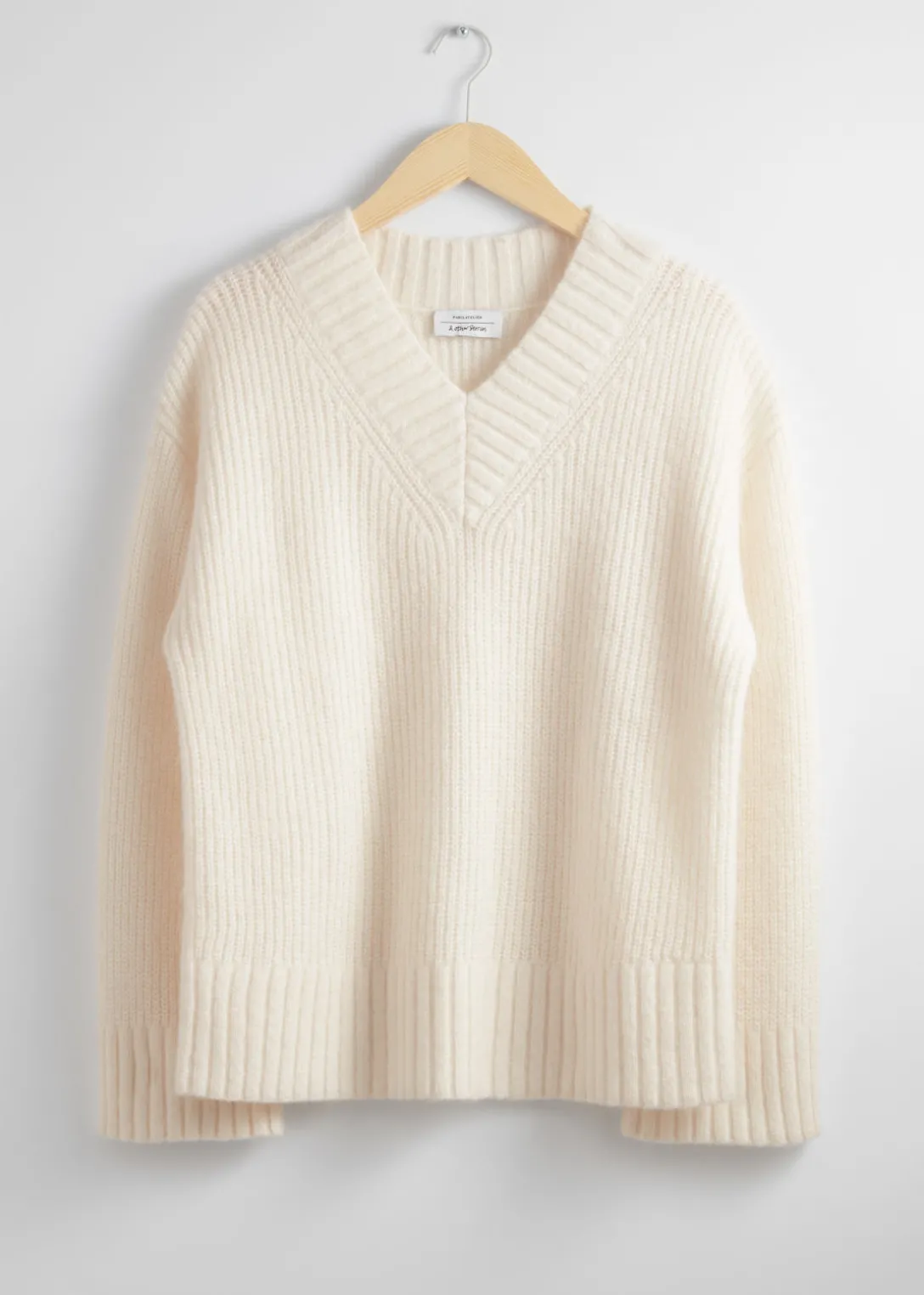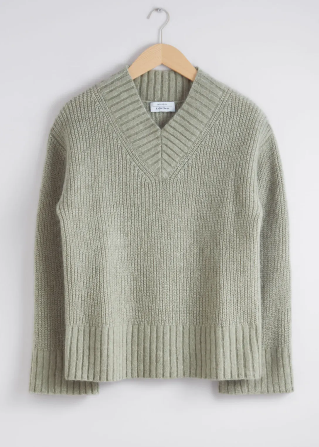 Pull duveteux à col en V, confectionné à partir d’un mélange de mohair et de laine.