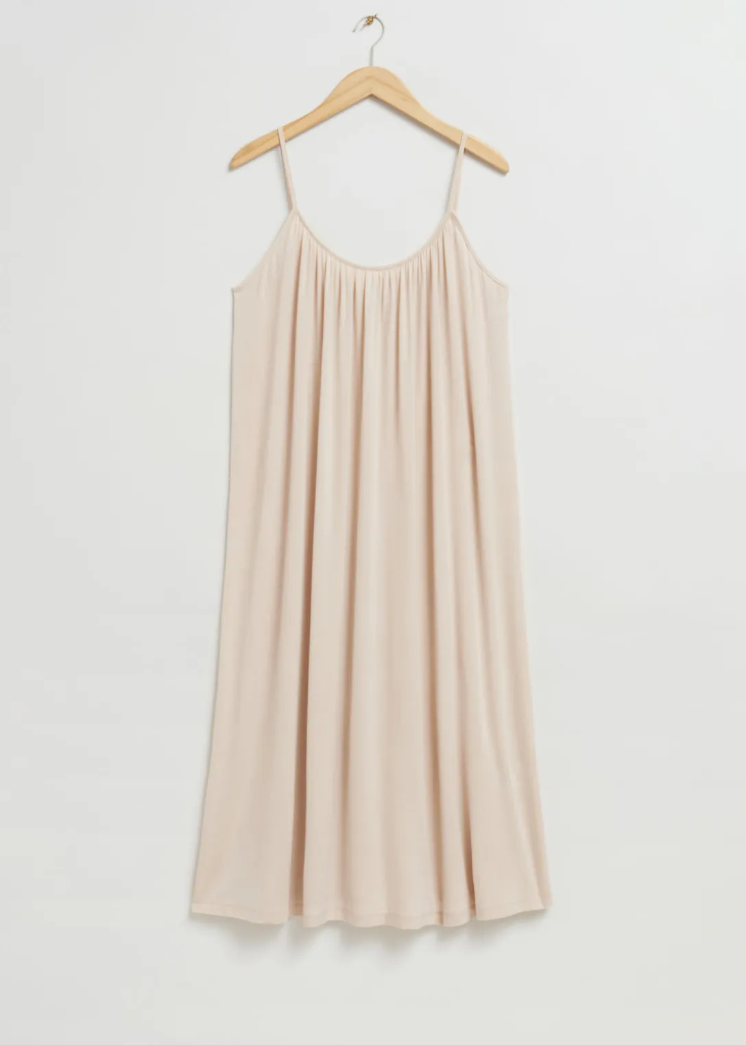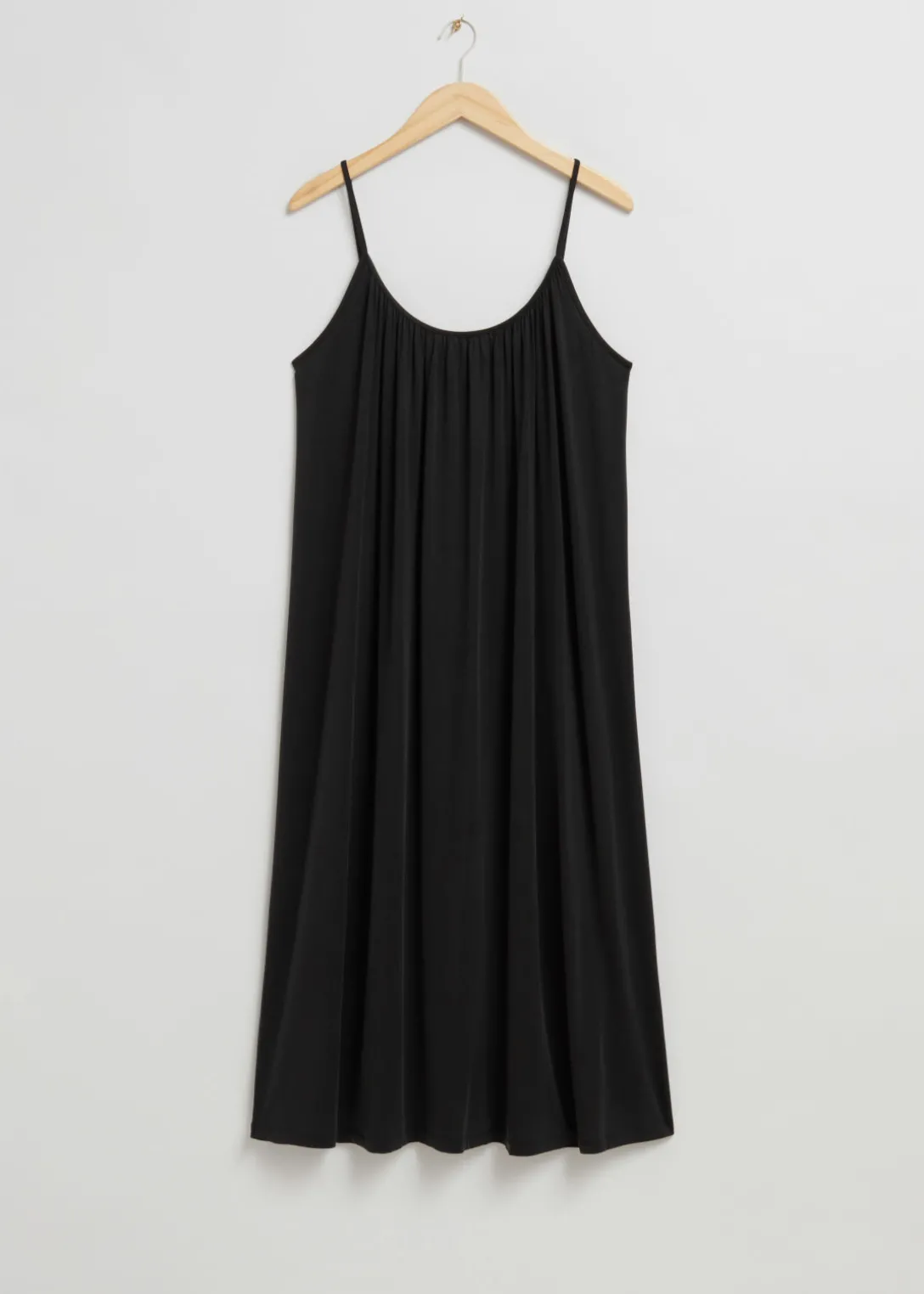Robe à bretelles aux détails froncés, confectionnée en jersey extensible similaire à la soie. Ce modèle midi présente une silhouette ample et aérienne avec de fines bretelles, une encolure ronde, un dos échancré avec des fronces et une fente sur la couture latérale.