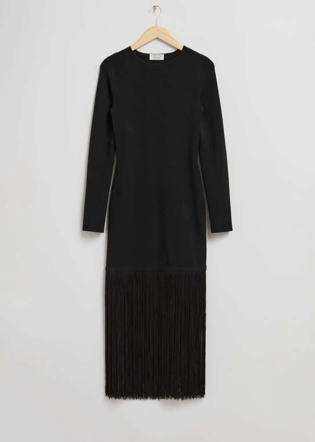 Robe courte ajustée dotée de manches longues, d’un col rond et d’un ourlet inférieur agrémenté de franges.