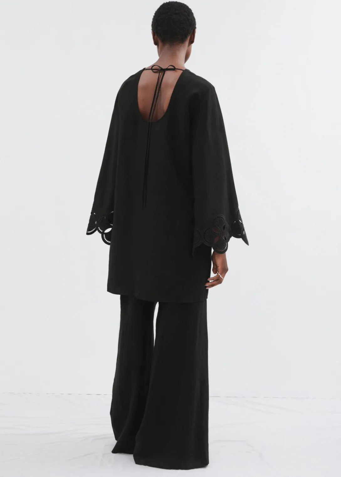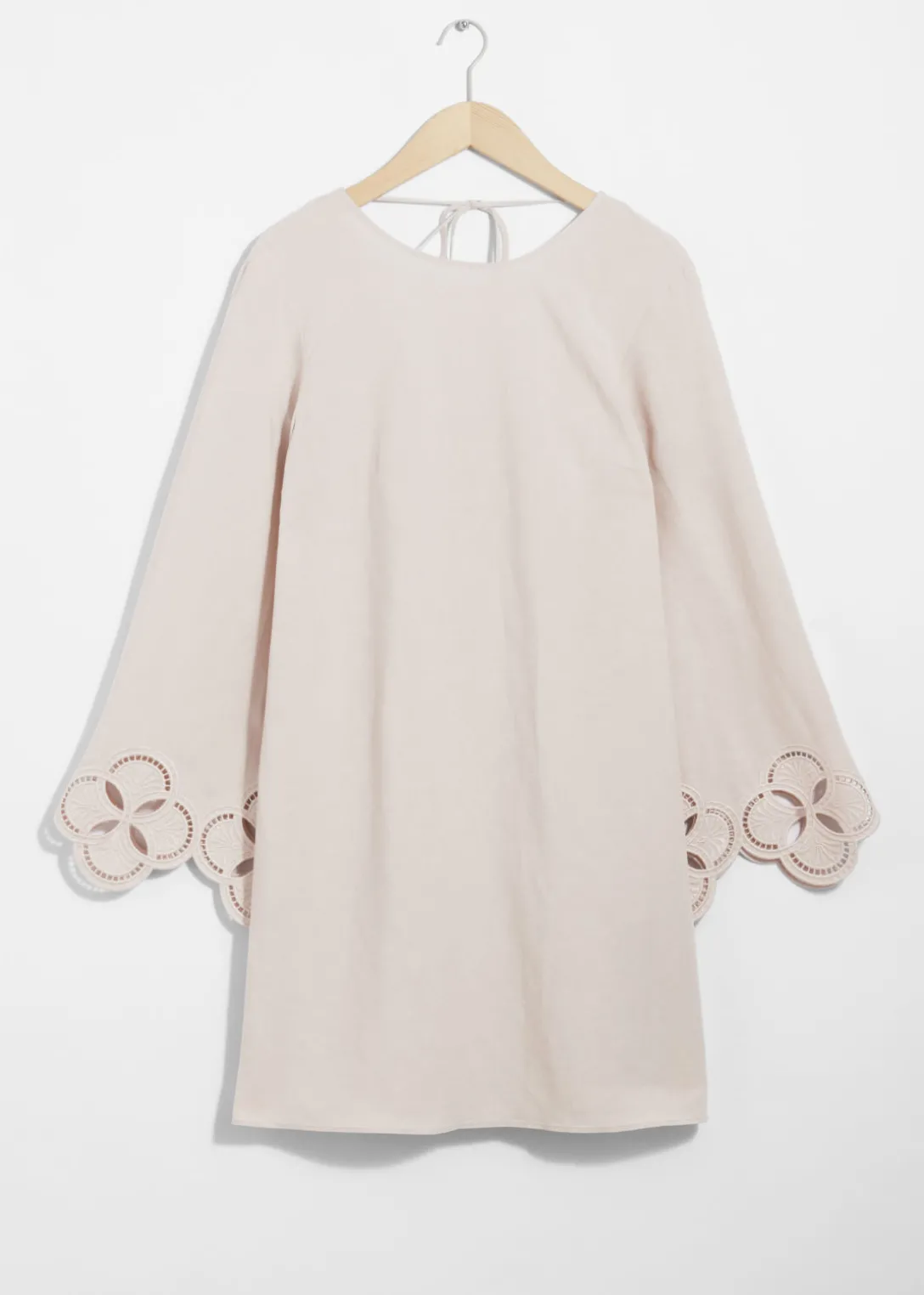 Robe courte trapèze confectionnée à partir d’une matière aérienne. Dotée de manches longues et larges, ornées de broderies aux poignets.