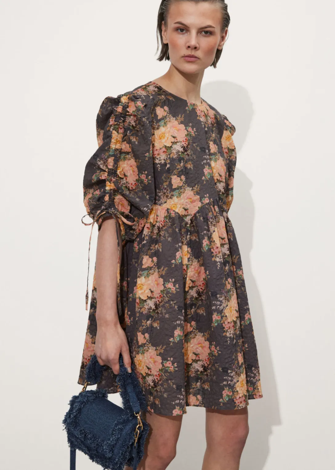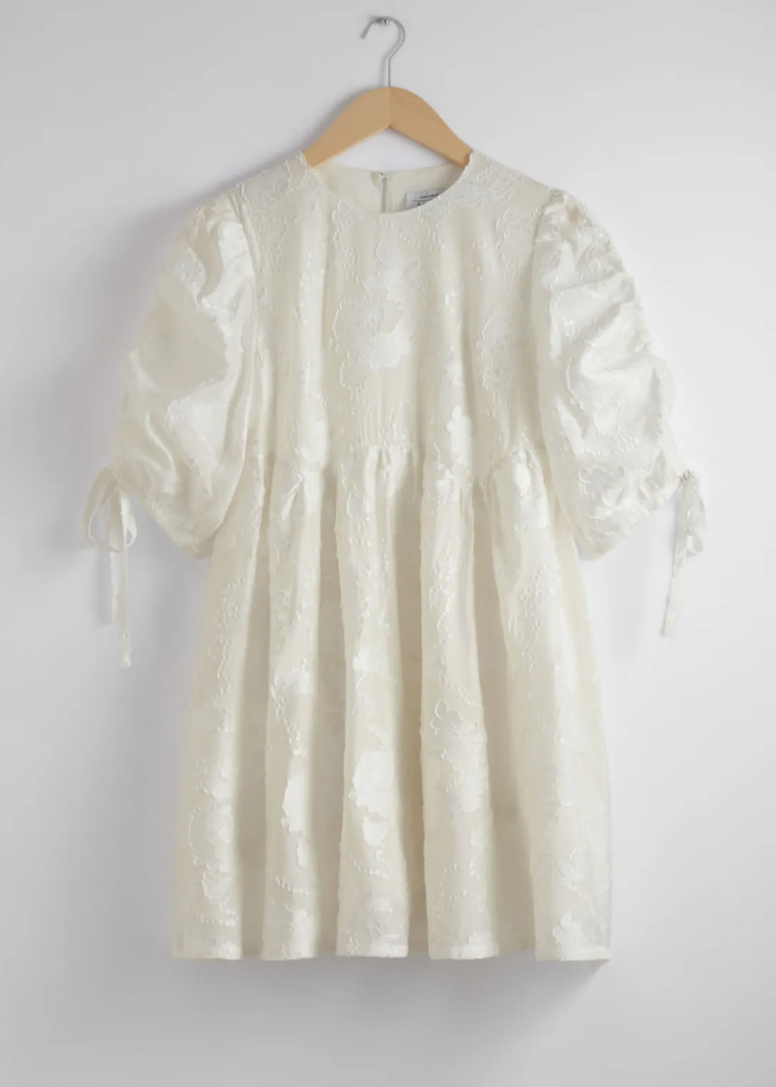 Robe courte avec des manches volumineuses trois-quarts, ornées de cordons de serrage et de liens à nouer en bas.