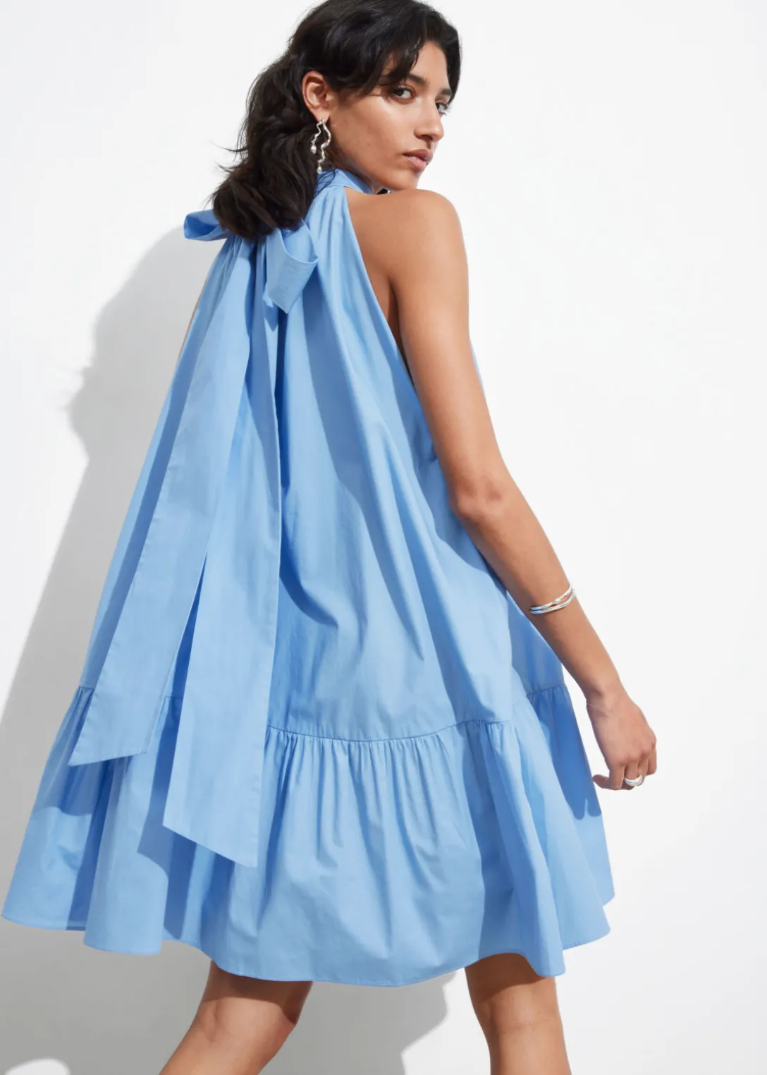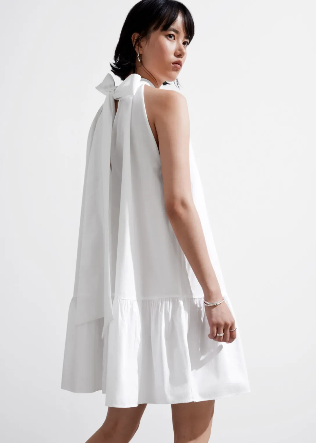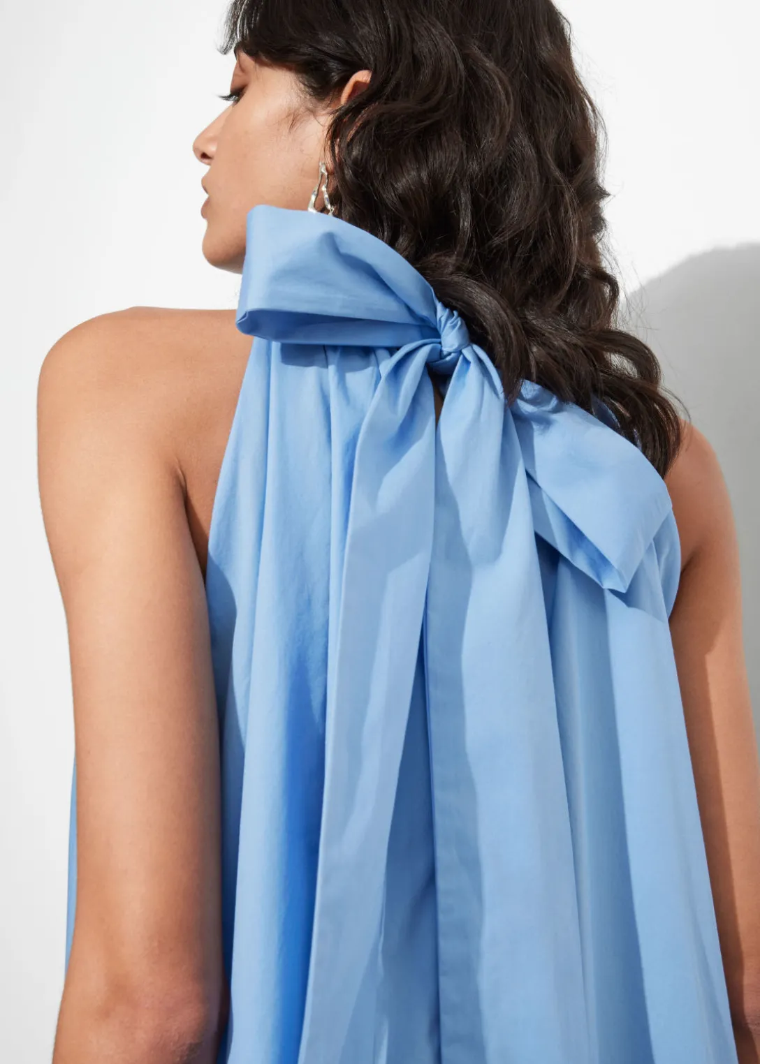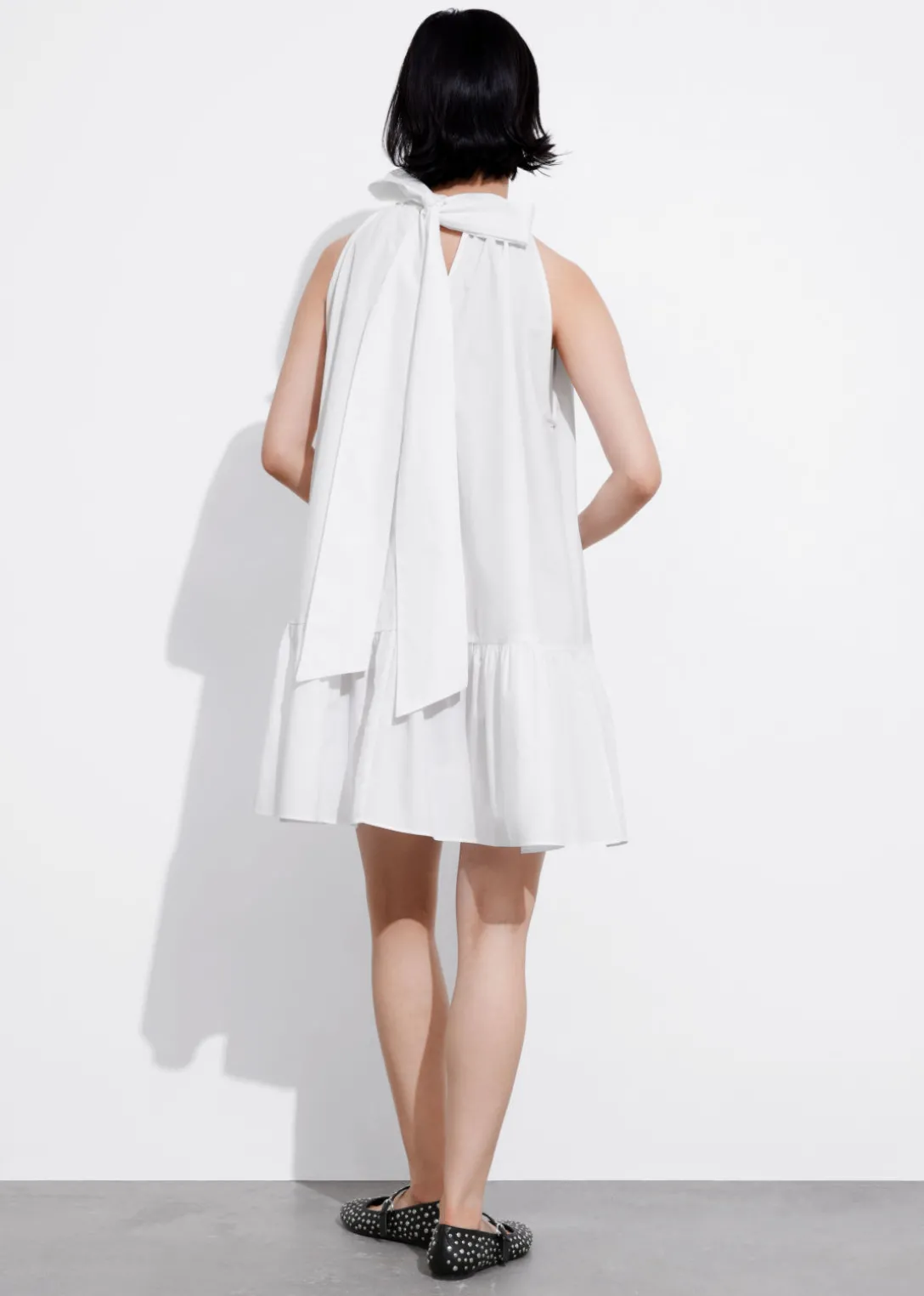 Robe courte trapèze à dos nu, avec un grand nœud au cou. Dotée d’un ourlet à plusieurs niveaux.