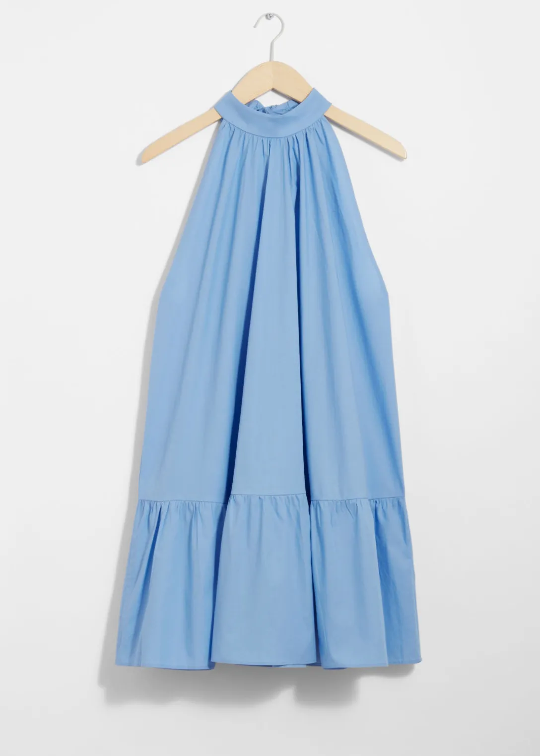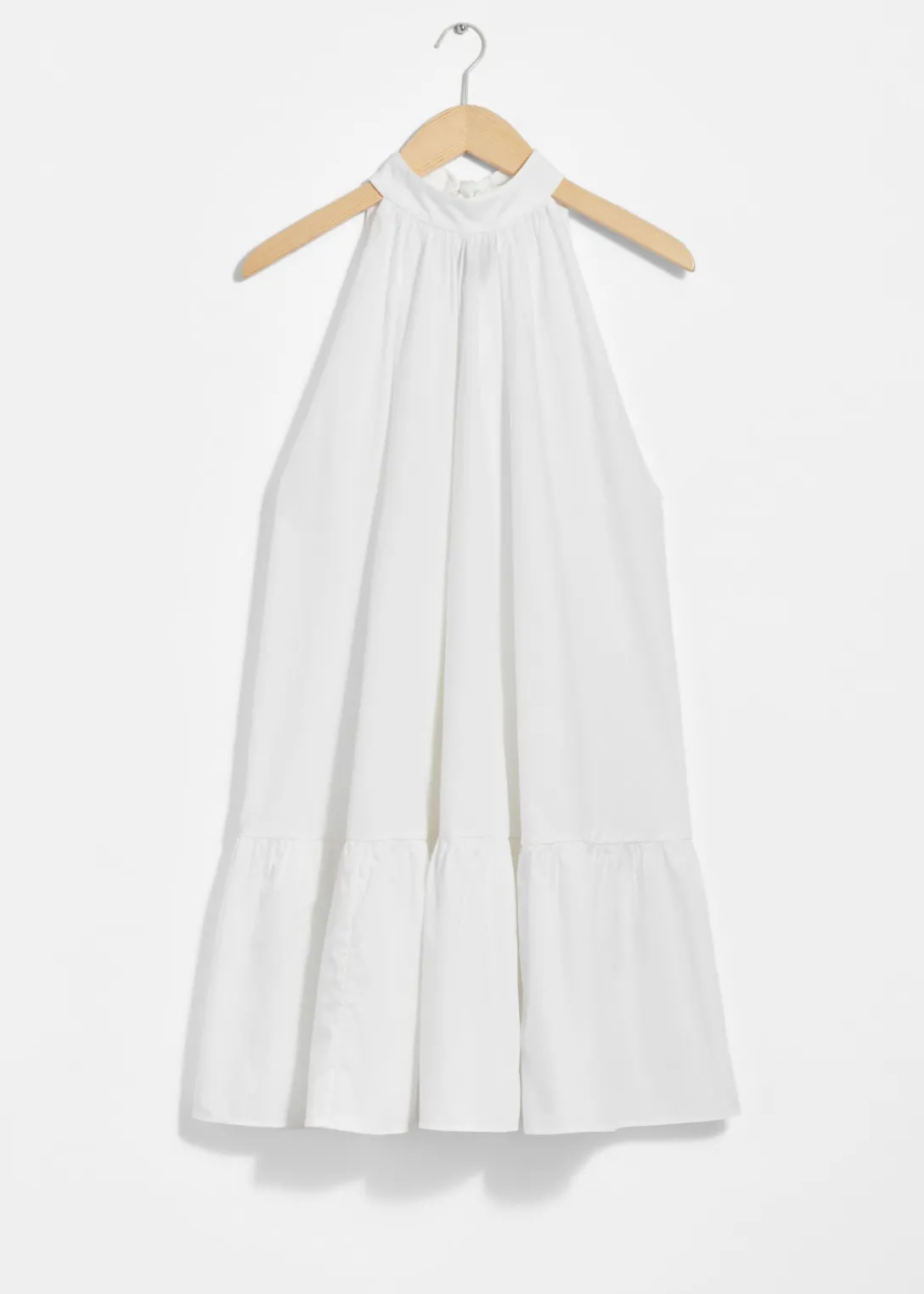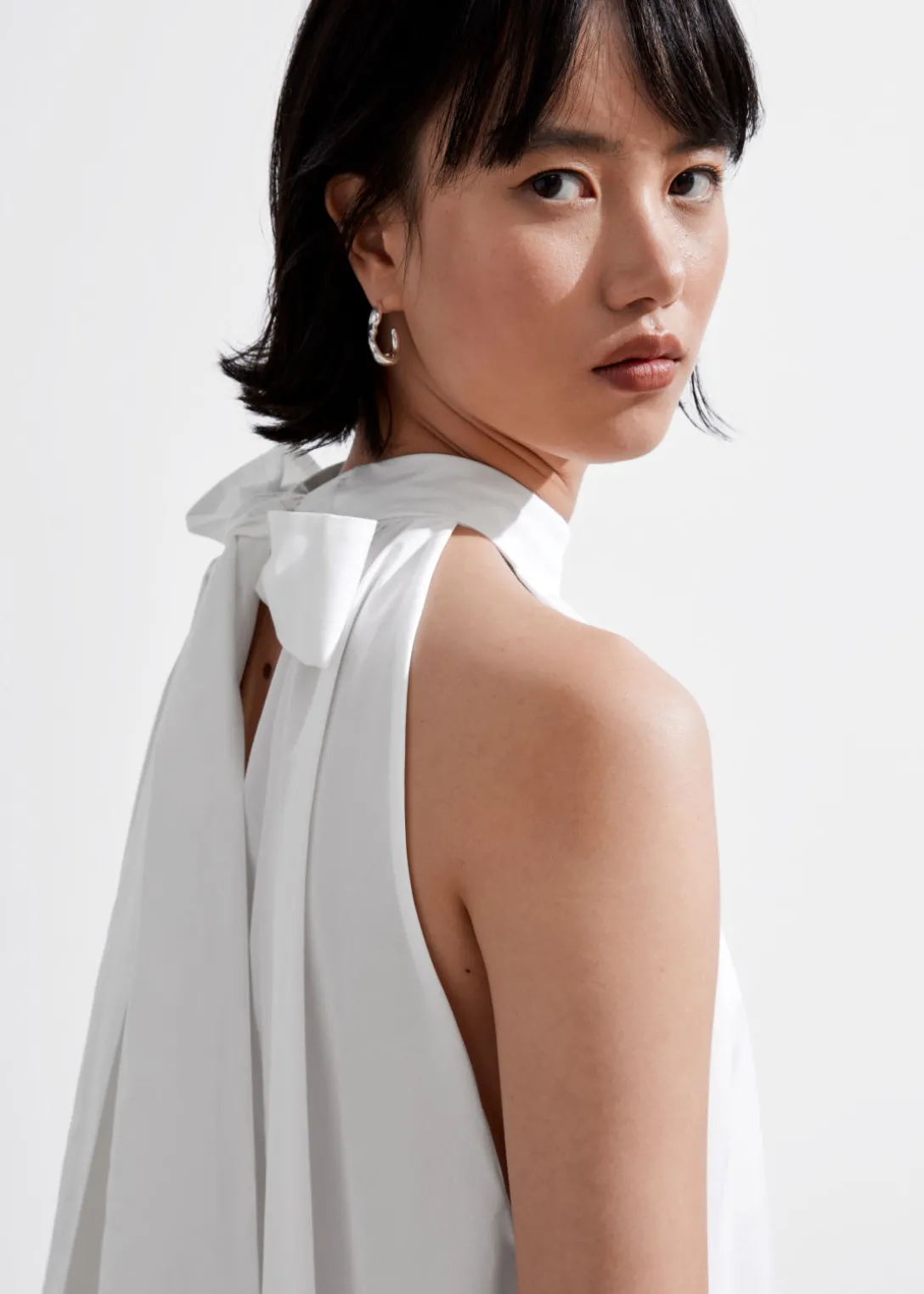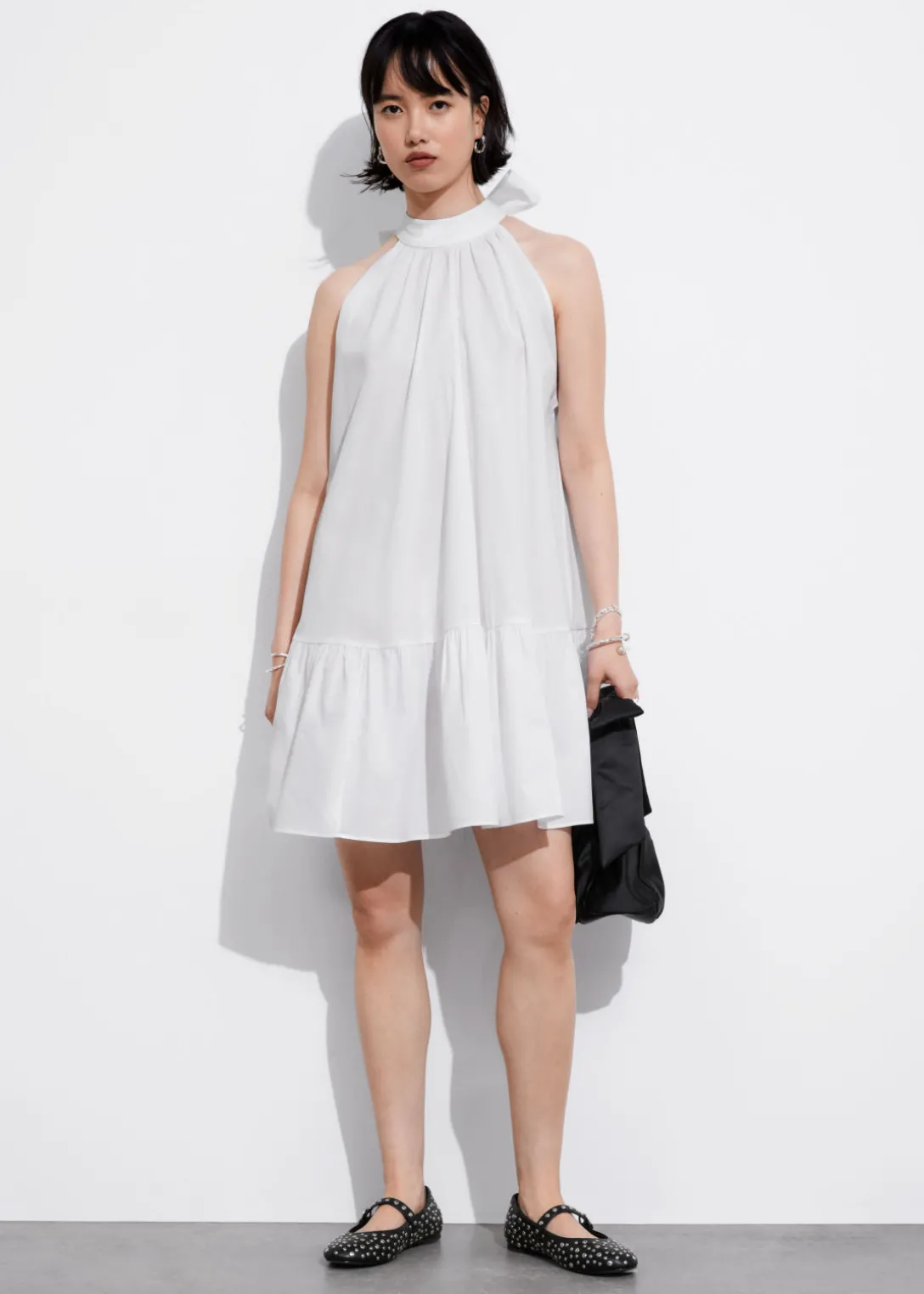 Robe courte trapèze à dos nu, avec un grand nœud au cou. Dotée d’un ourlet à plusieurs niveaux.