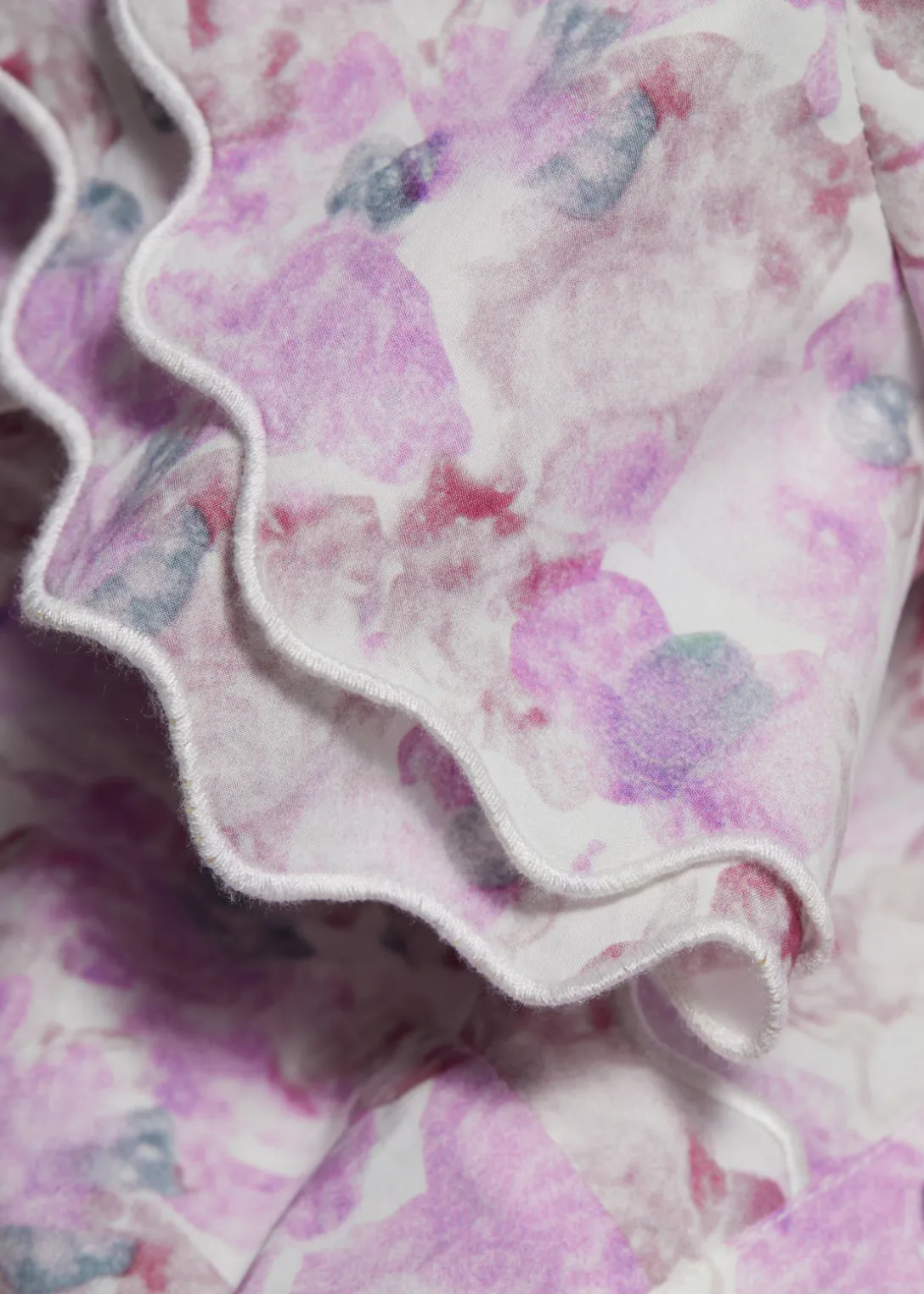Robe courte à col, avec des volants superposés au niveau des épaules et de l’ourlet. Ornée de détails festonnés sur les bords.