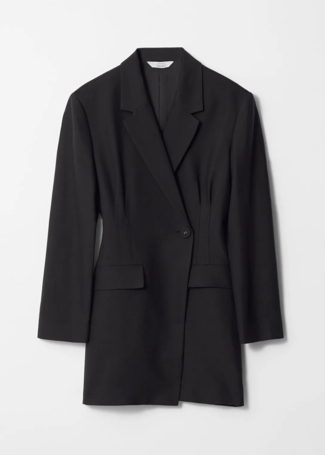 Mini robe blazer à boutonnage unique, épaules rembourrées et taille accentuée pour une silhouette structurée, de type sablier.