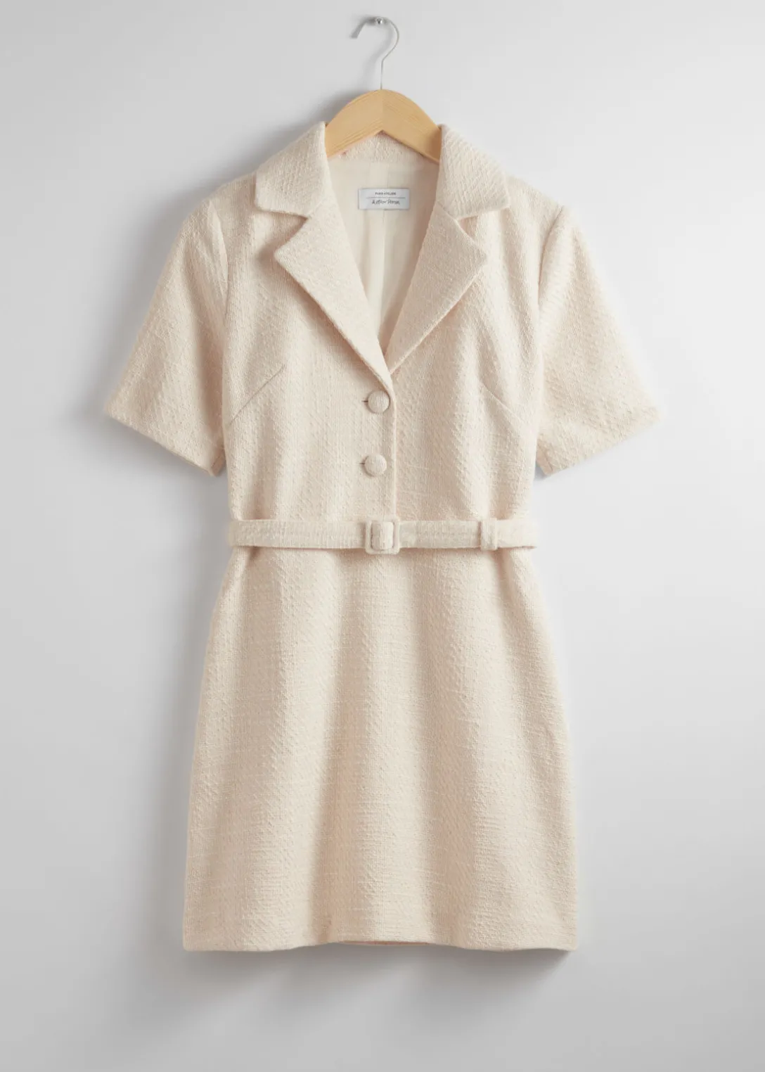 Robe courte à col en tweed, avec des manches courtes, une fermeture à deux boutons et une ceinture ton sur ton.