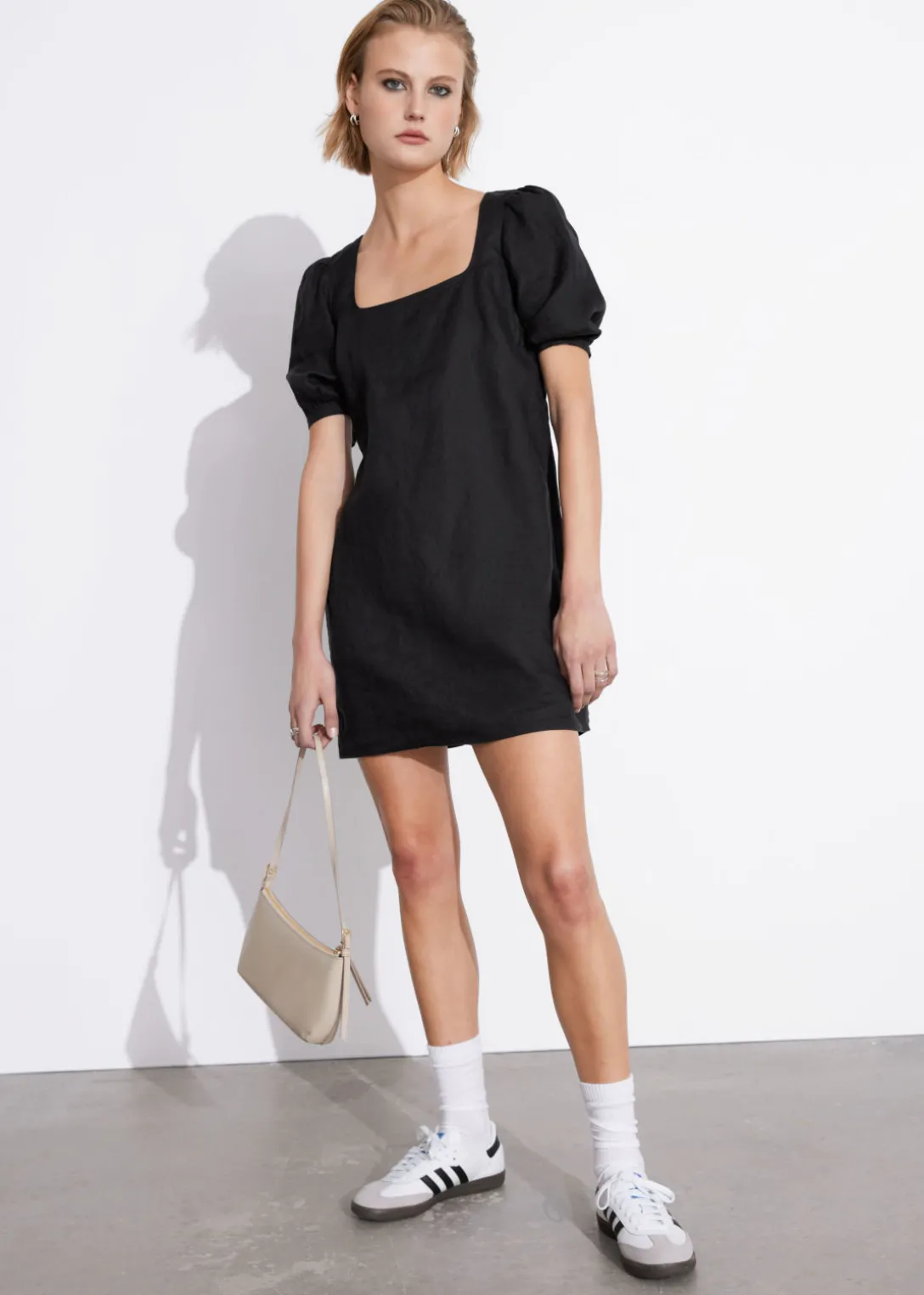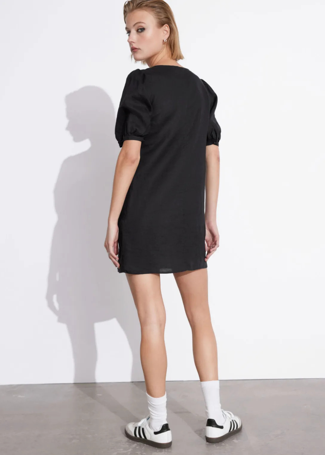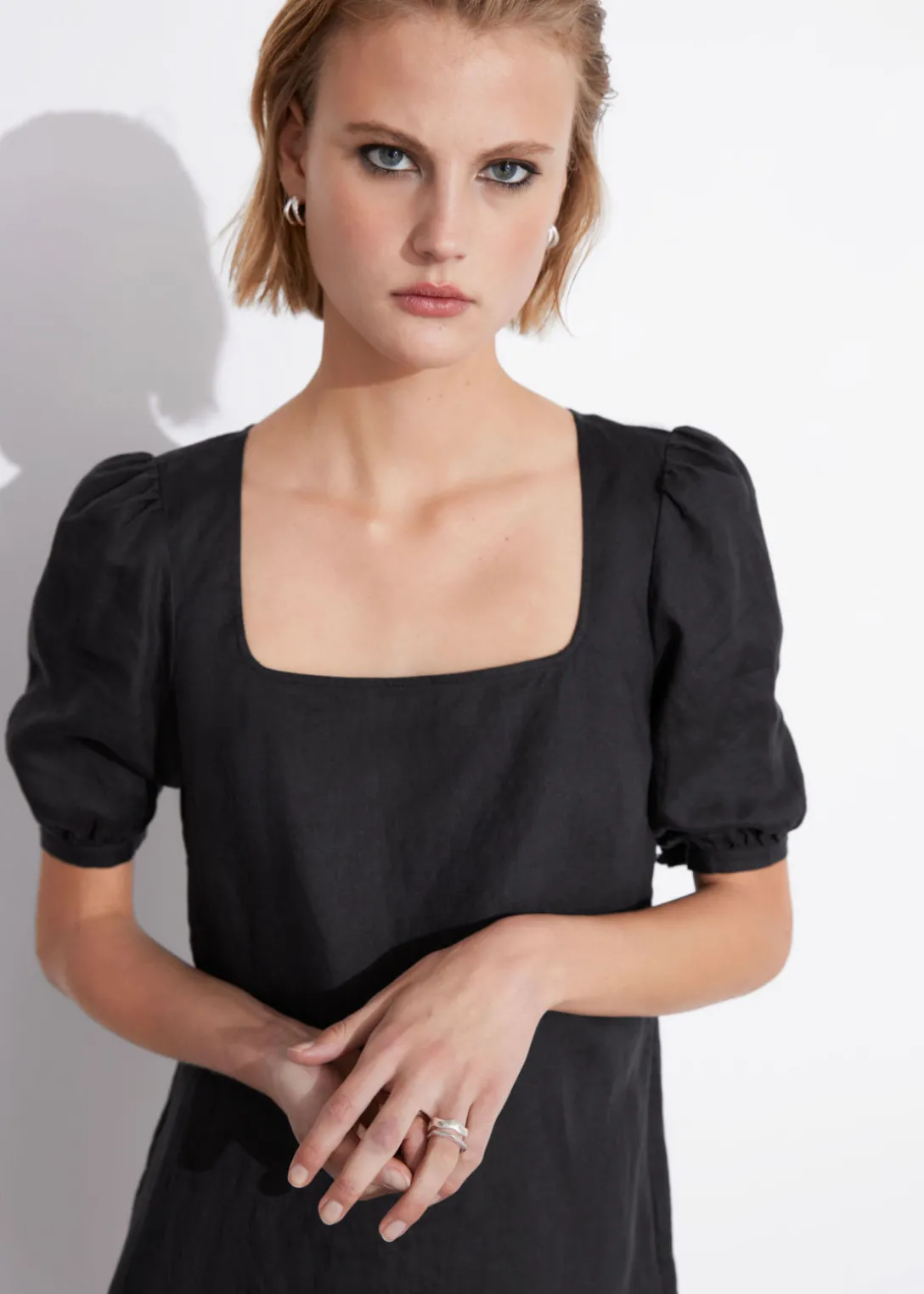 Robe courte trapèze en lin, avec des manches ballon boutonnées et une encolure carrée. Dotée d’une fermeture éclair latérale.