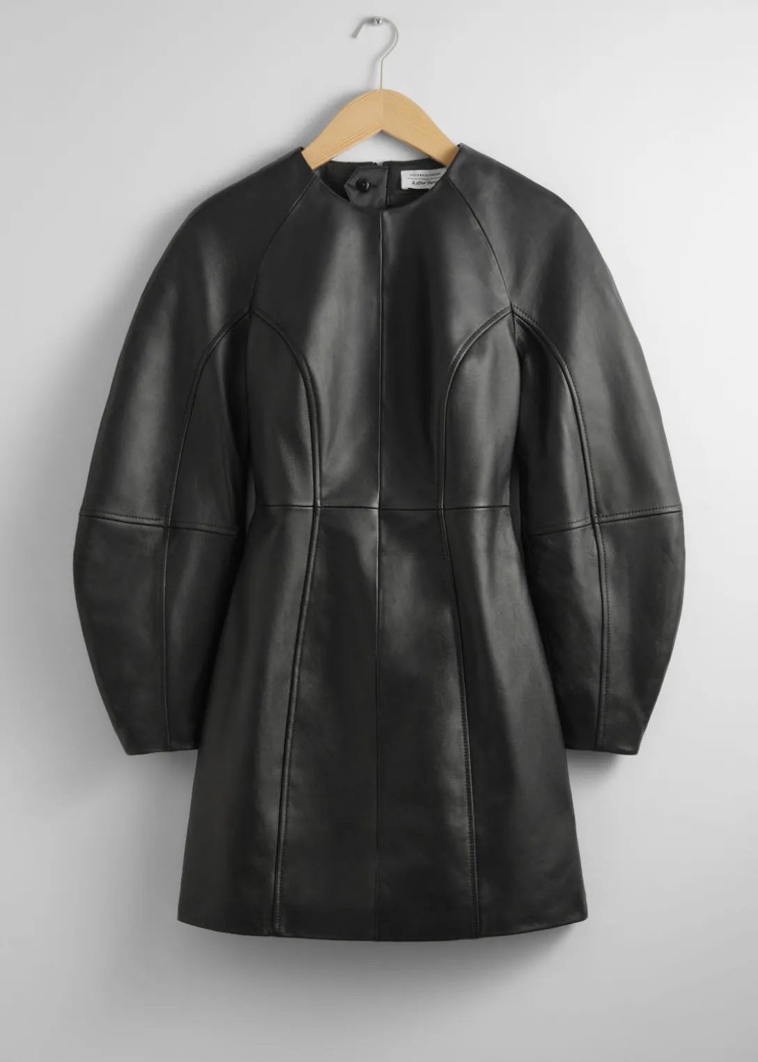 Robe courte sculpturale en cuir, avec des manches ballon et une taille ajustée.