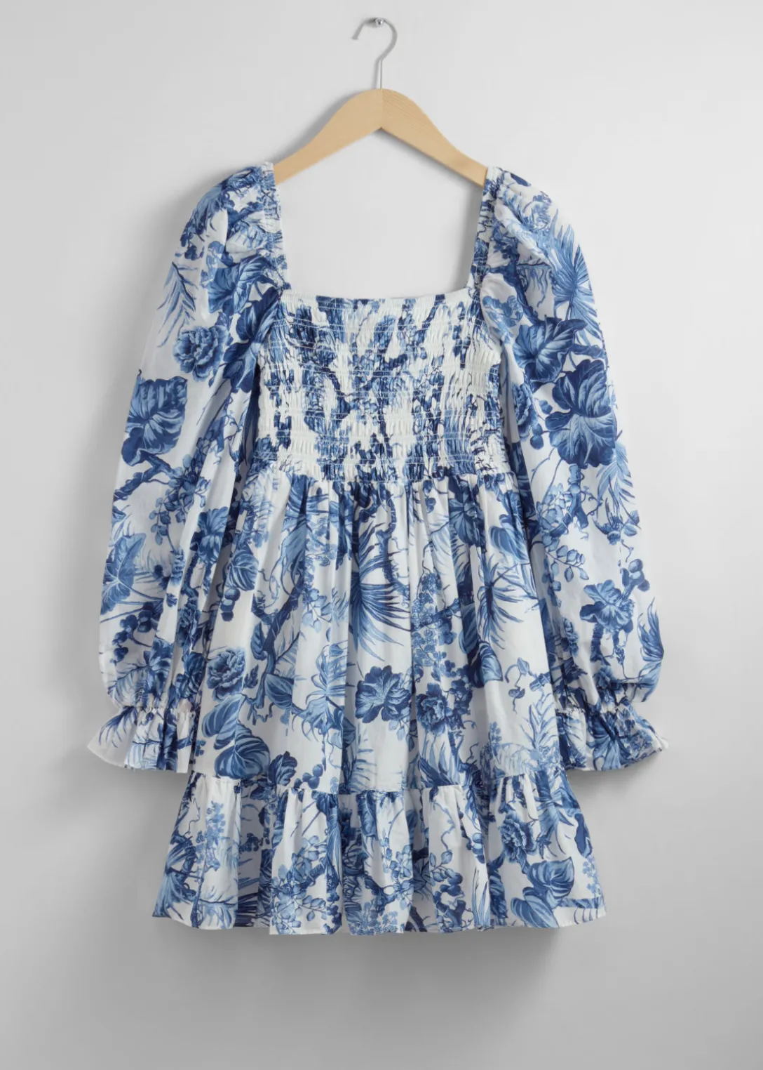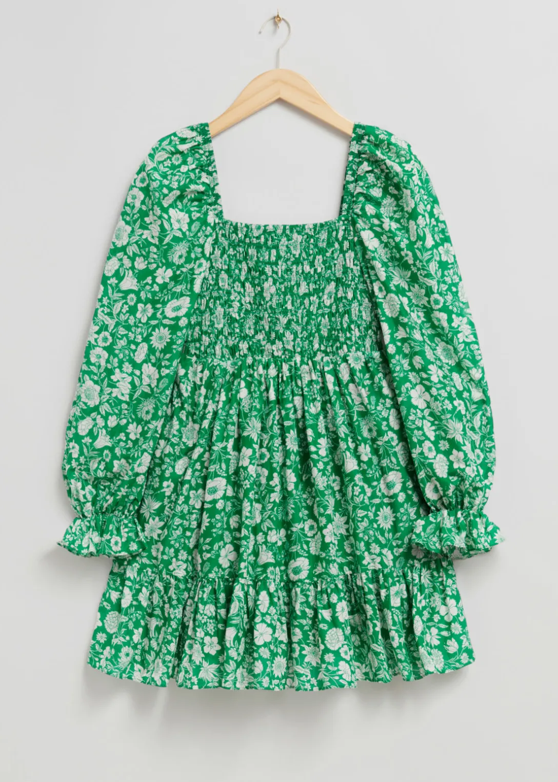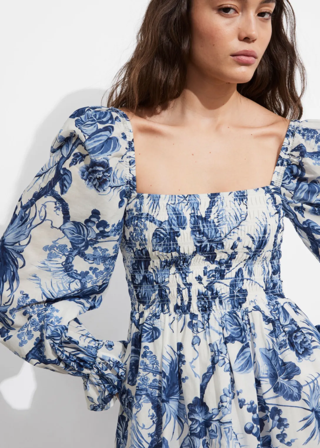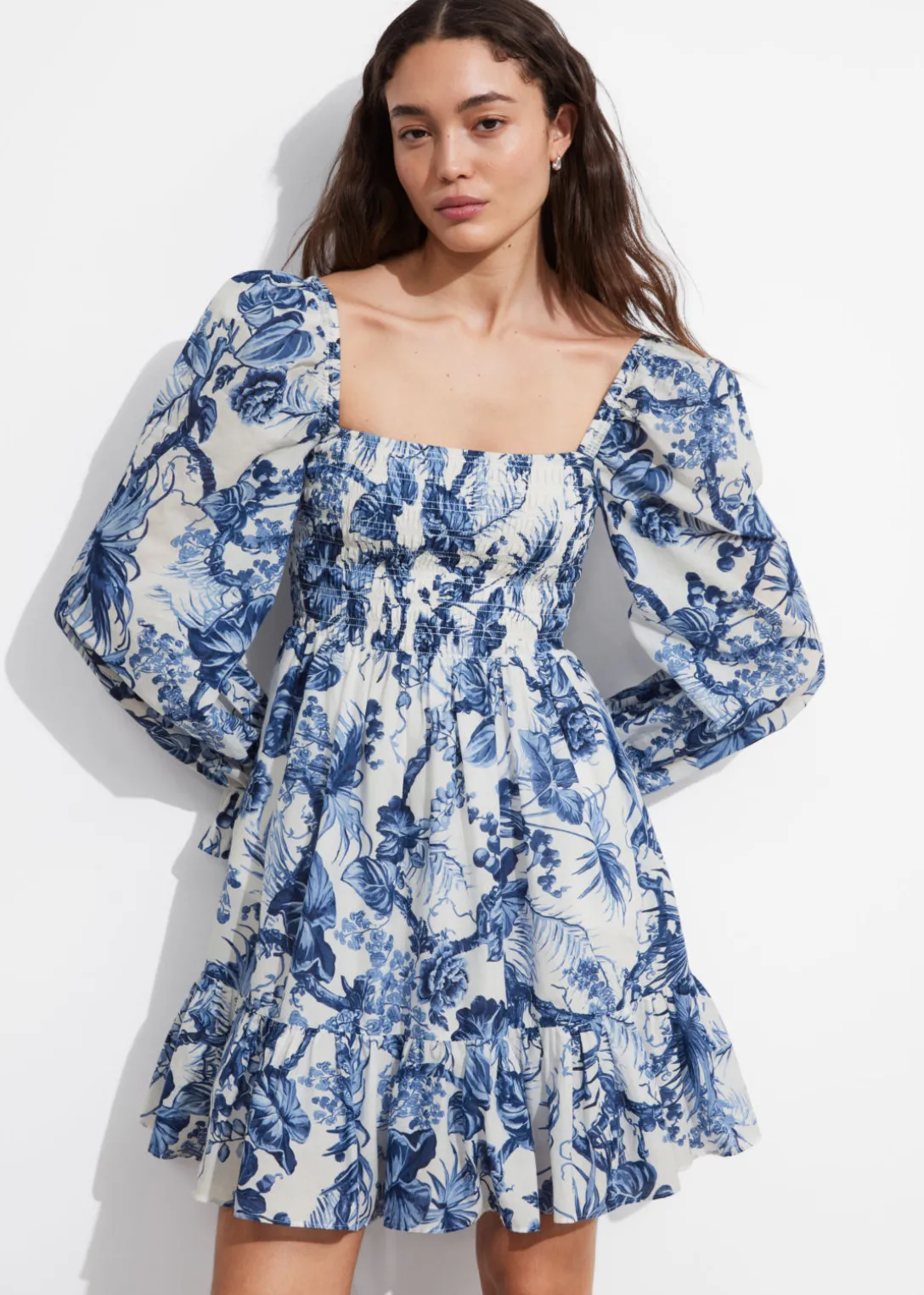 Robe courte avec des manches volumineuses, une encolure carrée et des poignets volantés.