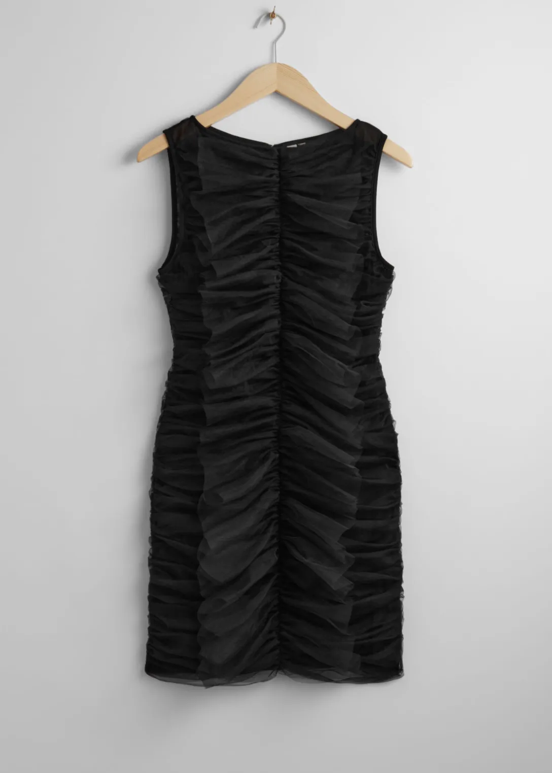 Robe courte tube à superpositions en tulle, avec une bordure volantée en bas à l’avant.
