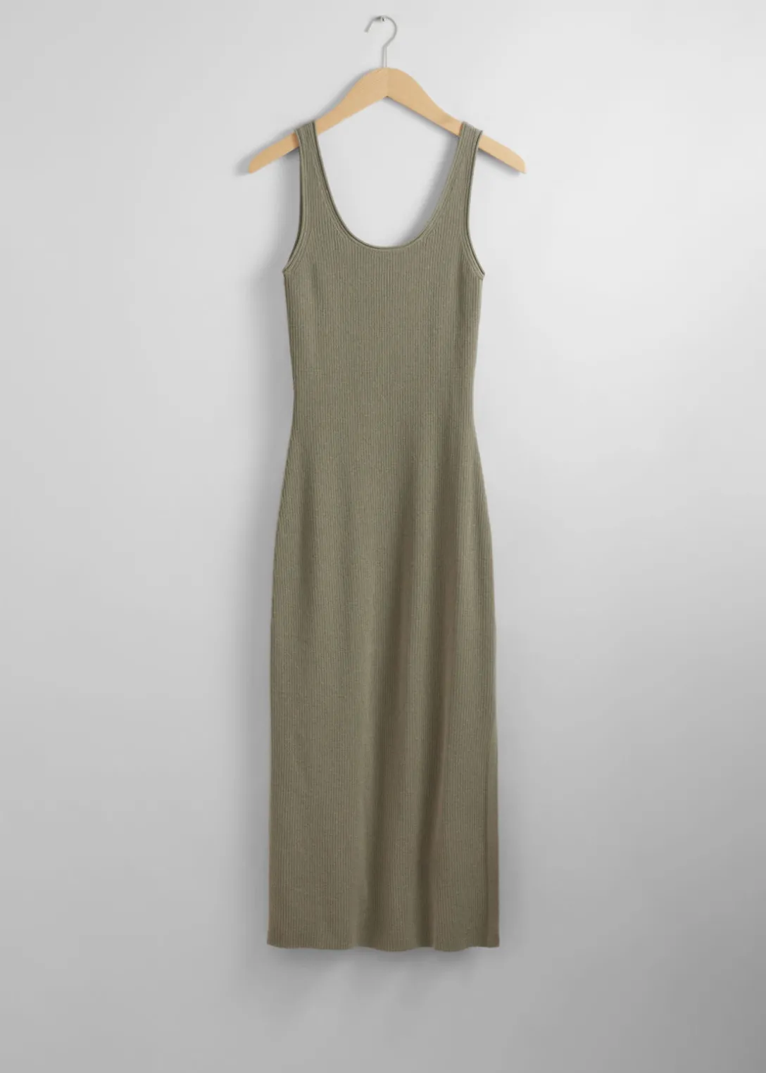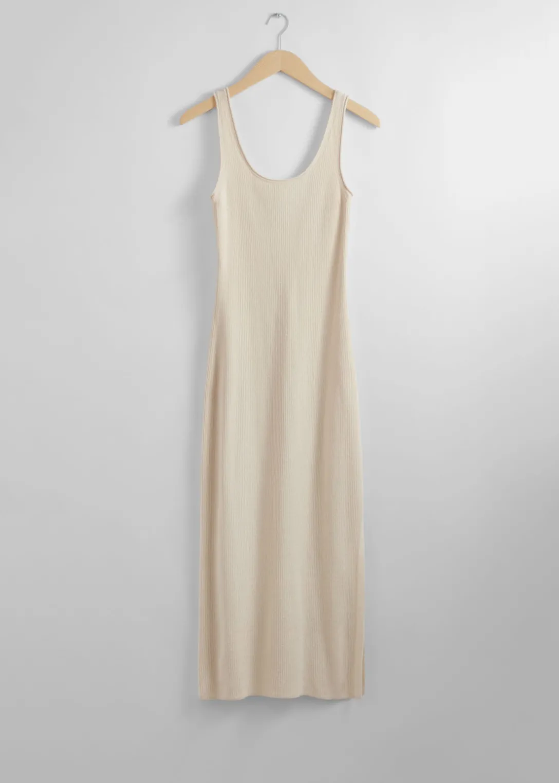 Robe débardeur midi en maille côtelée avec une encolure dégagée et une fente latérale.