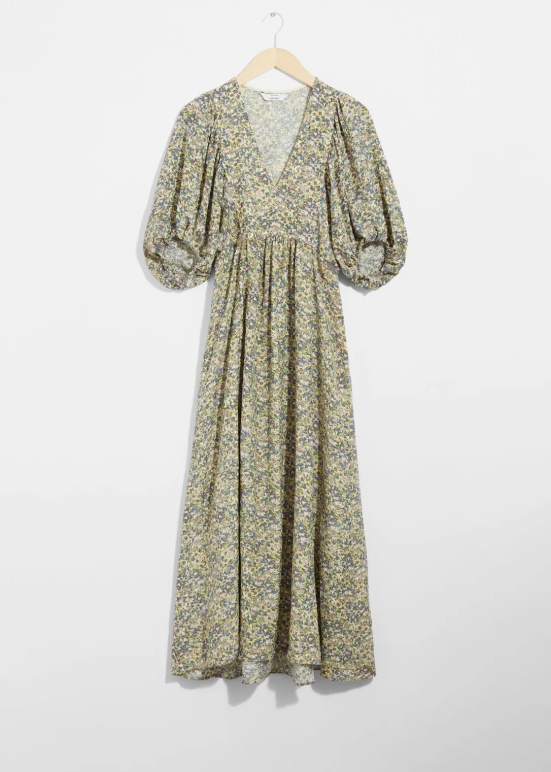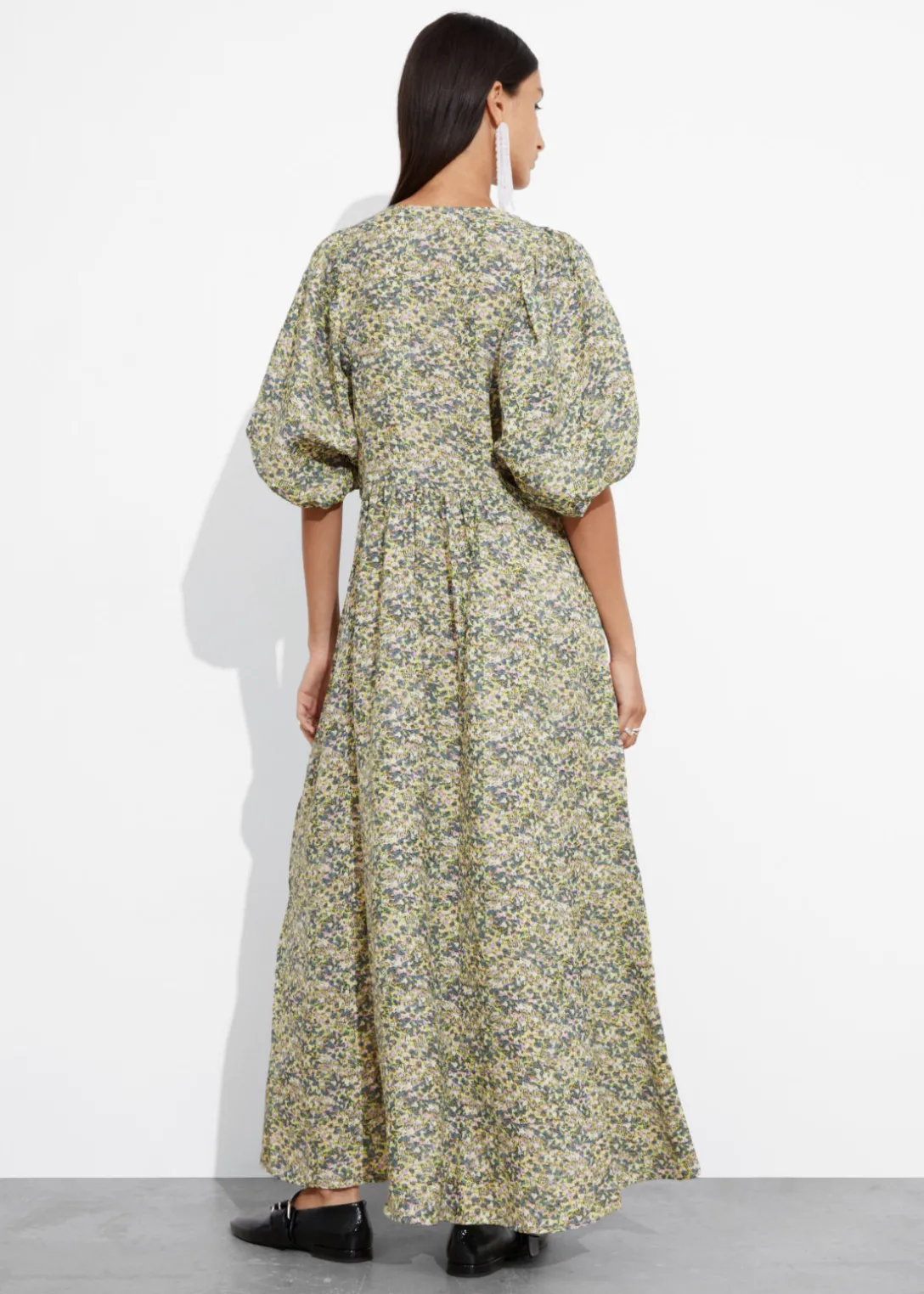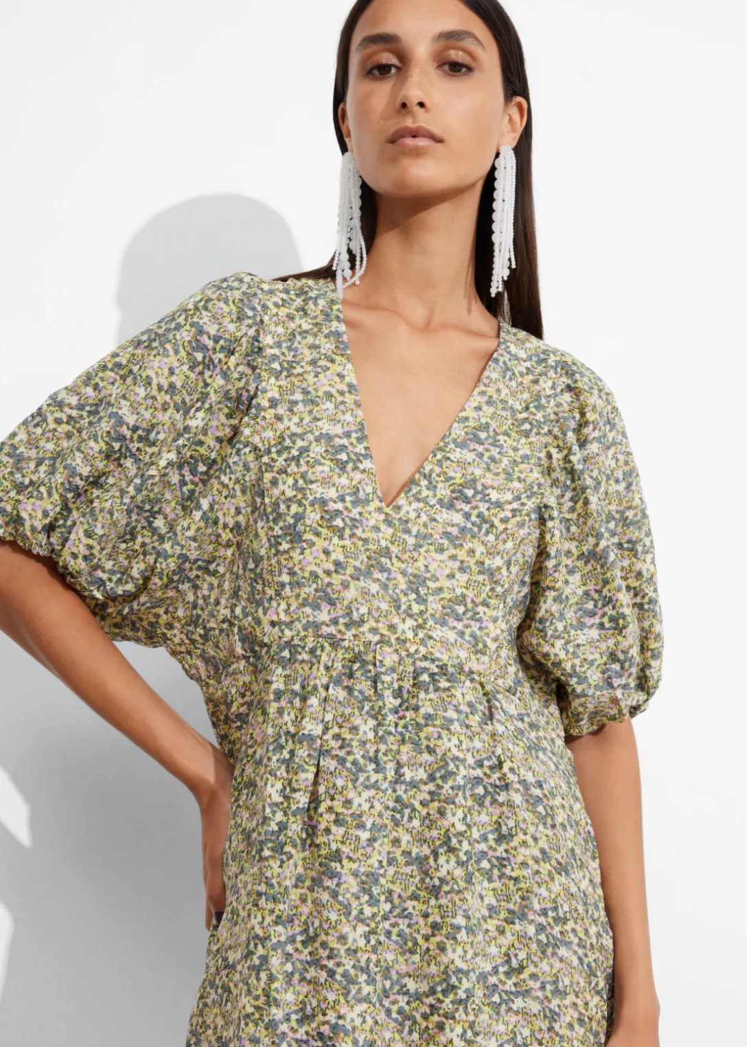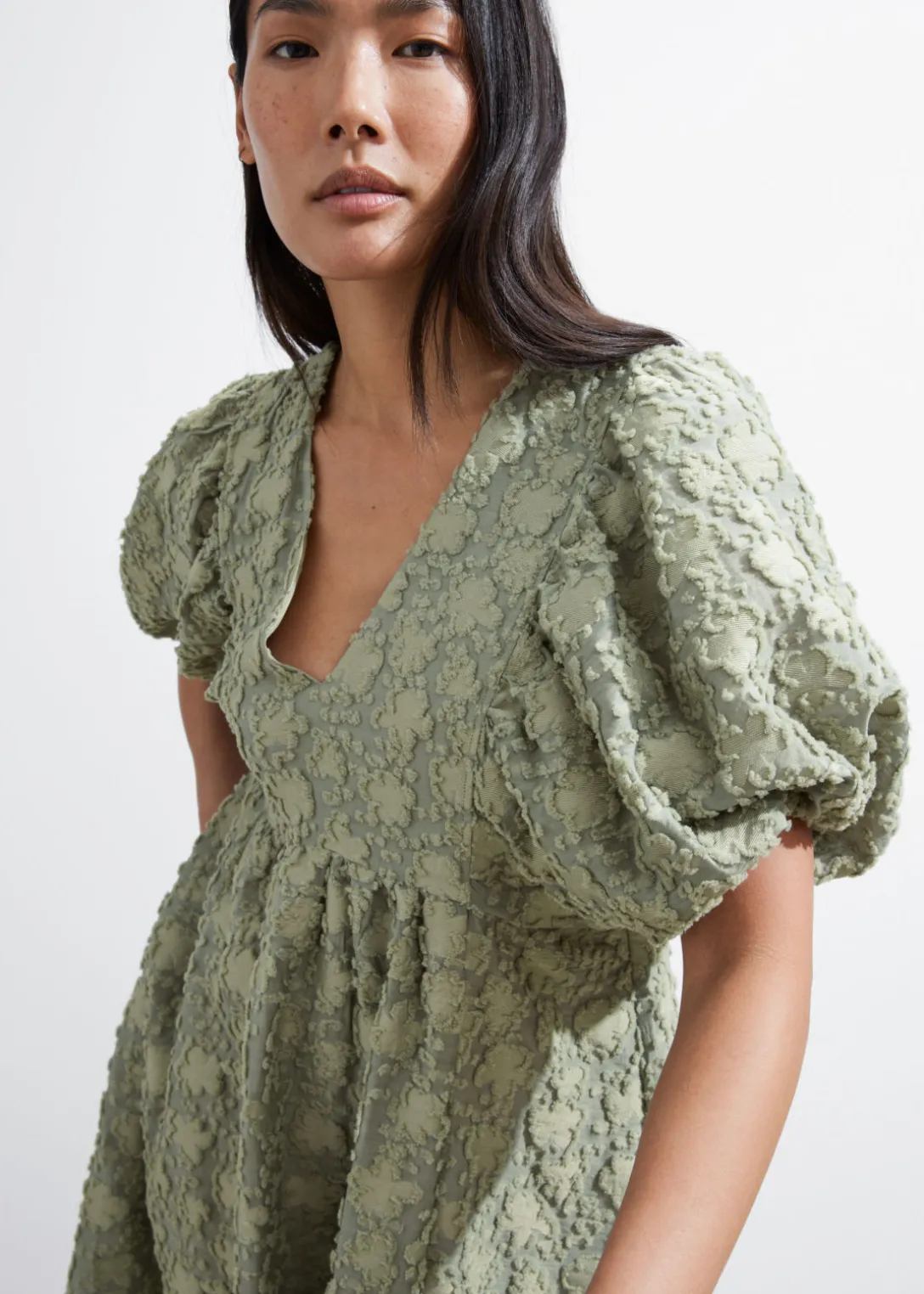 Robe longue avec une finition fleurie texturée. Dotée de manches ballon et d’une encolure en V.