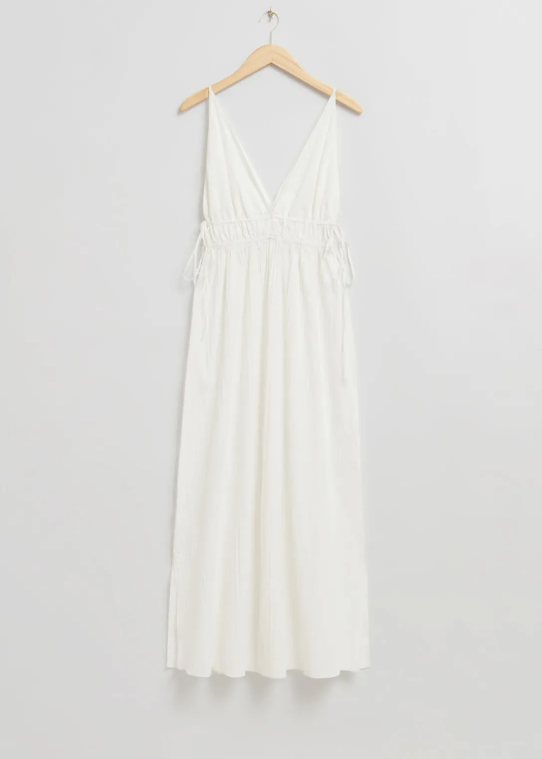 Robe longue sans manches en crêpe de coton tissé aérien. Dotée d’une encolure en V plongeante et de cordons de serrage sous le buste.