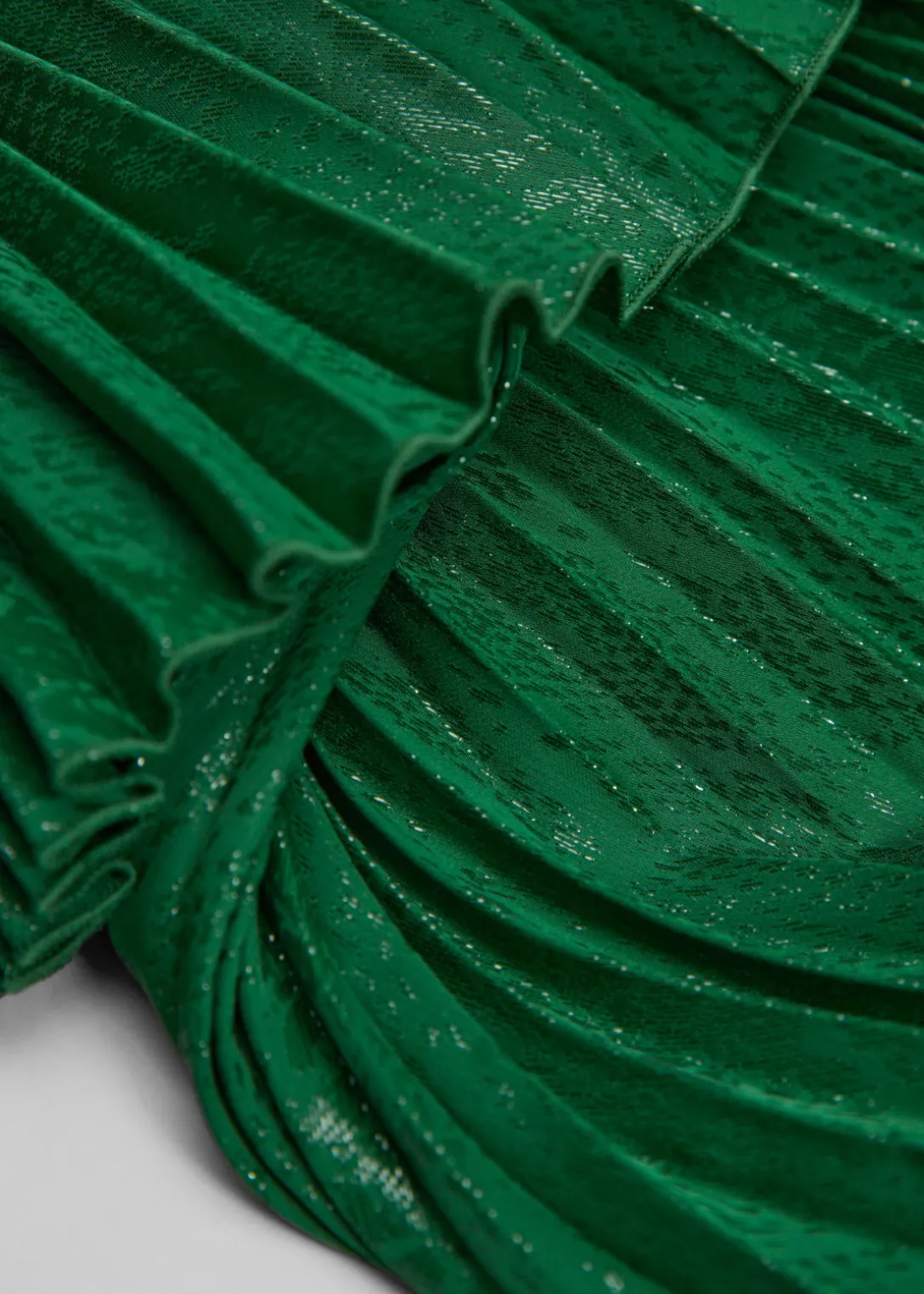 Robe longue décontractée agrémentée d’une finition en lurex plissé et d’un encolure superposée à volant.