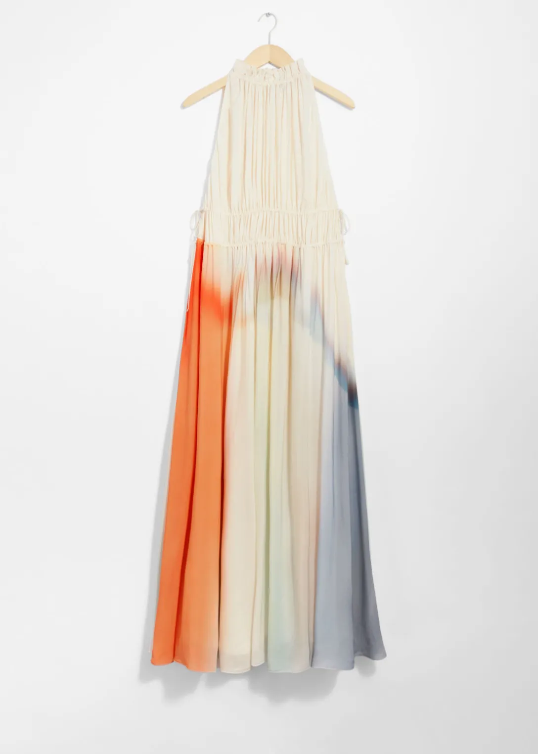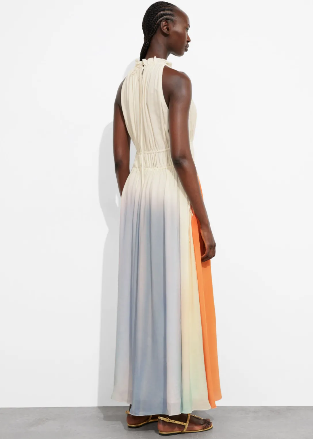 Robe longue sans manches, avec une finition légèrement froncée. Dotée d’une encolure volantée et d’un cordon de serrage à la taille.