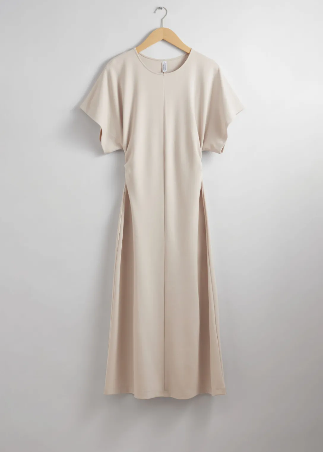 Robe midi avec des manches courtes volantées et une couture verticale apparente devant et derrière.